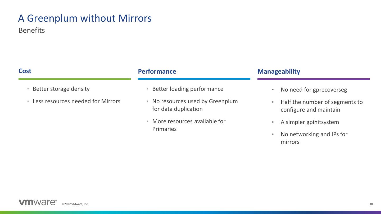 18 .A Greenplum without Mirrors Benefits Cost Performance Manageability • Better storage density • Better loading performance • No need for gprecoverseg • Less resources needed for Mirrors • No resources used by Greenplum • Half the number of segments to for data duplication configure and maintain • More resources available for • A simpler gpinitsystem Primaries • No networking and IPs for mirrors © 2022 VMware, Inc. 18