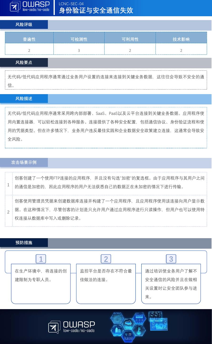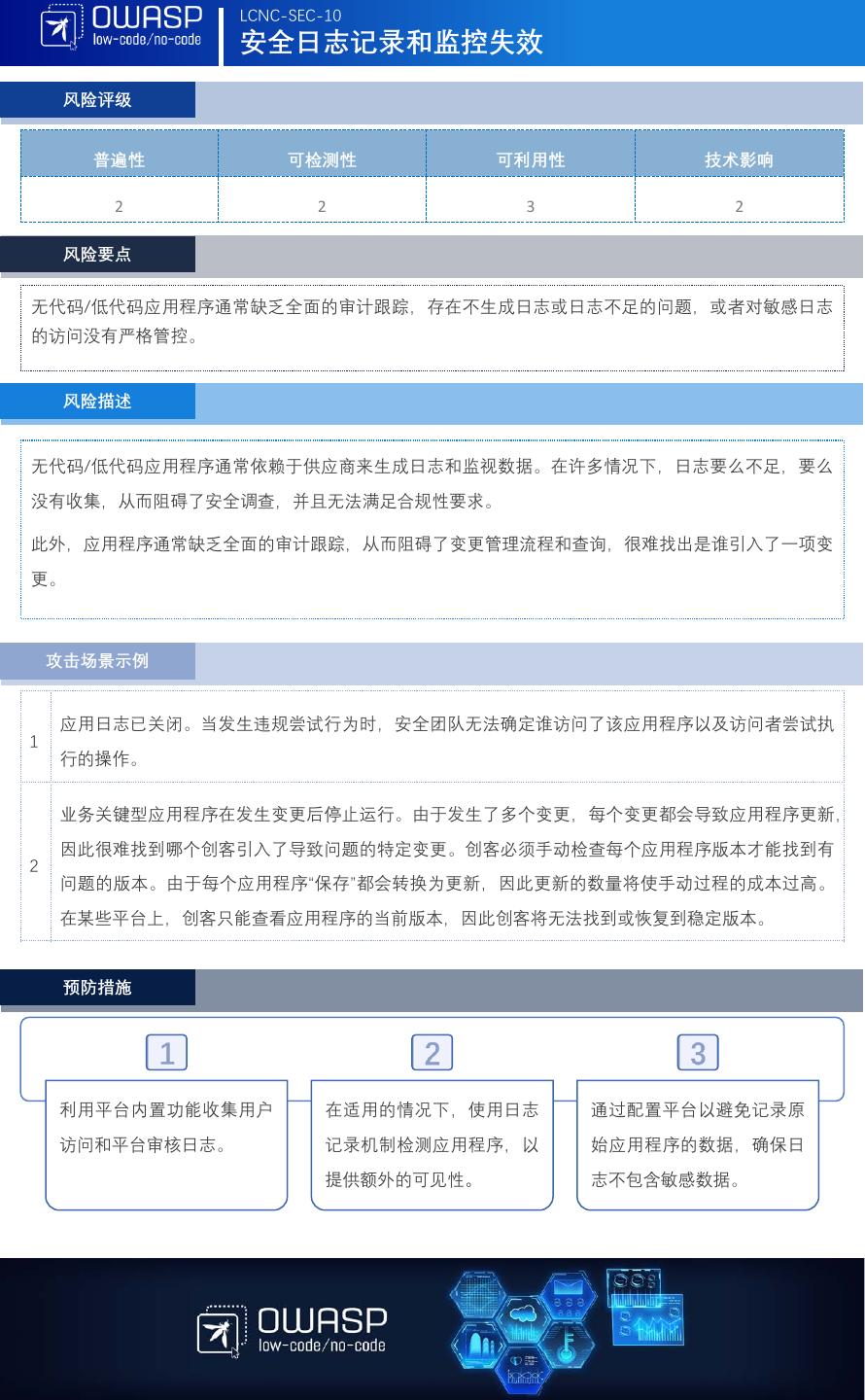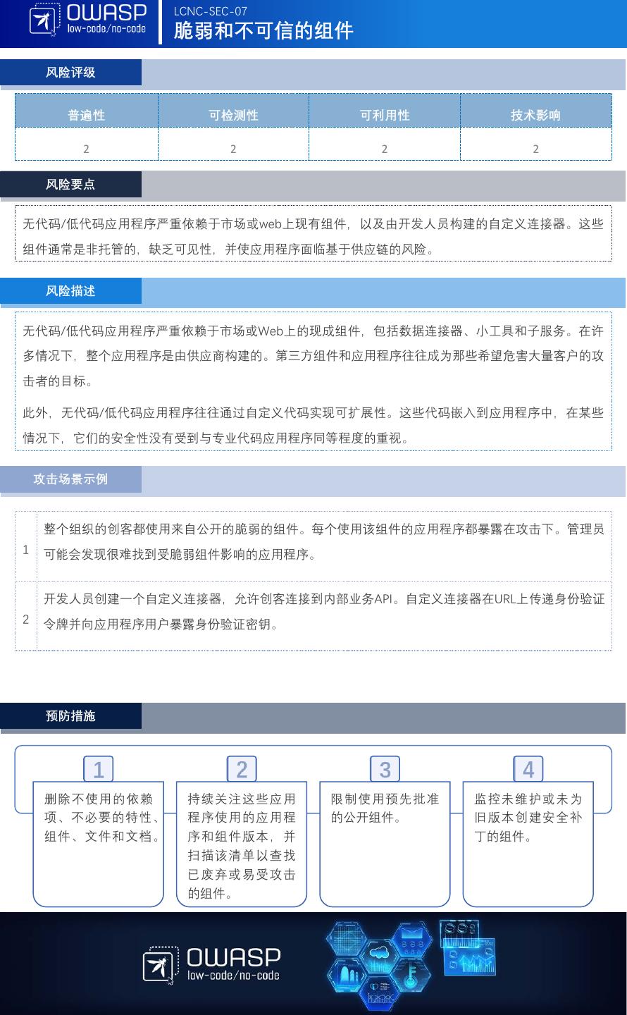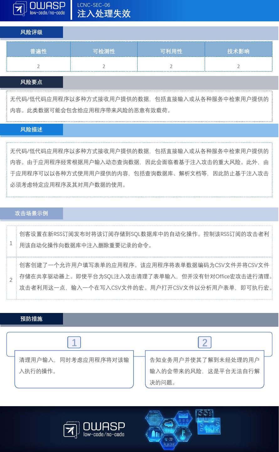 2 . 前言 项目概述 低代码/无代码开发平台提供了一个通过图形用户界面创建应用软件,而不是传统的手工编码计算机程序 的开发环境。这种平台减少了传统手工编码的规模,从而加快了商业应用程序的交付。 随着低代码/无代码开发平台激增以及被组织广泛使用,产业界提出了一个明确而紧迫的需求,即建立依 赖此类平台开发的应用程序相关的安全和隐私风险意识。 “OWASP Top 10 Low-Code/No-Code Security Risks”(简称OWASP 低代码十大安全风险)项目的主要目 标是为希望采用和开发低代码(可视化少量代码开发)、无代码(可视化无需编程开发)应用程序的组织 提供帮助和指导。该指南提供了关于此类应用最突出的十类安全风险、所涉及的挑战以及如何克服这些风 险与挑战的信息。 “OWASP 低代码十大安全风险”项目由Zenity提供支持。该项目中文版由OWASP中国社区翻译发布。 风险清单 LCNC-SEC-01:身份冒充 LCNC-SEC-02:授权滥用 LCNC-SEC-03:数据泄漏和意外后果 LCNC-SEC-04:身份验证和安全通信失效 LCNC-SEC-05:安全配置错误 LCNC-SEC-06:注入处理失效 LCNC-SEC-07:脆弱和不可信的组件 LCNC-SEC-08:数据和密钥处理失效 LCNC-SEC-09:资产管理失效 LCNC-SEC-10:安全日志记录和监控失效 意见建议 欢 迎 您 参 与 项 目 开 发 和 推 广 ! 您 可 以 通 过 Issues · OWASP/www-project-top-10-low-code-no-code- security-risks · GitHub或邮件Michael Bargury至michaelb@zenity.io 提供以下内容,帮助优化完善项目: 提供脆弱性流行趋势数据; 提出改进建议。 有关中文版的意见或建议,可发送邮件至project@owasp.org.cn。 中文项目团队 组 长:肖文棣 副组长:张剑钟 翻 译:郭振新、呼和、黄圣超、刘国强、马伟、任博伦、王厚奎、王强、吴楠、张坤 审 核:王颉、杨文元