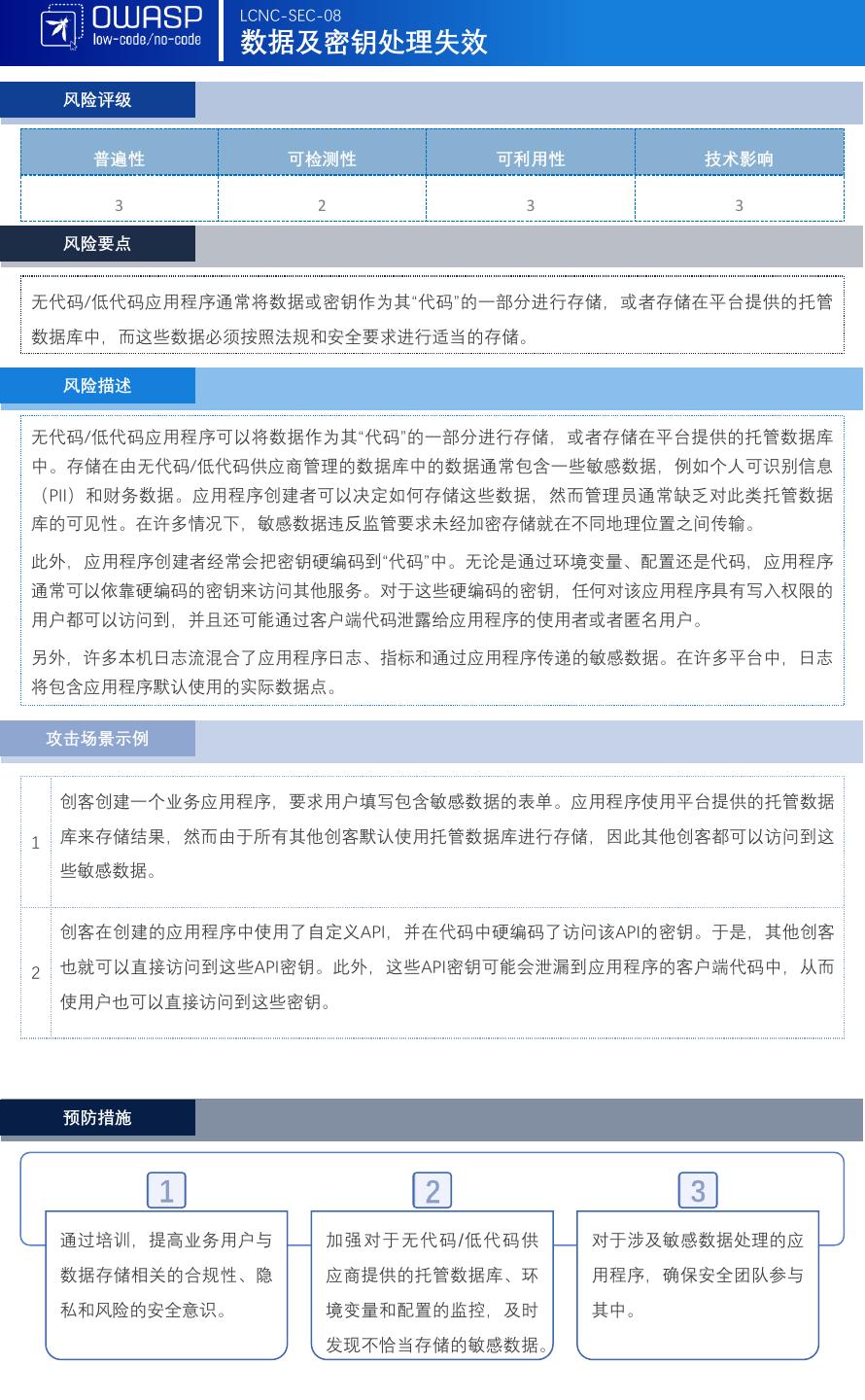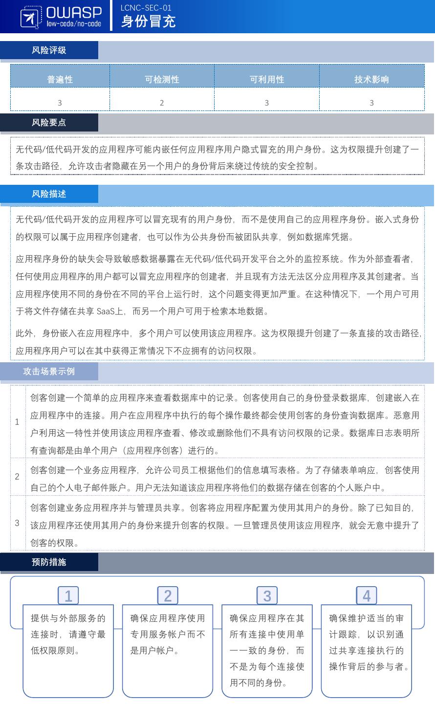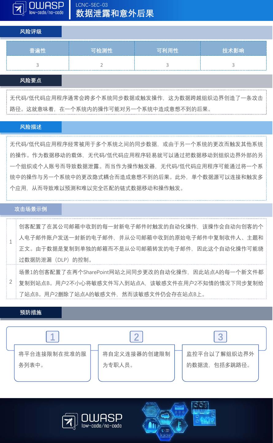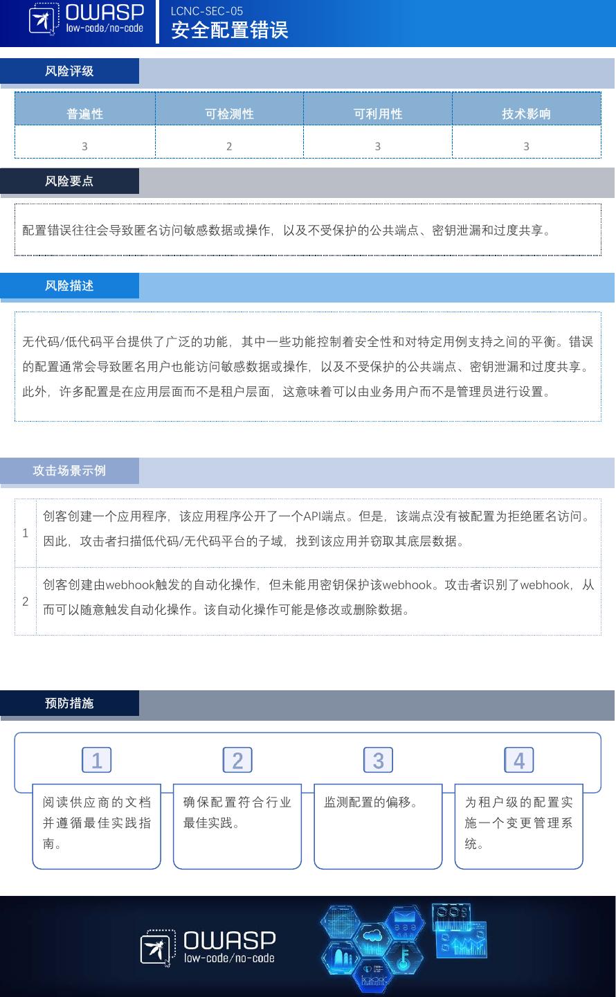 2 . 前言 项目概述 低代码/无代码开发平台提供了一个通过图形用户界面创建应用软件,而不是传统的手工编码计算机程序 的开发环境。这种平台减少了传统手工编码的规模,从而加快了商业应用程序的交付。 随着低代码/无代码开发平台激增以及被组织广泛使用,产业界提出了一个明确而紧迫的需求,即建立依 赖此类平台开发的应用程序相关的安全和隐私风险意识。 “OWASP Top 10 Low-Code/No-Code Security Risks”(简称OWASP 低代码十大安全风险)项目的主要目 标是为希望采用和开发低代码(可视化少量代码开发)、无代码(可视化无需编程开发)应用程序的组织 提供帮助和指导。该指南提供了关于此类应用最突出的十类安全风险、所涉及的挑战以及如何克服这些风 险与挑战的信息。 “OWASP 低代码十大安全风险”项目由Zenity提供支持。该项目中文版由OWASP中国社区翻译发布。 风险清单 LCNC-SEC-01:身份冒充 LCNC-SEC-02:授权滥用 LCNC-SEC-03:数据泄漏和意外后果 LCNC-SEC-04:身份验证和安全通信失效 LCNC-SEC-05:安全配置错误 LCNC-SEC-06:注入处理失效 LCNC-SEC-07:脆弱和不可信的组件 LCNC-SEC-08:数据和密钥处理失效 LCNC-SEC-09:资产管理失效 LCNC-SEC-10:安全日志记录和监控失效 意见建议 欢 迎 您 参 与 项 目 开 发 和 推 广 ! 您 可 以 通 过 Issues · OWASP/www-project-top-10-low-code-no-code- security-risks · GitHub或邮件Michael Bargury至michaelb@zenity.io 提供以下内容,帮助优化完善项目: 提供脆弱性流行趋势数据; 提出改进建议。 有关中文版的意见或建议,可发送邮件至project@owasp.org.cn。 中文项目团队 组 长:肖文棣 副组长:张剑钟 翻 译:郭振新、呼和、黄圣超、刘国强、马伟、任博伦、王厚奎、王强、吴楠、张坤 审 核:王颉、杨文元