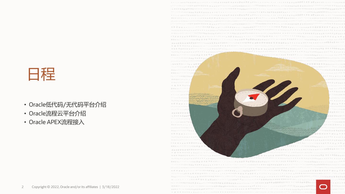 2 . 日程 • Oracle低代码/无代码平台介绍 • Oracle流程云平台介绍 • Oracle APEX流程接入 2 Copyright © 2022, Oracle and/or its affiliates | 3/18/2022