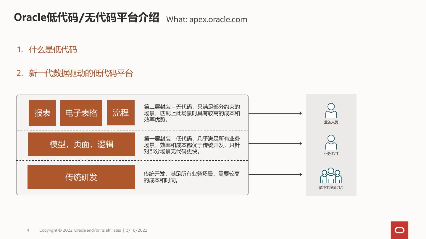 3 .低代码应用开发 “你获得程序生产力的方法不是通过增加每个程序员每天的代 码量。这是行不通的。 你获得生产力的方法是减少你要编程的代码量。” 而且要编写速度最快、永不宕机、不需要维护代码 Steve Jobs WWDC ’97 https://www.youtube.com/watch?v=3LEXae1j6EY#t=41m26s 3 Copyright © 2022, Oracle and/or its affiliates | 3/18/2022