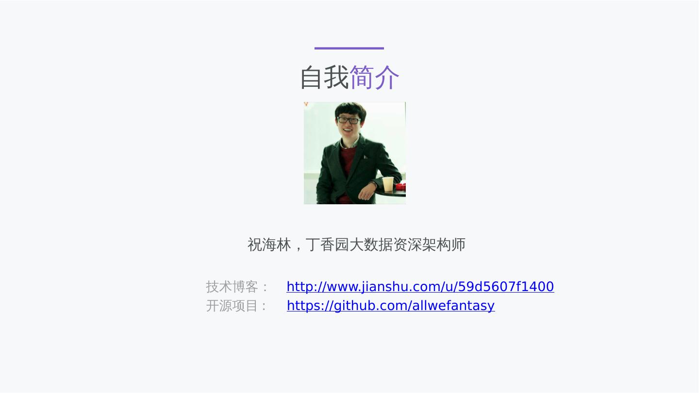 2 .自我 简介 祝海林,丁香园大数据资深架构师 技术博客: http://www.jianshu.com/u/59d5607f1400 开源项目: https://github.com/allwefantasy