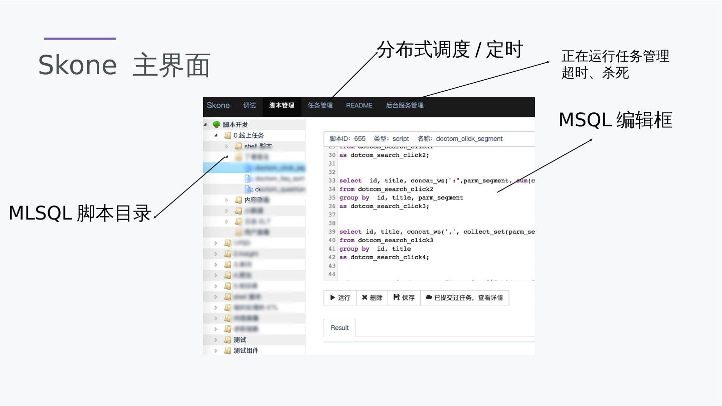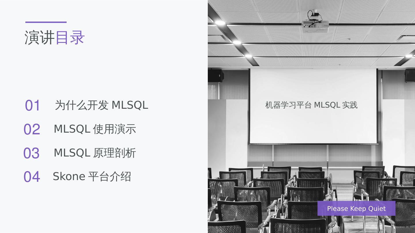 3 .演讲 目录 为什么开发MLSQL 01 MLSQL使用演示 02 Skone平台介绍 04 Please Keep Quiet 机器学习平台MLSQL实践 MLSQL原理剖析 03