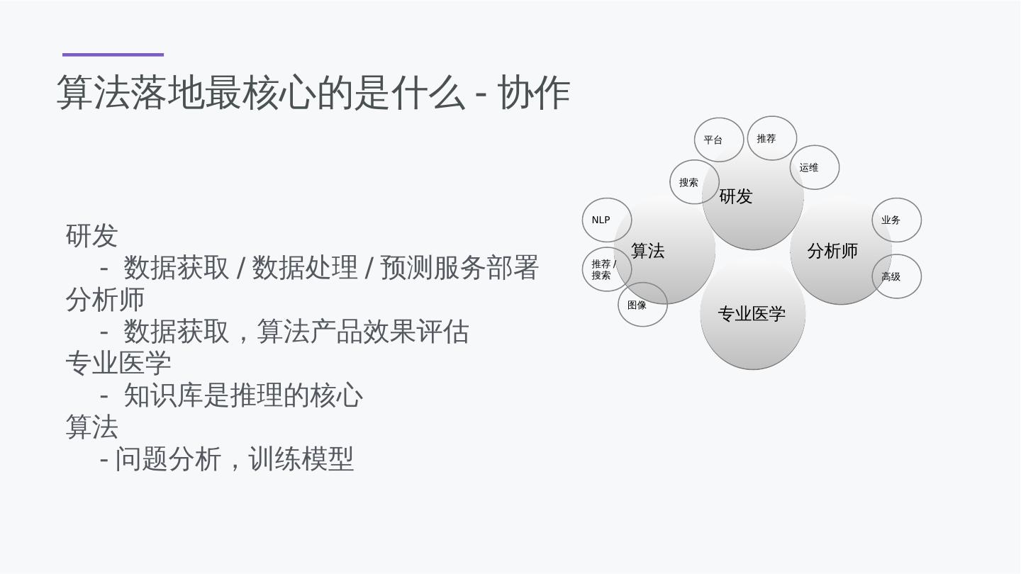 5 .算法落地最核心的是什么-协作 研发 - 数据获取/数据处理/预测服务部署 分析师 - 数据获取,算法产品效果评估 专业医学 - 知识库是推理的核心 算法 -问题分析,训练模型 研发 算法 分析师 专业医学 搜索 平台 推荐 NLP 推荐/搜索 图像 业务 高级 运维