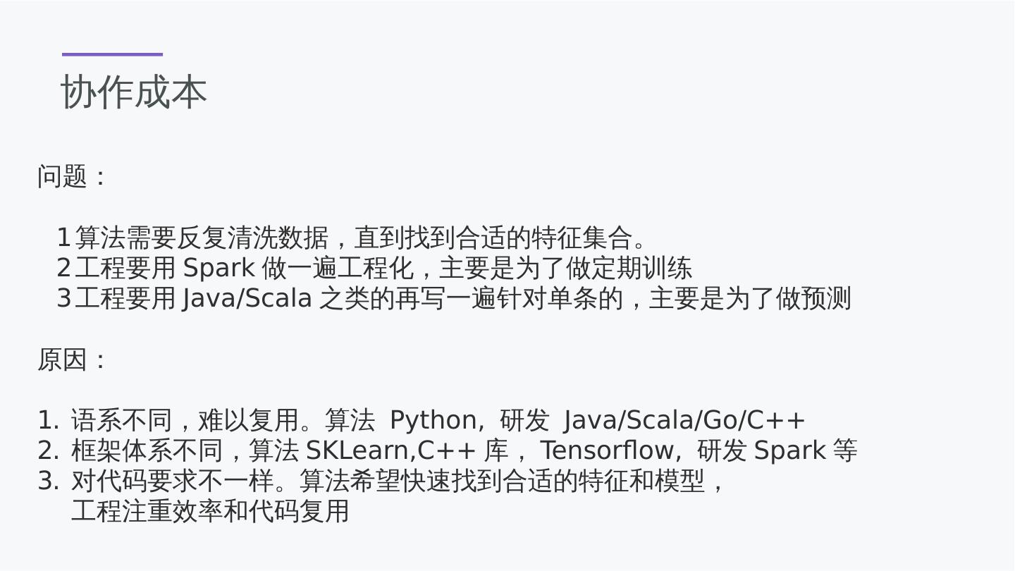 6 .协作成本 问题: 1 算法需要反复清洗数据,直到找到合适的特征集合。 2 工程要用Spark做一遍工程化,主要是为了做定期训练 3 工程要用Java/Scala之类的再写一遍针对单条的,主要是为了做预测 原因: 语系不同,难以复用。算法 Python, 研发 Java/Scala/Go/C++ 框架体系不同,算法SKLearn,C++库,Tensorflow, 研发Spark等 对代码要求不一样。算法希望快速找到合适的特征和模型, 工程注重效率和代码复用