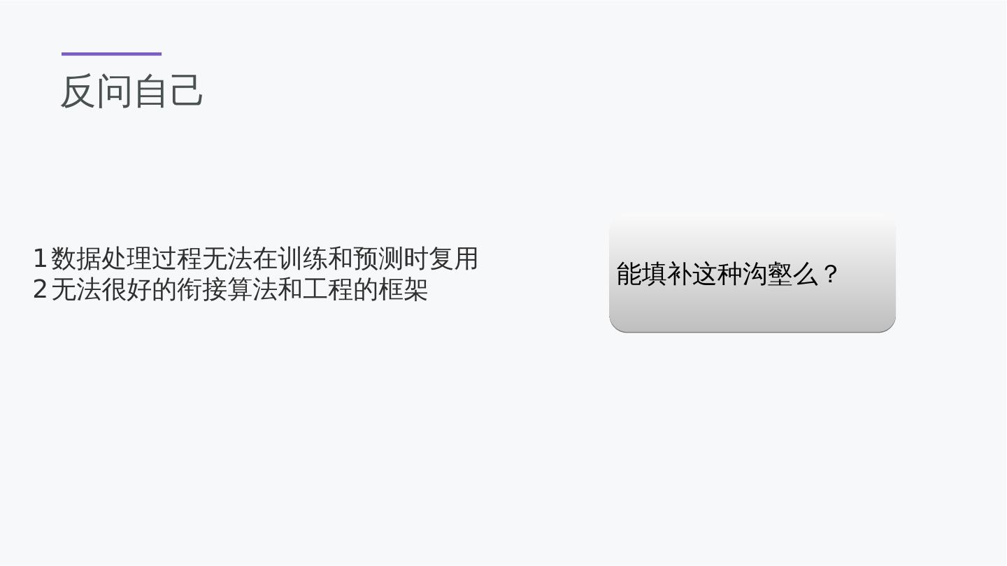 7 .反问自己 能填补这种沟壑么? 1 数据处理过程无法在训练和预测时复用 2 无法很好的衔接算法和工程的框架