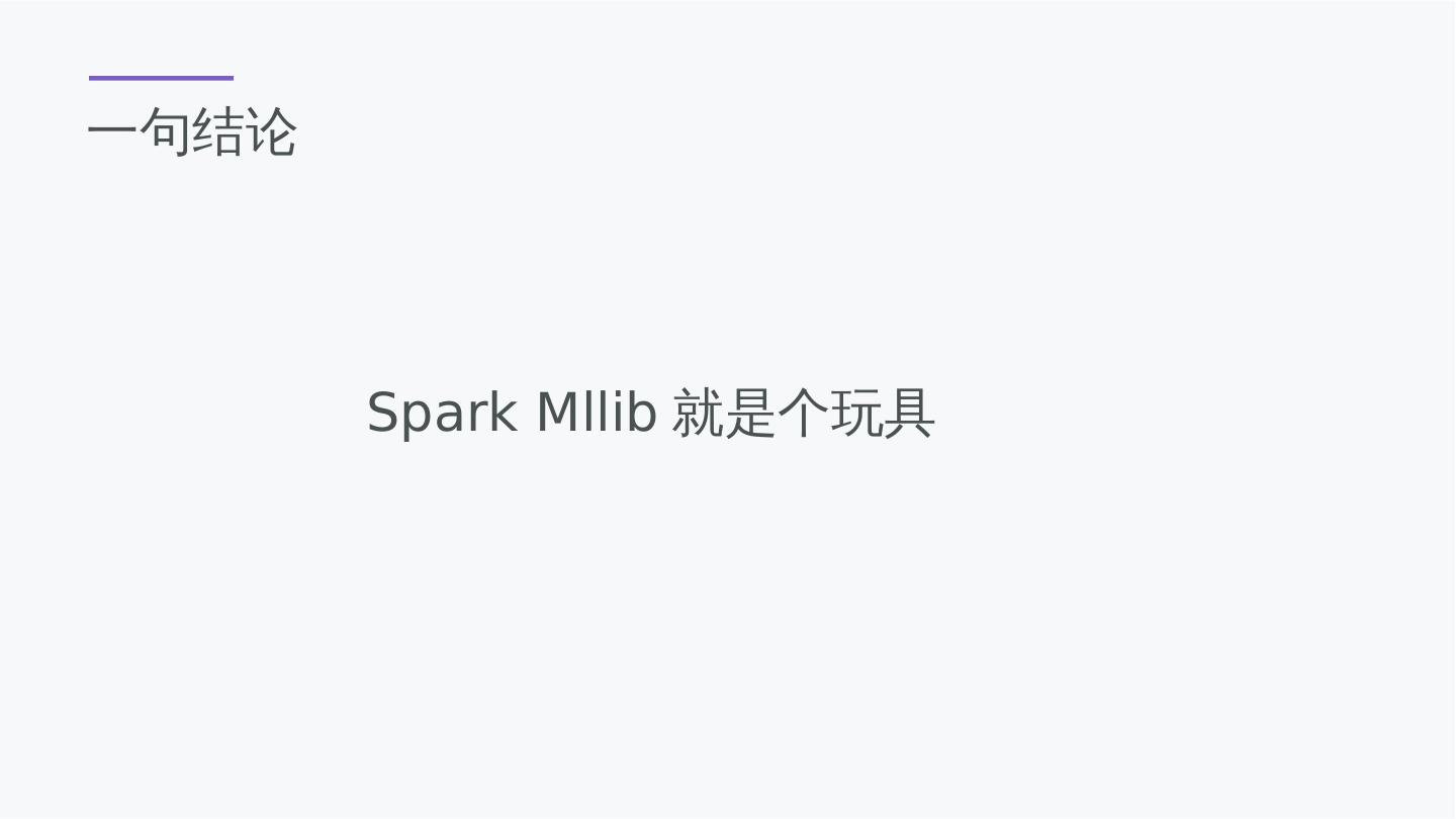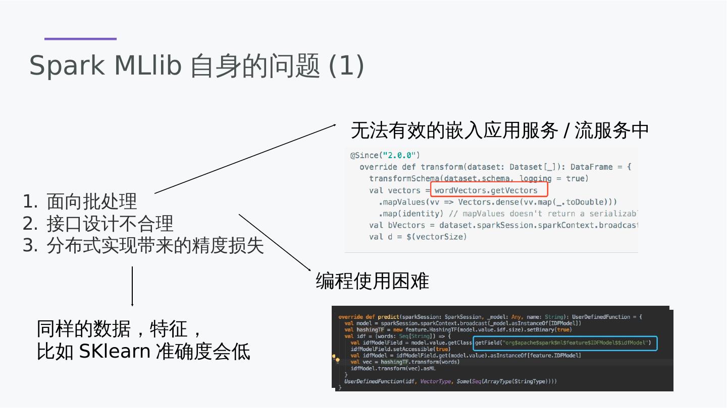 12 .Spark MLlib自身的问题(1) 面向批处理 接口设计不合理 分布式实现带来的精度损失 无法有效的嵌入应用服务/流服务中 编程使用困难 同样的数据,特征, 比如SKlearn准确度会低