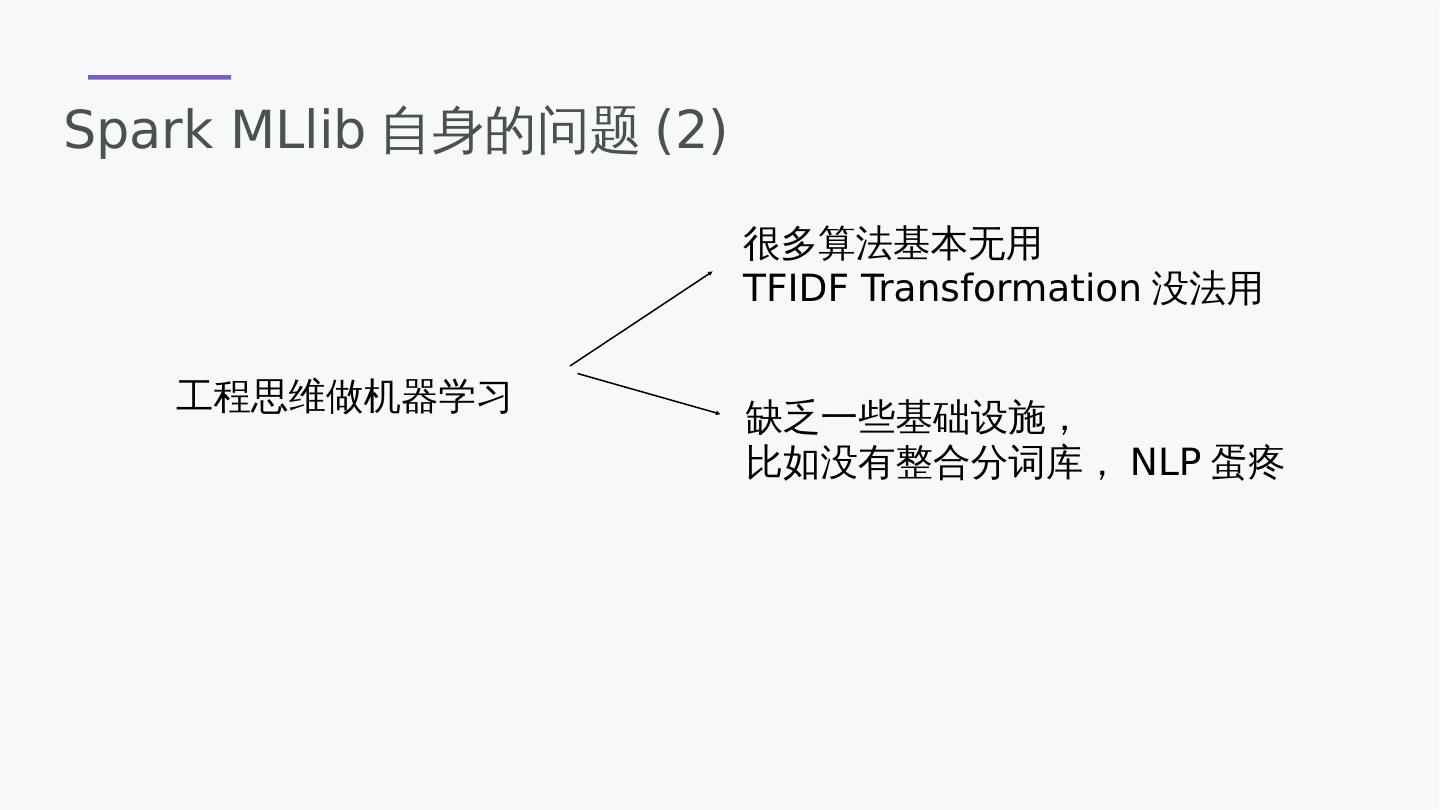 13 .Spark MLlib自身的问题(2) 工程思维做机器学习 很多算法基本无用 TFIDF Transformation没法用 缺乏一些基础设施, 比如没有整合分词库,NLP蛋疼