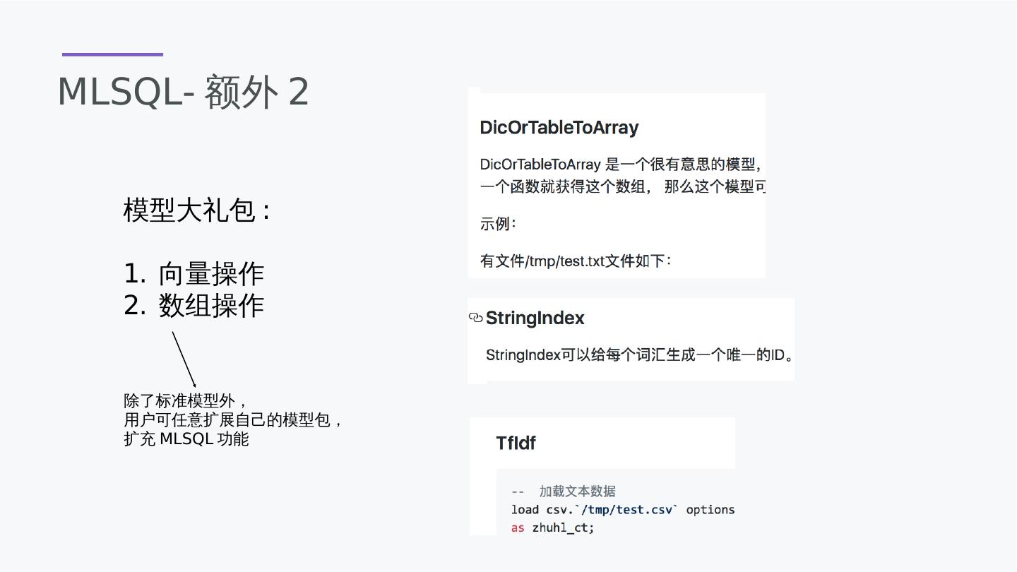 18 .MLSQL-额外2 模型大礼包: 向量操作 数组操作 除了标准模型外, 用户可任意扩展自己的模型包, 扩充MLSQL功能