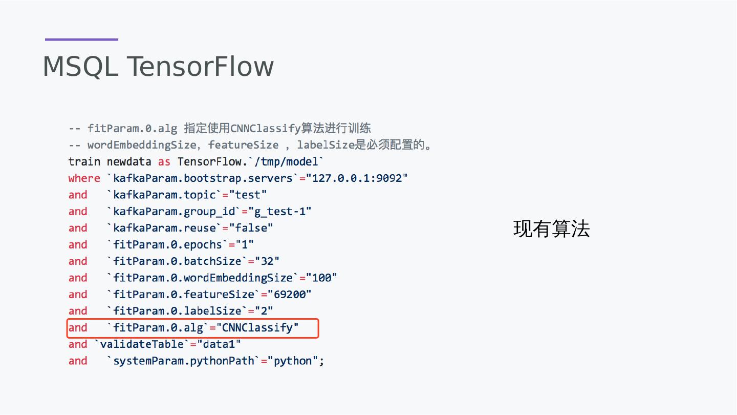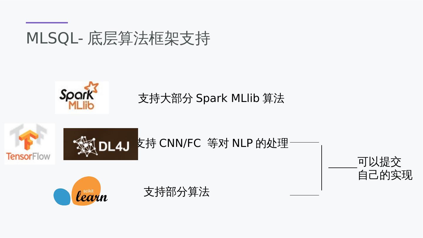 19 .MLSQL-底层算法框架支持 支持大部分Spark MLlib算法 支持CNN/FC 等对NLP的处理 支持部分算法 可以提交 自己的实现