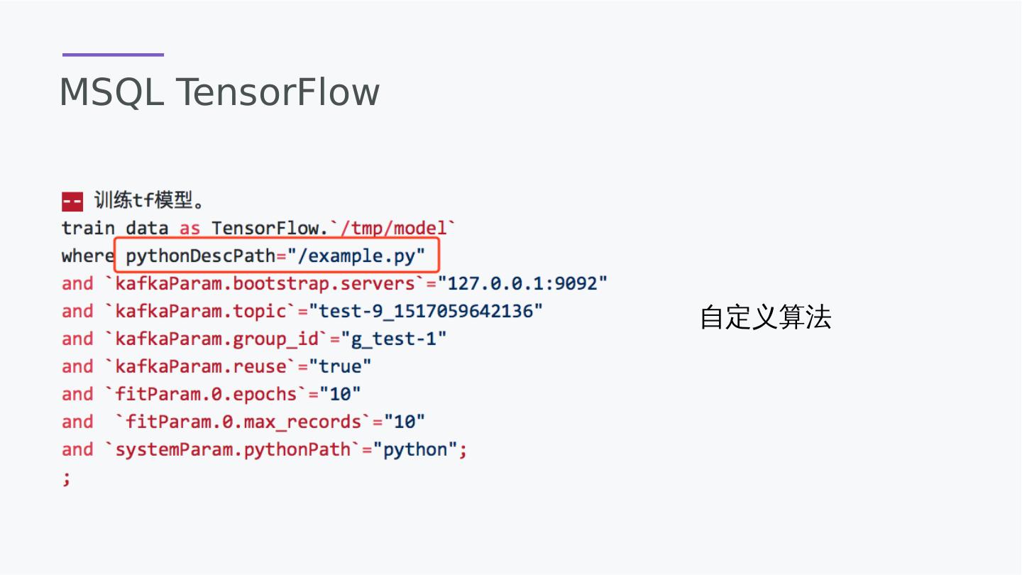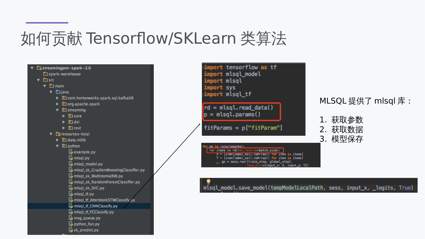 29 .如何贡献Tensorflow/SKLearn类算法 MLSQL提供了mlsql库: 1. 获取参数 2. 获取数据 3. 模型保存
