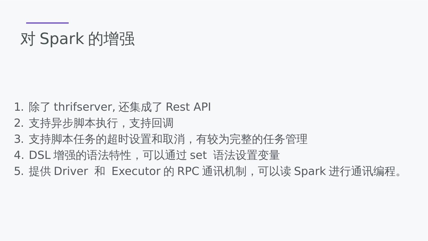 26 .对Spark的增强 除了thrifserver,还集成了Rest API 支持异步脚本执行,支持回调 支持脚本任务的超时设置和取消,有较为完整的任务管理 DSL增强的语法特性,可以通过set 语法设置变量 提供Driver 和 Executor的RPC通讯机制,可以读Spark进行通讯编程。