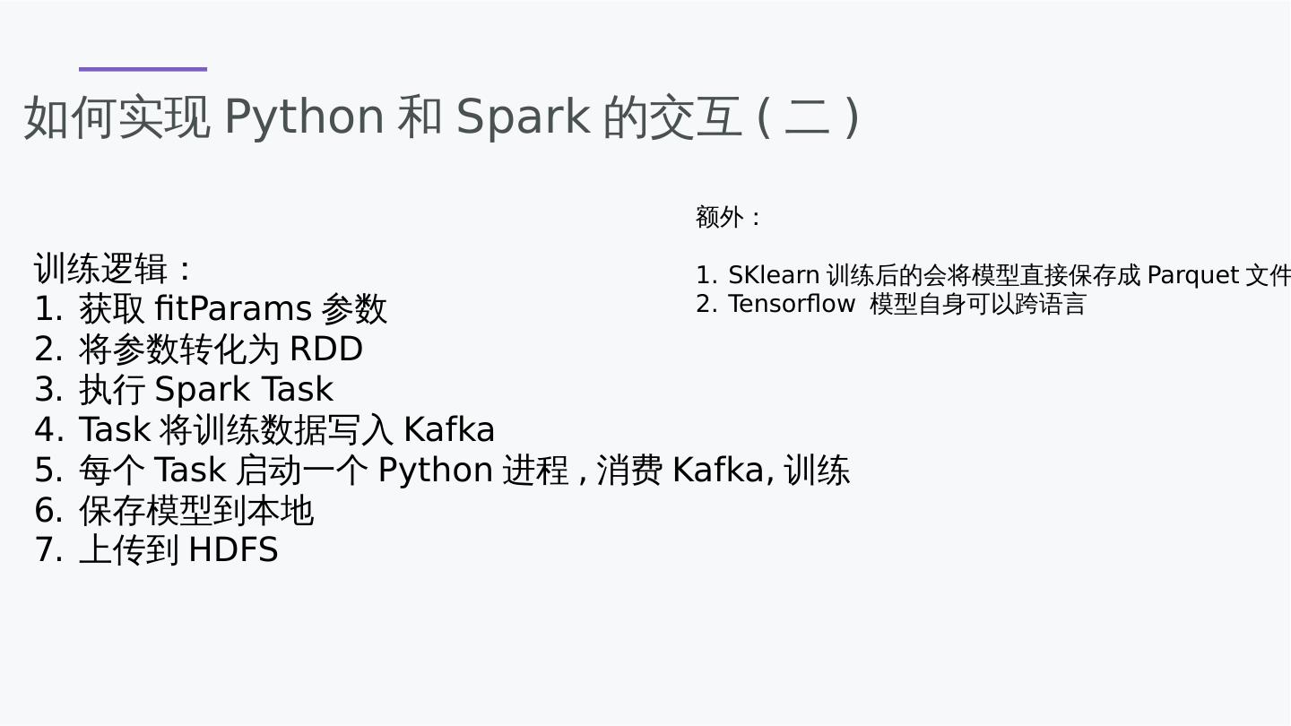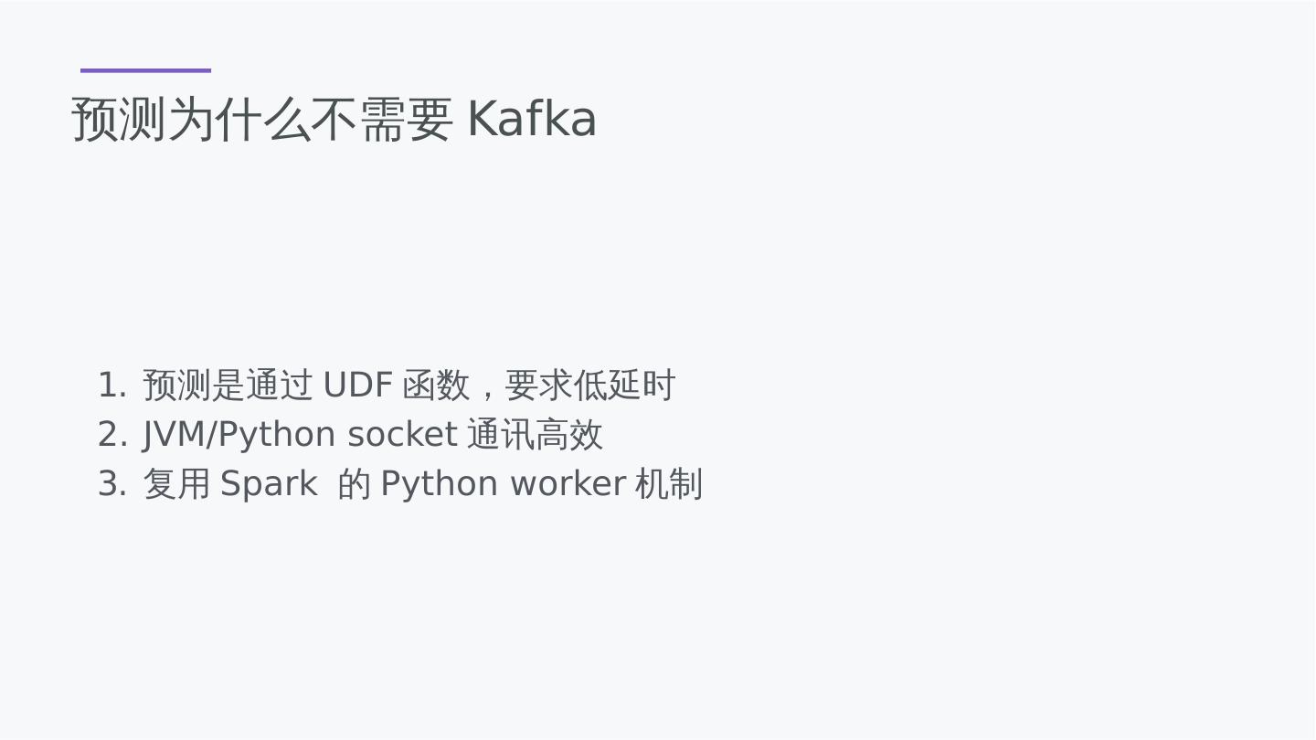 28 .预测为什么不需要Kafka 预测是通过UDF函数,要求低延时 JVM/Python socket通讯高效 复用Spark 的Python worker机制