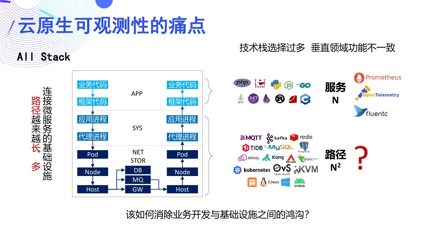 4 .云原生可观测性的痛点 技术栈选择过多 垂直领域功能不一致 All Stack 业务代码 连 APP 业务代码 服务 路接 框架代码 框架代码 N 径微 越服 应用进程 应用进程 来务 SYS 越的 代理进程 代理进程 kafka 长基 、础 多设 施 Pod Node NET STOR DB MQ Pod Node 路径 N2 ? Host GW Host 该如何消除业务开发与基础设施之间的鸿沟?