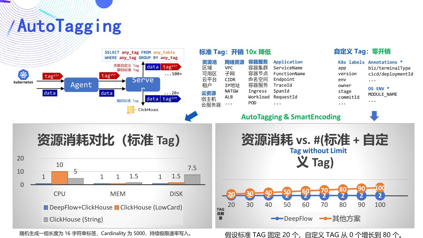 19 .AutoTagging SELECT any_tag FROM any_table 标准 Tag:开销 10x 降低 自定义 Tag:零开销 WHERE any_tag GROUP BY any_tag 资源池 网络资源 容器服务 Application K8s labels Annotations * 关联自定义 Tag data tagstr 解码标准 Tag VPC ServiceName app biz/terminalType tagstr ...100+ FunctionName version cicd/deploymentId tagstr Serve CIDR Endpoint env ... Agent IP TraceId owner data data r ...20+ 云资源 NATGW Ingress SpanId stage OS ENV * MODULE_NAME data tagint ALB Workload RequestId commitId 编码标准 Tag ... ... POD ... ... AutoTagging & SmartEncoding 资源消耗对比(标准 Tag) 资源消耗 vs. #(标准 + 自定 Tag without Limit 20 10 7.5 义 Tag) 10 5 1 1 1 1.5 1 1.5 10x 0 降 100 低 50 607.5x 70 80 90 CPU MEM DISK 20 2 30 2 40 2 2 2降 2 2 2 2 DeepFlow+ClickHouse ClickHouse (LowCard) 20 30 40 50 60低 70 80 90 100 TAG 总数 ClickHouse (String) 量 DeepFlow 其他方案 随机生成一组长度为 16 字符串标签,Cardinality 为 5000,持续极限速率写入。 假设标准 TAG 固定 20 个,自定义 TAG 从 0 个增长到 80 个。