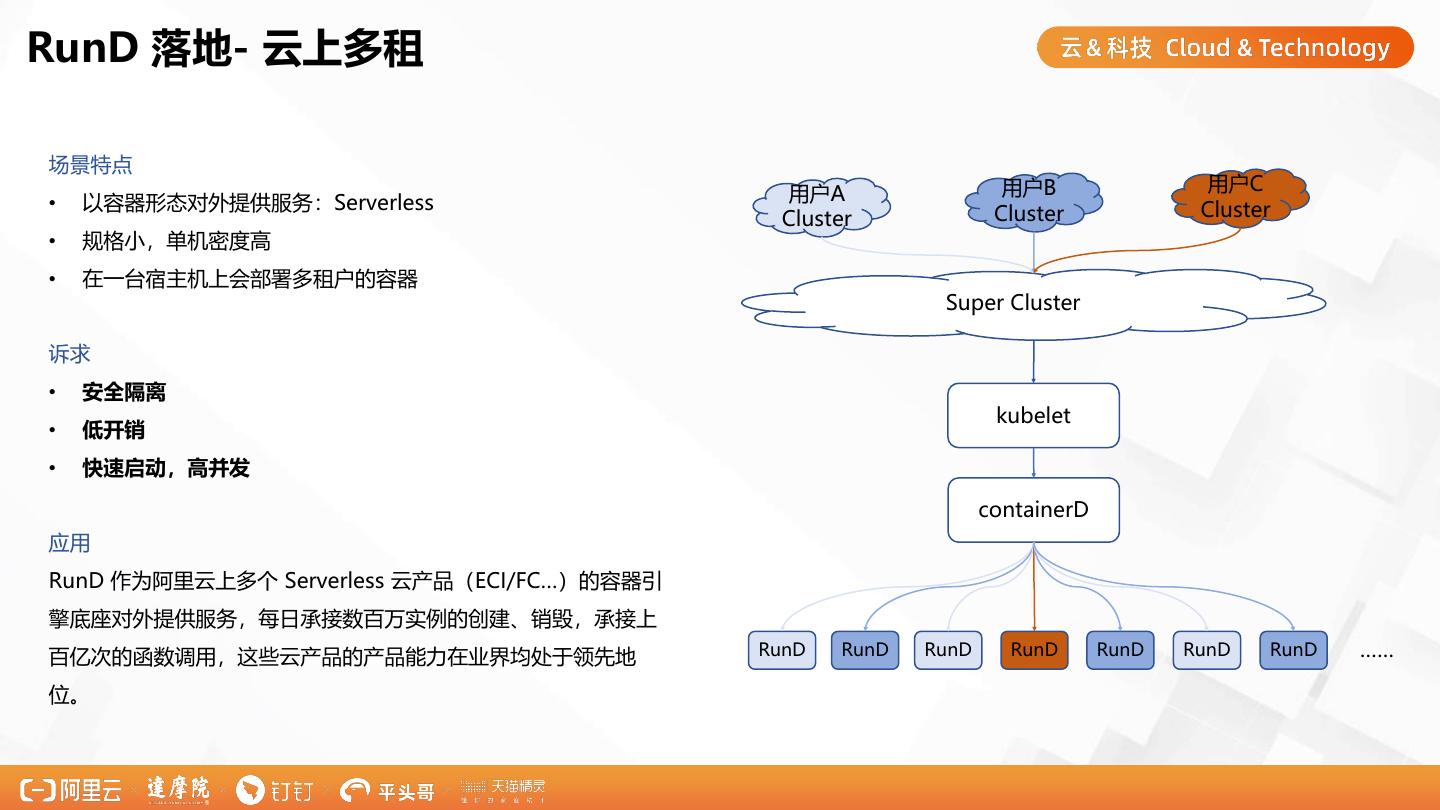 6 .RunD 落地- 云上多租 场景特点 用户A 用户B 用户C • 以容器形态对外提供服务:Serverless Cluster Cluster Cluster • 规格小,单机密度高 • 在一台宿主机上会部署多租户的容器 Super Cluster 诉求 • 安全隔离 kubelet • 低开销 • 快速启动,高并发 containerD 应用 RunD 作为阿里云上多个 Serverless 云产品(ECI/FC…)的容器引 擎底座对外提供服务,每日承接数百万实例的创建、销毁,承接上 百亿次的函数调用,这些云产品的产品能力在业界均处于领先地 RunD RunD RunD RunD RunD RunD RunD …… 位。