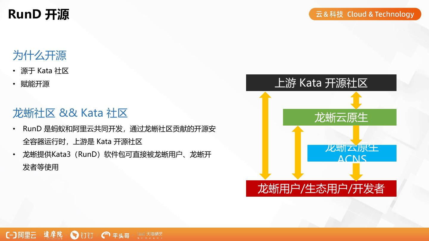 16 . 如何体验Kata3(RunD) – 开源源码 上游:开源版本 Kata Container 3.x 2022.10.10 Kata 3.0.0 正式发布,其中包含了RunD的rust runtime和Dragonball VMM两大核心组件。 Rust runtime(runtime-rs) 路径: https://github.com/kata-containers/kata-containers/tree/main/src/runtime-rs Dragonball 路径: https://github.com/kata-containers/kata-containers/tree/main/src/dragonball 设计文档:https://github.com/kata-containers/kata-containers/tree/main/docs/design/architecture_3.0 安装文档:https://github.com/kata-containers/kata-containers/blob/main/docs/install/kata-containers-3.0-rust-runtime-installation-guide.m