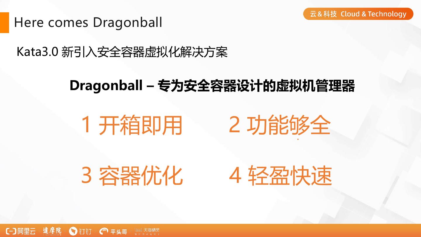 11 .Here comes Dragonball Kata3.0 新引入安全容器虚拟化解决方案 Dragonball – 专为安全容器设计的虚拟机管理器 1 开箱即用 2 功能够全 · 3 容器优化 4 轻盈快速