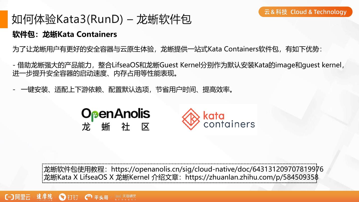 18 .如何体验Kata3(RunD) – 龙蜥软件包 软件包:龙蜥Kata Containers 为了让龙蜥用户有更好的安全容器与云原生体验,龙蜥提供一站式Kata Containers软件包,有如下优势: - 借助龙蜥强大的产品能力,整合LifseaOS和龙蜥Guest Kernel分别作为默认安装Kata的image和guest kernel, 进一步提升安全容器的启动速度、内存占用等性能表现。 - 一键安装、适配上下游依赖、配置默认选项,节省用户时间、提高效率。 龙蜥软件包使用教程:https://openanolis.cn/sig/cloud-native/doc/643131209707819976 龙蜥Kata X LifseaOS X 龙蜥Kernel 介绍文章:https://zhuanlan.zhihu.com/p/584509358