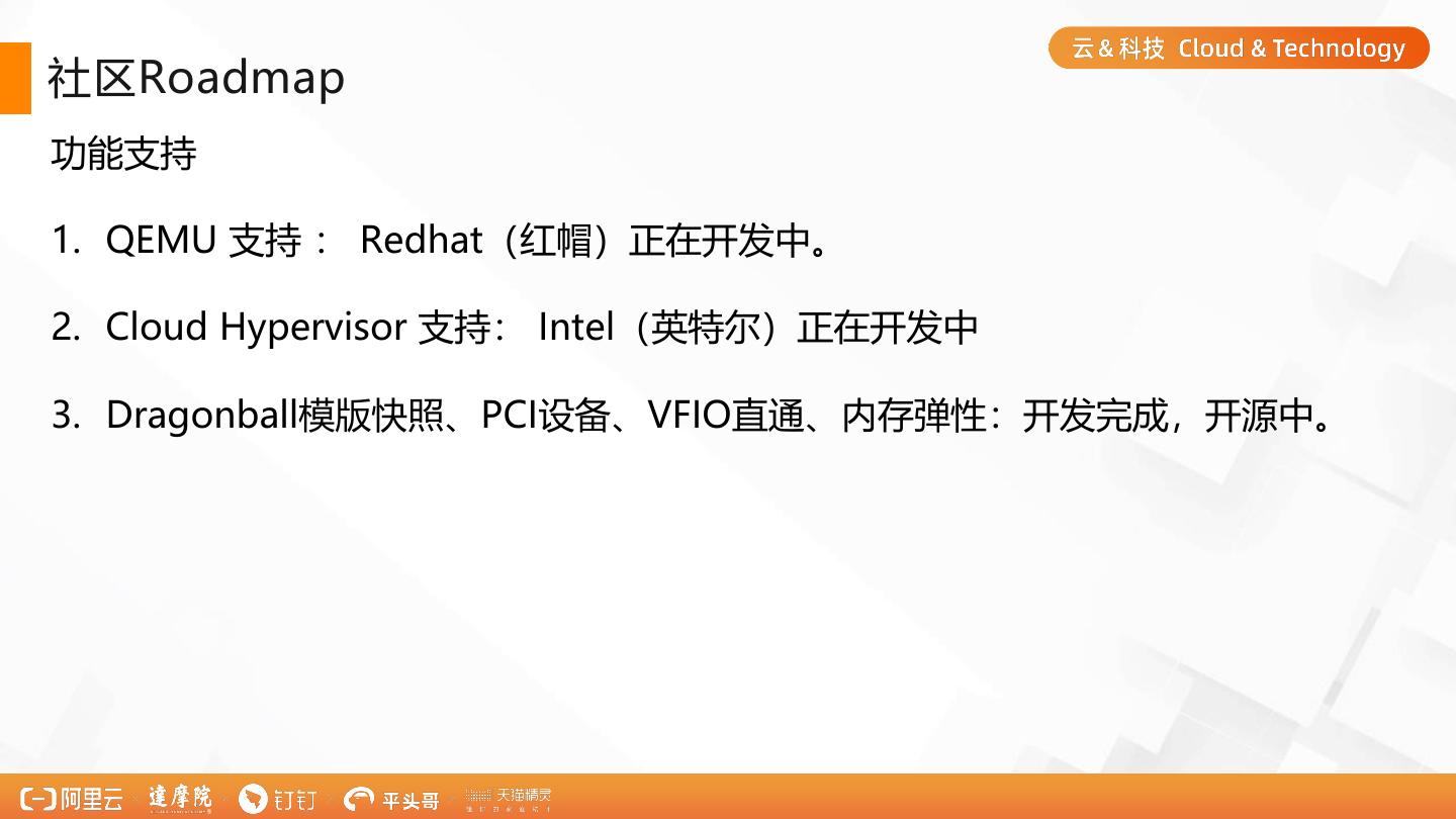 20 .社区Roadmap 功能支持 1. QEMU 支持 : Redhat(红帽)正在开发中。 2. Cloud Hypervisor 支持: Intel(英特尔)正在开发中 3. Dragonball模版快照、PCI设备、VFIO直通、内存弹性:开发完成,开源中。