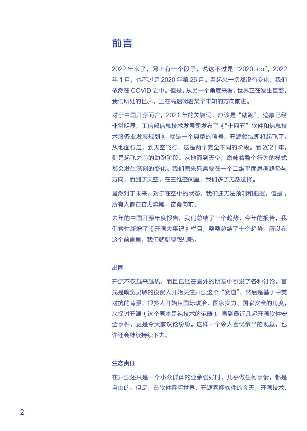 2022 年来了,网上有一个段子,说这不过是“2020 too”,2022 年 1 月,也不过是 2020 年第 25 月。看起来一切都没有变化,我们 依然在 COVID 之中。但是,从另一个角度来看,世界正在发生巨变, 我们所处的世界,正在高速朝着某个未知的方向前进。 对于中国开源而言,2021 年的关键词,应该是“助跑”。迹象已经 非常明显,工信部信息技术发展司发布了《“十四五”软件和信息技 术服务业发展规划》,就是一个典型的信号,开源领域即将起飞了。 从地面行走,到天空飞行,这是两个完全不同的阶段。而 2021 年, 则是起飞之前的助跑阶段。从地面到天空,意味着整个行为的模式 都会发生深刻的变化。我们原来只需要在一个二维平面思考路径与 方向,而到了天空,在三维空间里,我们多了无数选择。 虽然对于未来,对于在空中的状态,我们还无法预测和把握,但是 : 所有人都在奋力奔跑,奋勇向前。 去年的中国开源年度报告,我们总结了三个趋势,今年的报告,我 们索性新增了《开源大事记》栏目,整整总结了十个趋势。所以在 这个前言里,我们就聊聊感想吧。