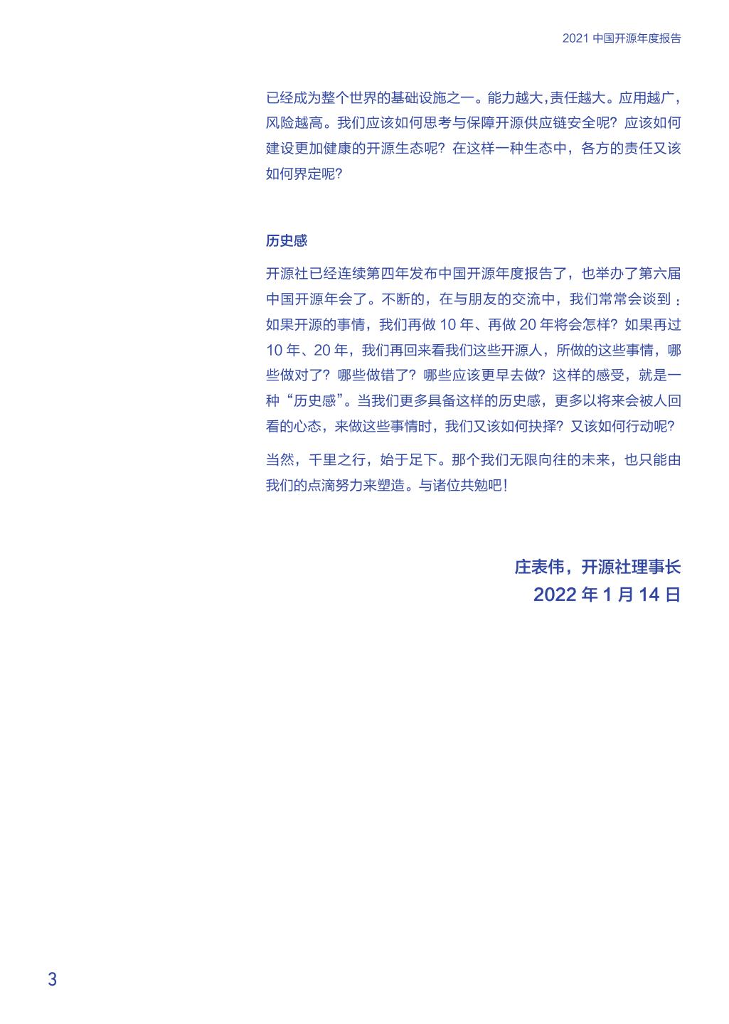 3 . 2021 中国开源年度报告 已经成为整个世界的基础设施之一。能力越大,责任越大。应用越广, 风险越高。我们应该如何思考与保障开源供应链安全呢?应该如何 建设更加健康的开源生态呢?在这样一种生态中,各方的责任又该 如何界定呢? 历史感 开源社已经连续第四年发布中国开源年度报告了,也举办了第六届 中国开源年会了。不断的,在与朋友的交流中,我们常常会谈到 : 如果开源的事情,我们再做 10 年、再做 20 年将会怎样?如果再过 10 年、20 年,我们再回来看我们这些开源人,所做的这些事情,哪 些做对了?哪些做错了?哪些应该更早去做?这样的感受,就是一 种“历史感”。当我们更多具备这样的历史感,更多以将来会被人回 看的心态,来做这些事情时,我们又该如何抉择?又该如何行动呢? 当然,千里之行,始于足下。那个我们无限向往的未来,也只能由 我们的点滴努力来塑造。与诸位共勉吧! 庄表伟,开源社理事长 2022 年 1 月 14 日 3