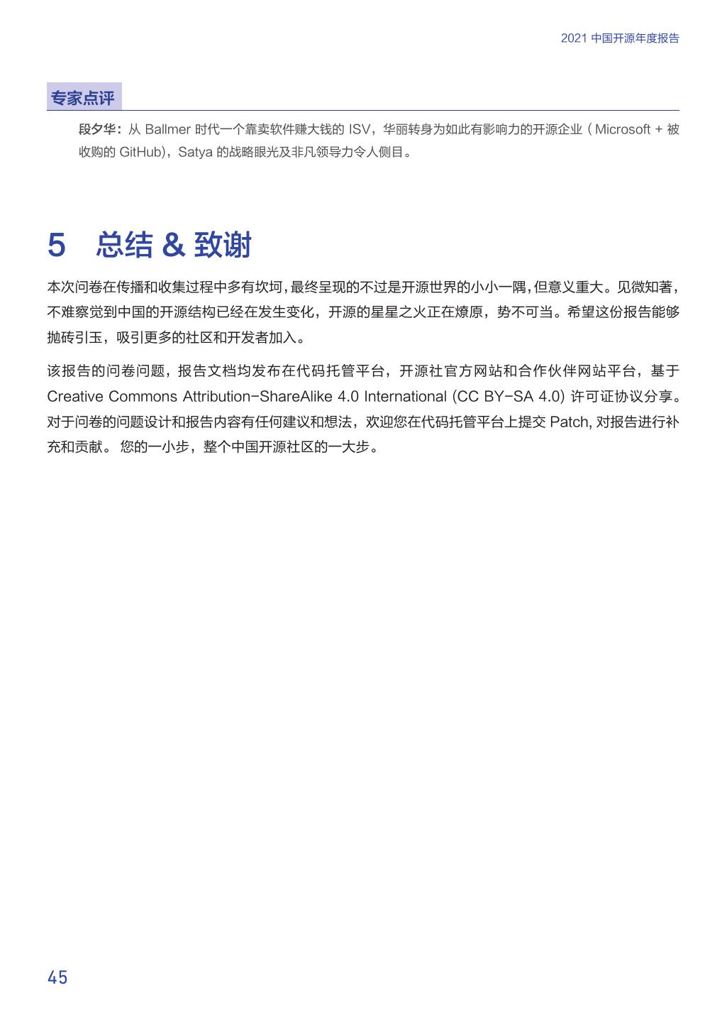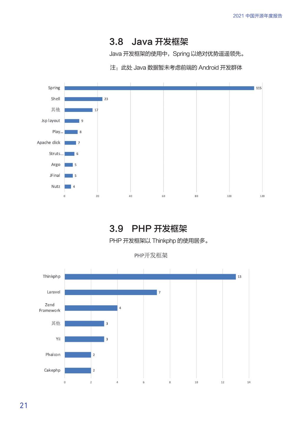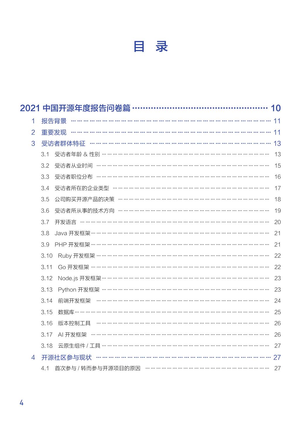 4 . 目 录 2021 中国开源年度报告问卷篇……………………………………………… 10 1 报告背景… …………………………………………………………………………………… 11 2 重要发现… …………………………………………………………………………………… 11 3 受访者群体特征… …………………………………………………………………………… 13 3.1 受访者年龄 & 性别…………………………………………………………………………………… 13 3.2 受访者从业时间… …………………………………………………………………………………… 15 3.3 受访者职位分布… …………………………………………………………………………………… 16 3.4 受访者所在的企业类型… …………………………………………………………………………… 17 3.5 公司购买开源产品的决策… ………………………………………………………………………… 18 3.6 受访者所从事的技术方向… ………………………………………………………………………… 19 3.7 开发语言… …………………………………………………………………………………………… 20 3.8 Java 开发框架………………………………………………………………………………………… 21 3.9 PHP 开发框架………………………………………………………………………………………… 21 3.10 Ruby 开发框架……………………………………………………………………………………… 22 3.11 Go 开发框架………………………………………………………………………………………… 22 3.12 Node.js 开发框架…………………………………………………………………………………… 23 3.13 Python 开发框架…………………………………………………………………………………… 23 3.14 前端开发框架… …………………………………………………………………………………… 24 3.15 数据库……………………………………………………………………………………………… 25 3.16 版本控制工具… …………………………………………………………………………………… 26 3.17 AI 开发框架… ……………………………………………………………………………………… 26 3.18 云原生组件 / 工具…………………………………………………………………………………… 27 4 开源社区参与现状… ………………………………………………………………………… 27 4.1 首次参与 / 转而参与开源项目的原因… …………………………………………………………… 27 4