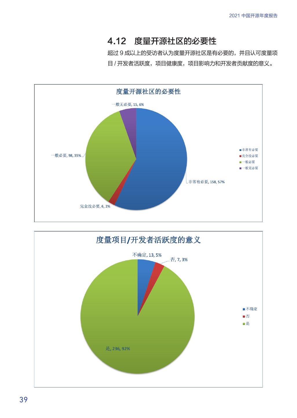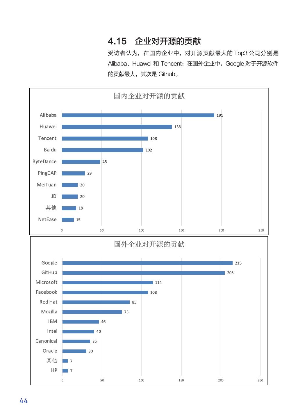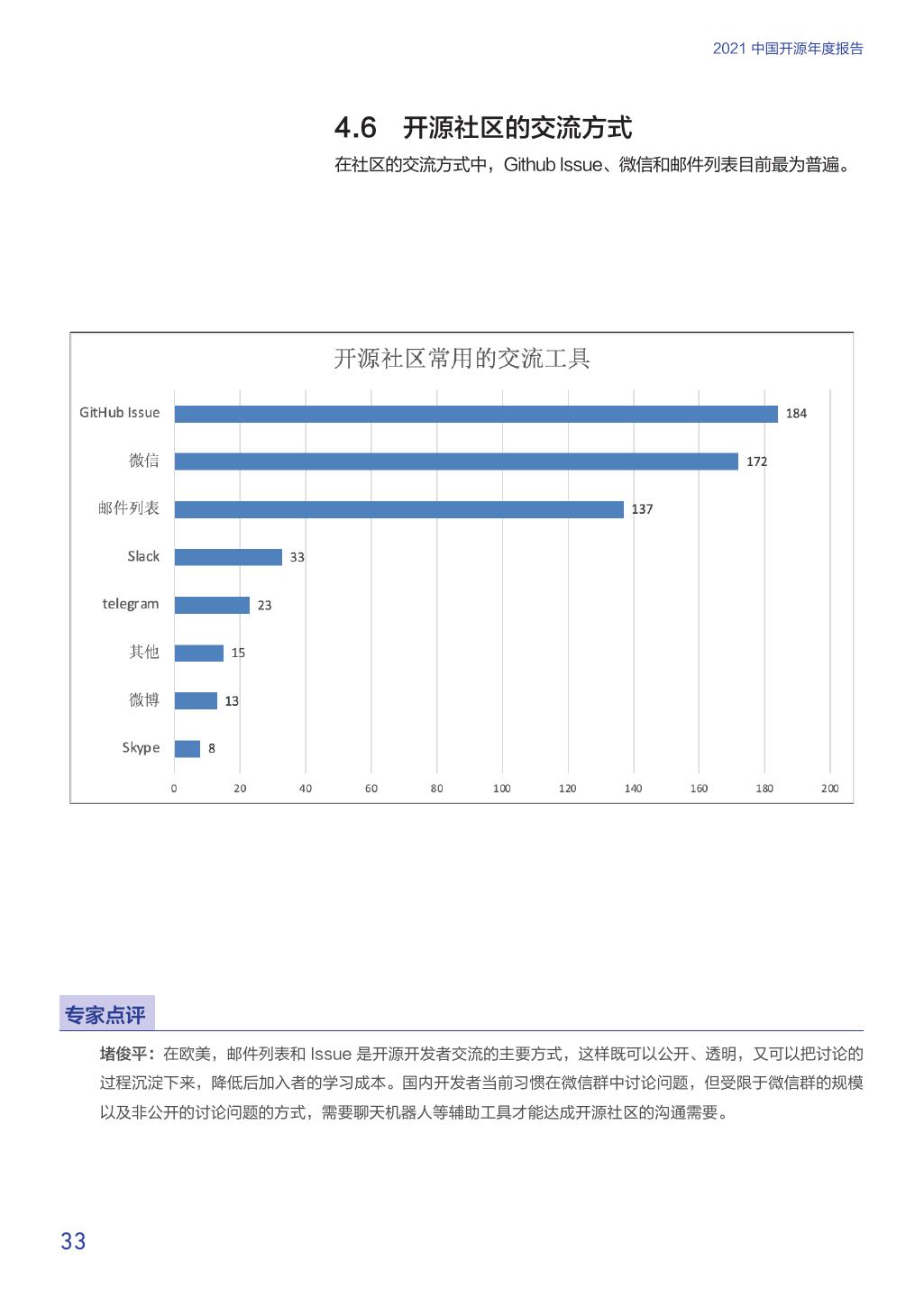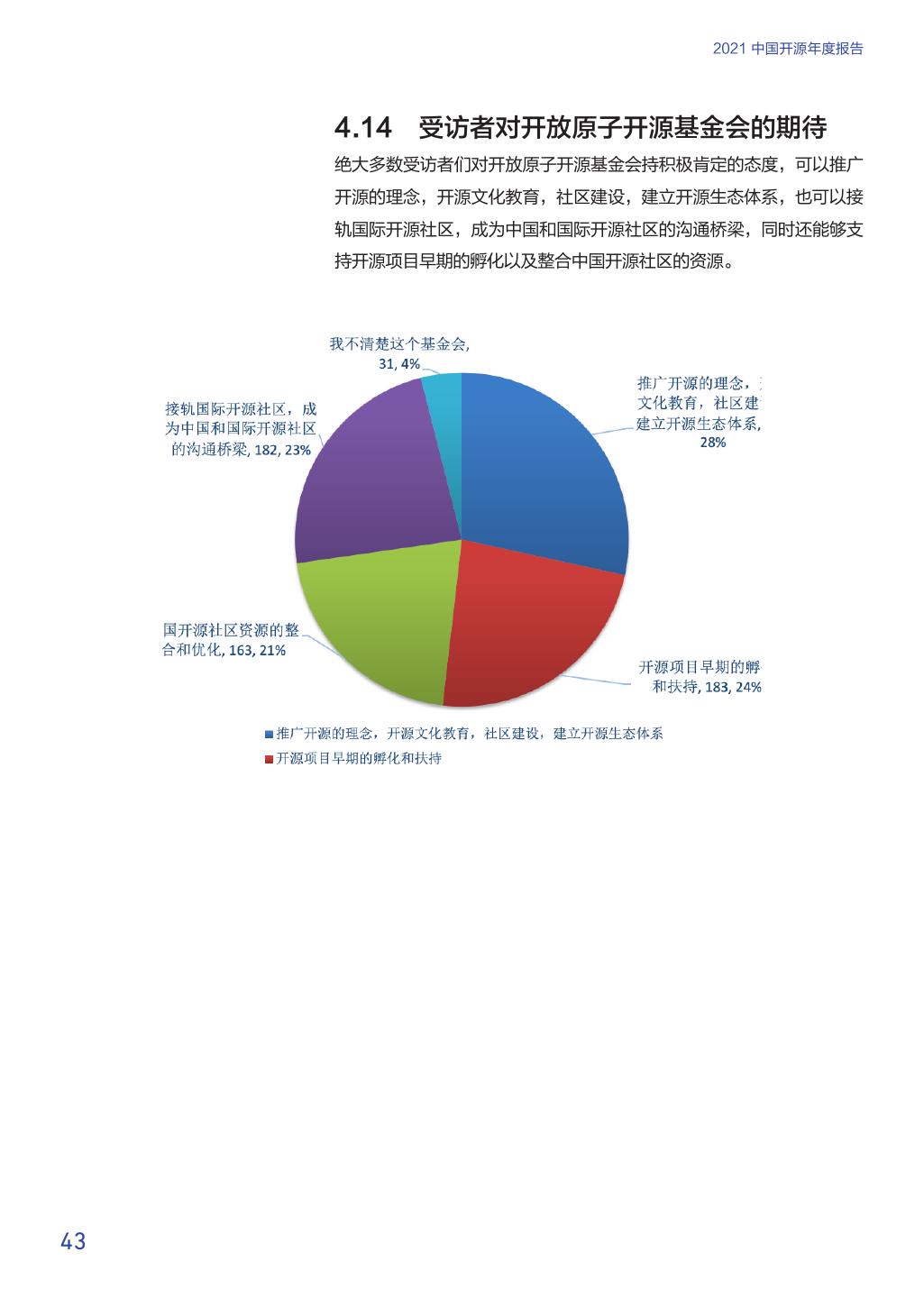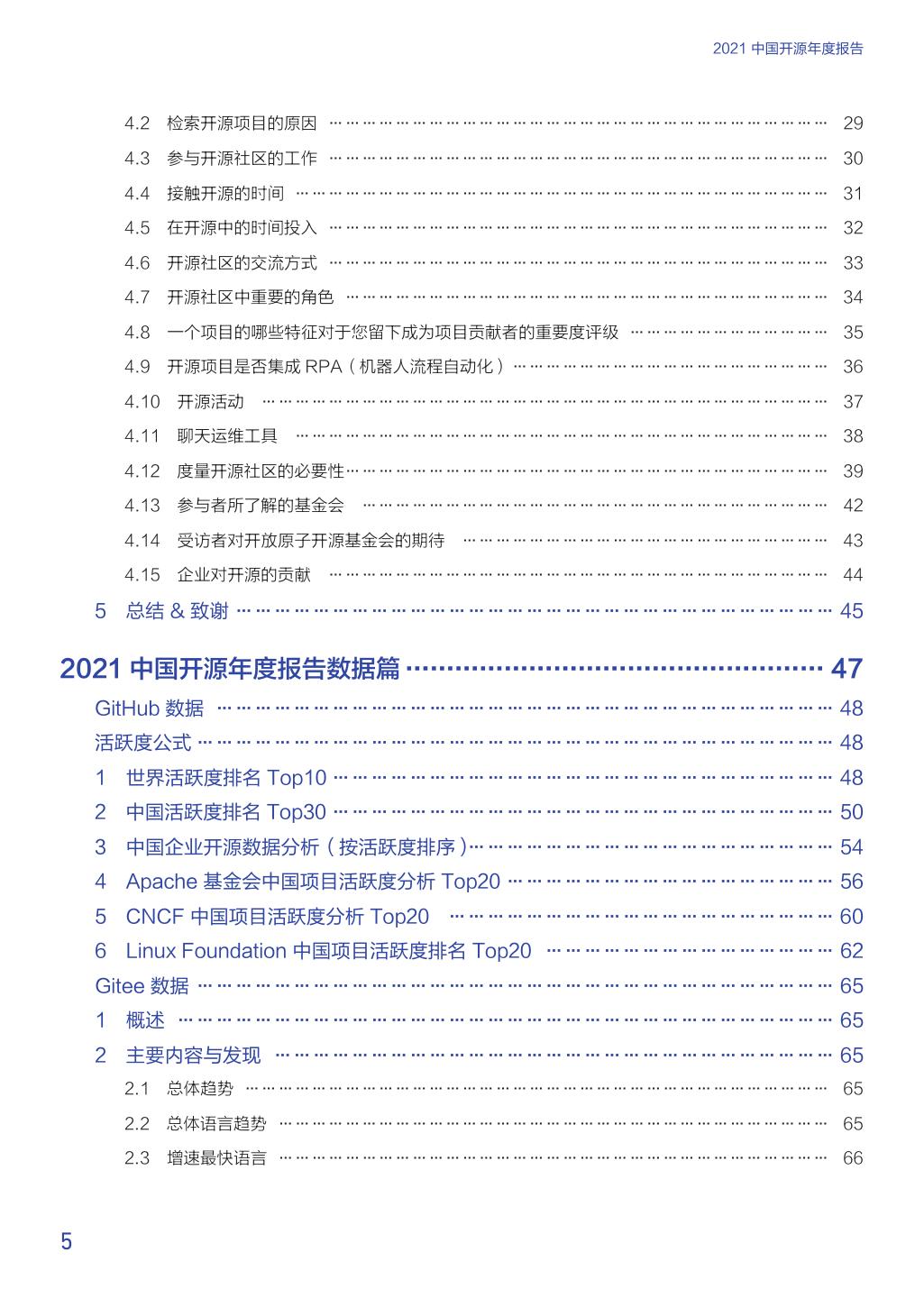 5 . 2021 中国开源年度报告 4.2 检索开源项目的原因… ……………………………………………………………………………… 29 4.3 参与开源社区的工作… ……………………………………………………………………………… 30 4.4 接触开源的时间… …………………………………………………………………………………… 31 4.5 在开源中的时间投入… ……………………………………………………………………………… 32 4.6 开源社区的交流方式… ……………………………………………………………………………… 33 4.7 开源社区中重要的角色… …………………………………………………………………………… 34 4.8 一个项目的哪些特征对于您留下成为项目贡献者的重要度评级… ……………………………… 35 4.9 开源项目是否集成 RPA(机器人流程自动化) … ………………………………………………… 36 4.10 开源活动… ………………………………………………………………………………………… 37 4.11 聊天运维工具… …………………………………………………………………………………… 38 4.12 度量开源社区的必要性…………………………………………………………………………… 39 4.13 参与者所了解的基金会… ………………………………………………………………………… 42 4.14 受访者对开放原子开源基金会的期待… ………………………………………………………… 43 4.15 企业对开源的贡献… ……………………………………………………………………………… 44 5 总结 & 致谢…………………………………………………………………………………… 45 2021 中国开源年度报告数据篇……………………………………………… 47 GitHub 数据… …………………………………………………………………………………… 48 活跃度公式………………………………………………………………………………………… 48 1 世界活跃度排名 Top10……………………………………………………………………… 48 2 中国活跃度排名 Top30……………………………………………………………………… 50 3 中国企业开源数据分析(按活跃度排序)…………………………………………………… 54 4 Apache 基金会中国项目活跃度分析 Top20……………………………………………… 56 5 CNCF 中国项目活跃度分析 Top20… …………………………………………………… 60 6 Linux Foundation 中国项目活跃度排名 Top20… ……………………………………… 62 Gitee 数据………………………………………………………………………………………… 65 1 概述… ………………………………………………………………………………………… 65 2 主要内容与发现… …………………………………………………………………………… 65 2.1 总体趋势… …………………………………………………………………………………………… 65 2.2 总体语言趋势… ……………………………………………………………………………………… 65 2.3 增速最快语言… ……………………………………………………………………………………… 66 5