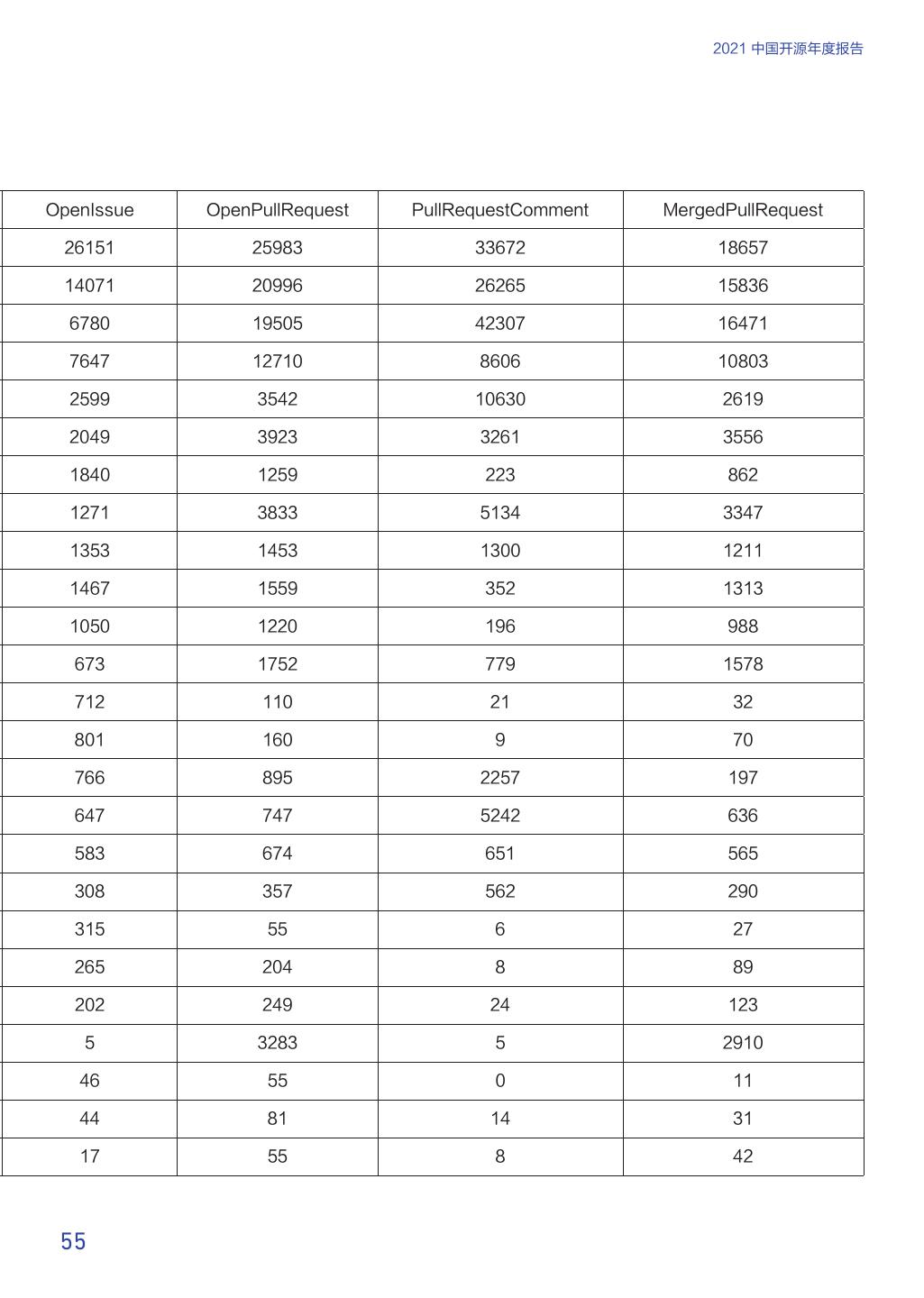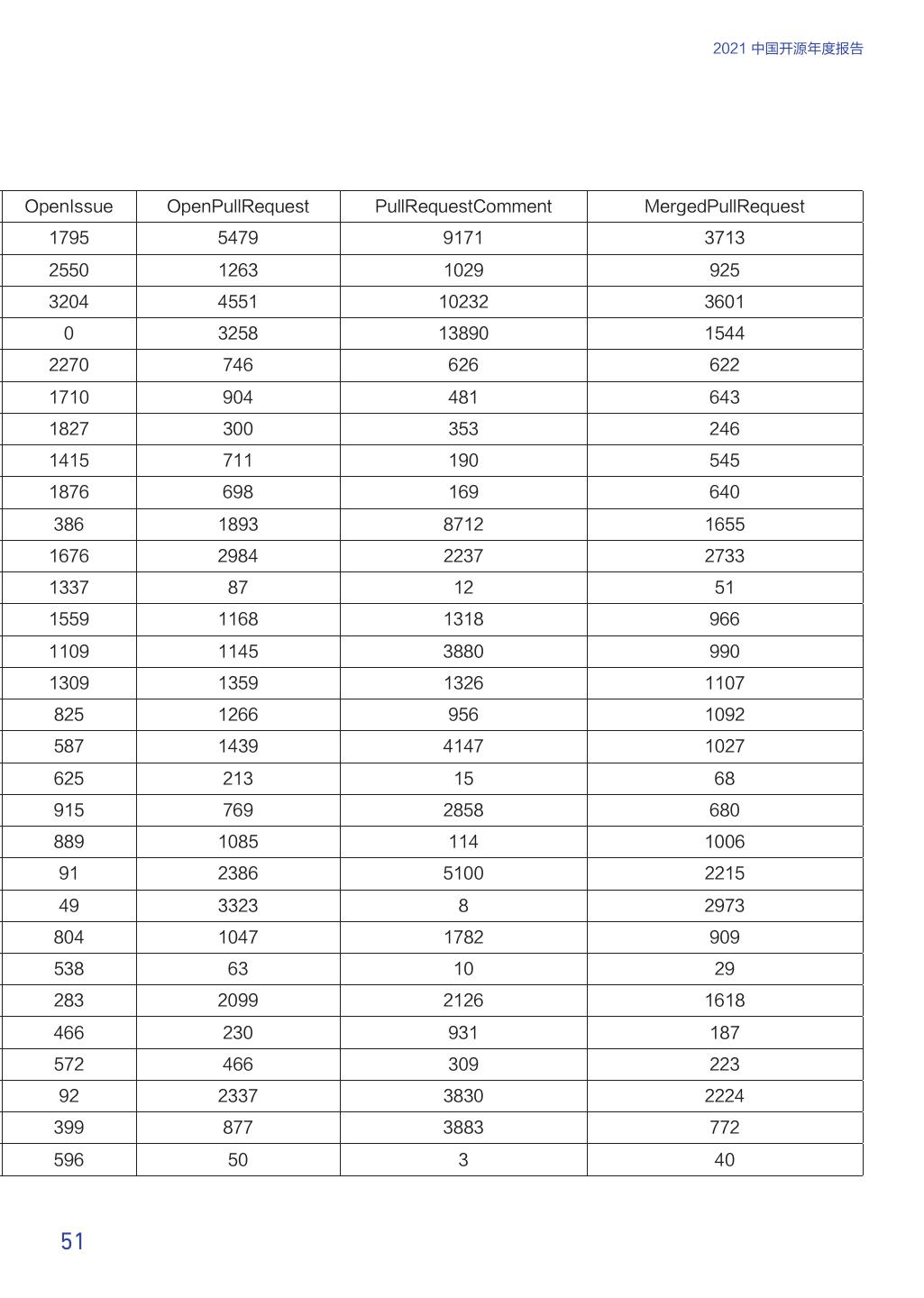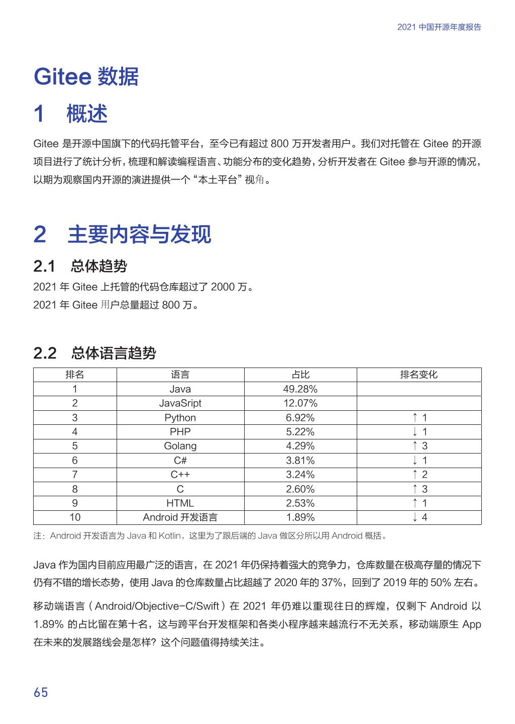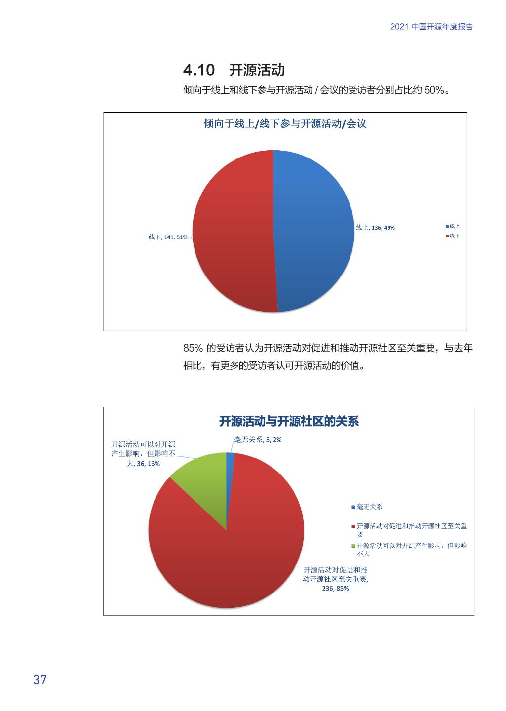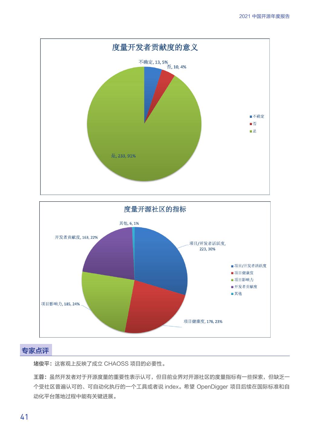 5 . 2021 中国开源年度报告 4.2 检索开源项目的原因… ……………………………………………………………………………… 29 4.3 参与开源社区的工作… ……………………………………………………………………………… 30 4.4 接触开源的时间… …………………………………………………………………………………… 31 4.5 在开源中的时间投入… ……………………………………………………………………………… 32 4.6 开源社区的交流方式… ……………………………………………………………………………… 33 4.7 开源社区中重要的角色… …………………………………………………………………………… 34 4.8 一个项目的哪些特征对于您留下成为项目贡献者的重要度评级… ……………………………… 35 4.9 开源项目是否集成 RPA(机器人流程自动化) … ………………………………………………… 36 4.10 开源活动… ………………………………………………………………………………………… 37 4.11 聊天运维工具… …………………………………………………………………………………… 38 4.12 度量开源社区的必要性…………………………………………………………………………… 39 4.13 参与者所了解的基金会… ………………………………………………………………………… 42 4.14 受访者对开放原子开源基金会的期待… ………………………………………………………… 43 4.15 企业对开源的贡献… ……………………………………………………………………………… 44 5 总结 & 致谢…………………………………………………………………………………… 45 2021 中国开源年度报告数据篇……………………………………………… 47 GitHub 数据… …………………………………………………………………………………… 48 活跃度公式………………………………………………………………………………………… 48 1 世界活跃度排名 Top10……………………………………………………………………… 48 2 中国活跃度排名 Top30……………………………………………………………………… 50 3 中国企业开源数据分析(按活跃度排序)…………………………………………………… 54 4 Apache 基金会中国项目活跃度分析 Top20……………………………………………… 56 5 CNCF 中国项目活跃度分析 Top20… …………………………………………………… 60 6 Linux Foundation 中国项目活跃度排名 Top20… ……………………………………… 62 Gitee 数据………………………………………………………………………………………… 65 1 概述… ………………………………………………………………………………………… 65 2 主要内容与发现… …………………………………………………………………………… 65 2.1 总体趋势… …………………………………………………………………………………………… 65 2.2 总体语言趋势… ……………………………………………………………………………………… 65 2.3 增速最快语言… ……………………………………………………………………………………… 66 5