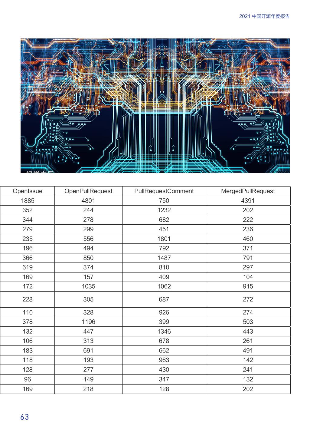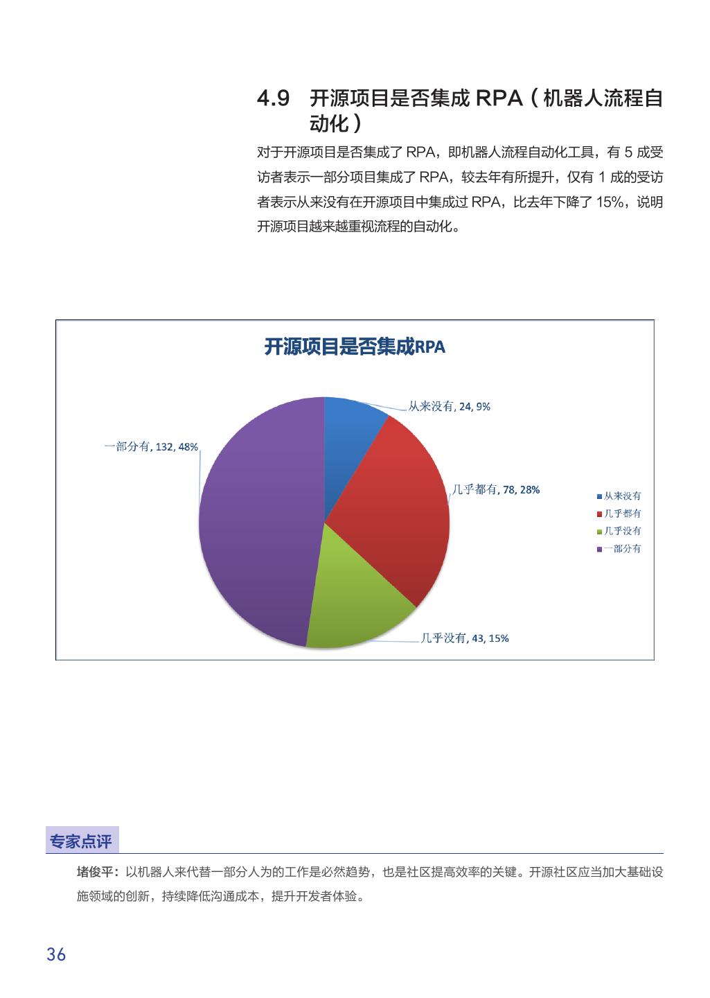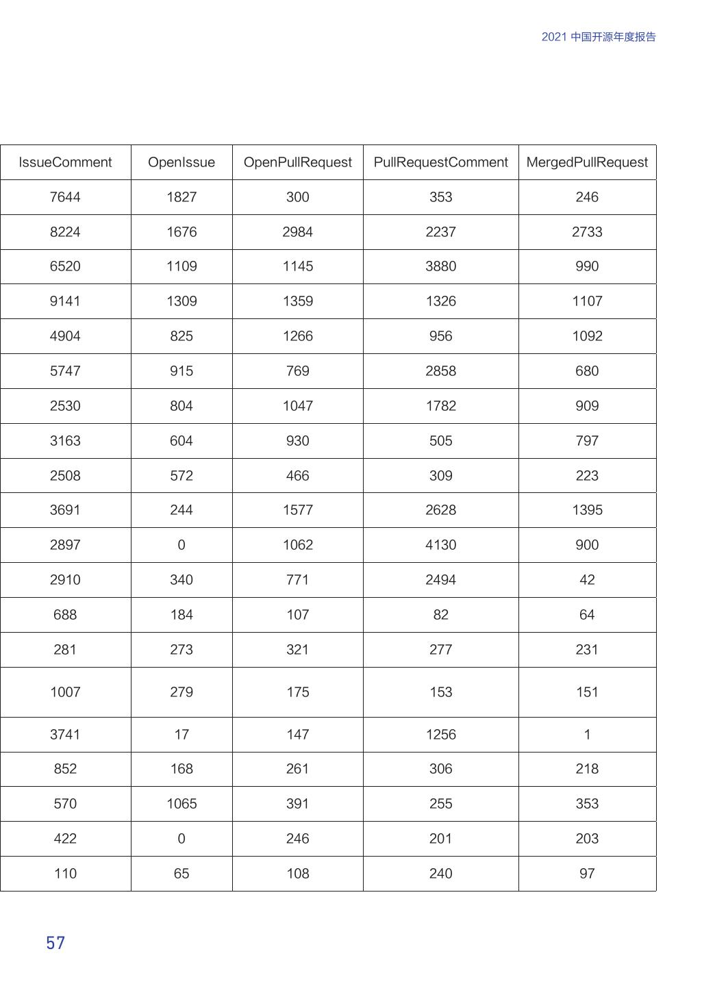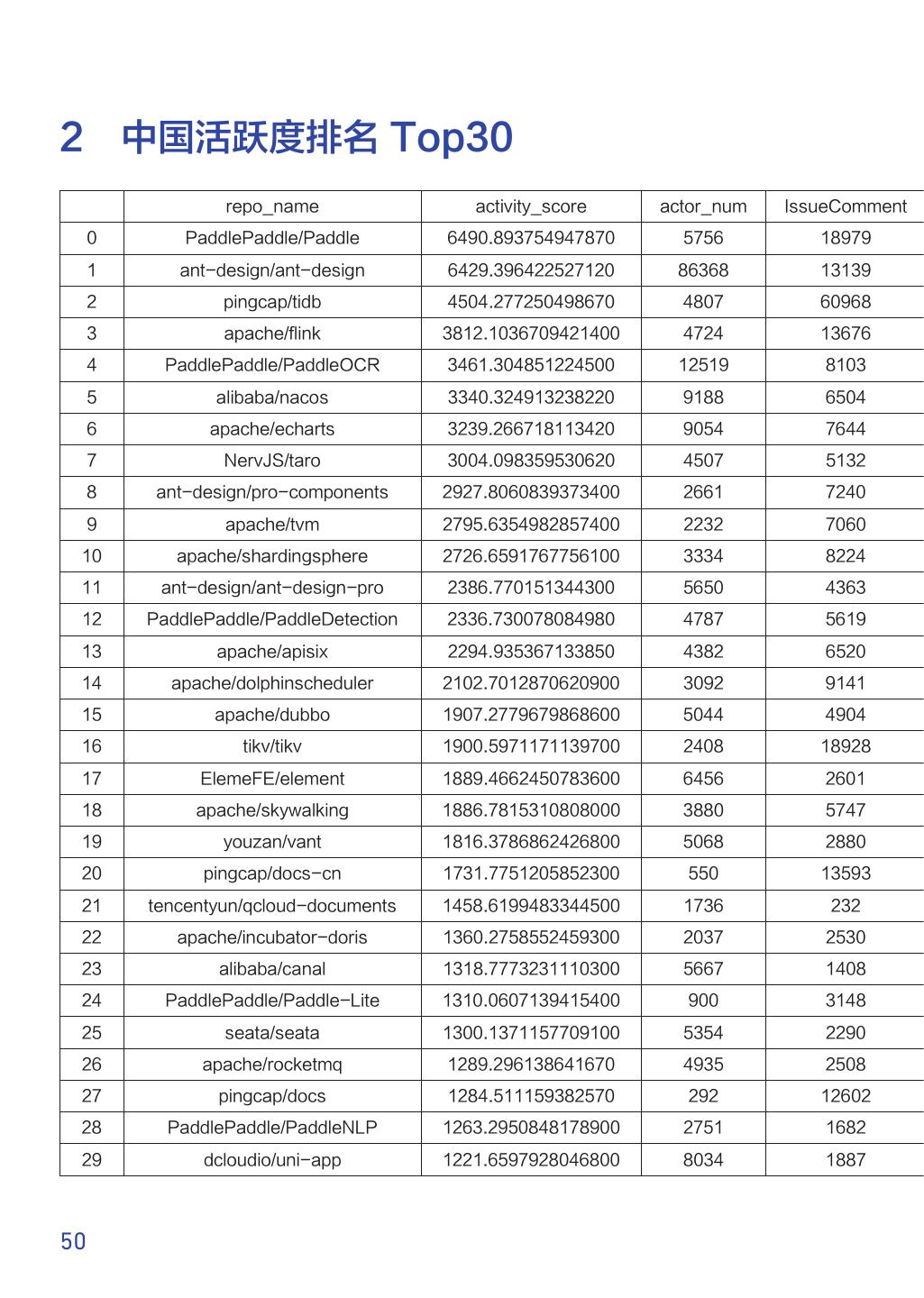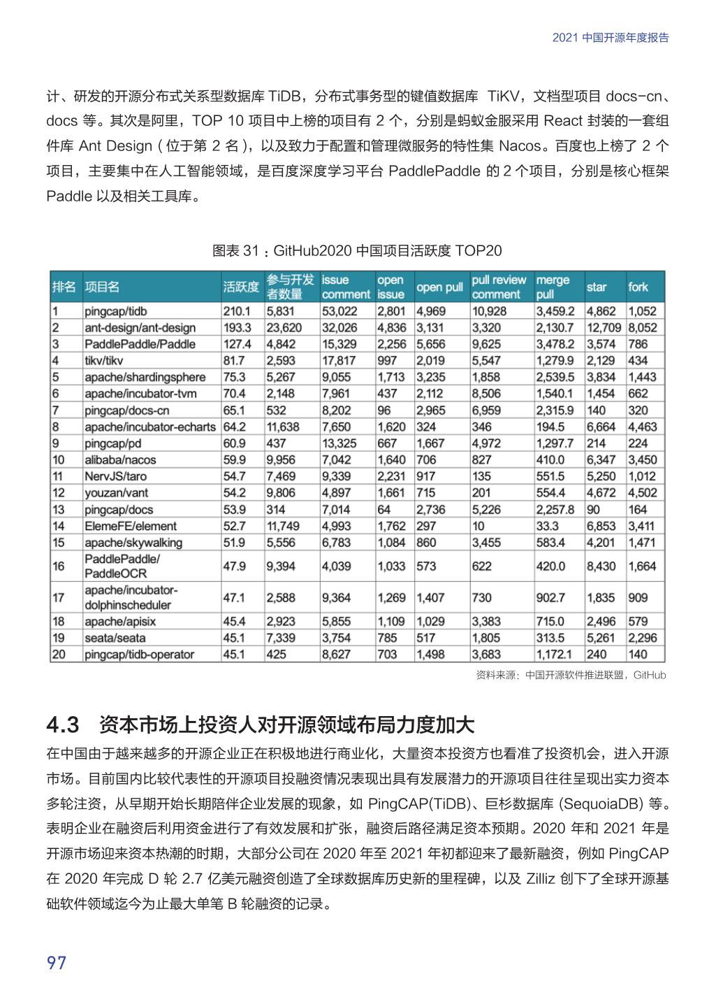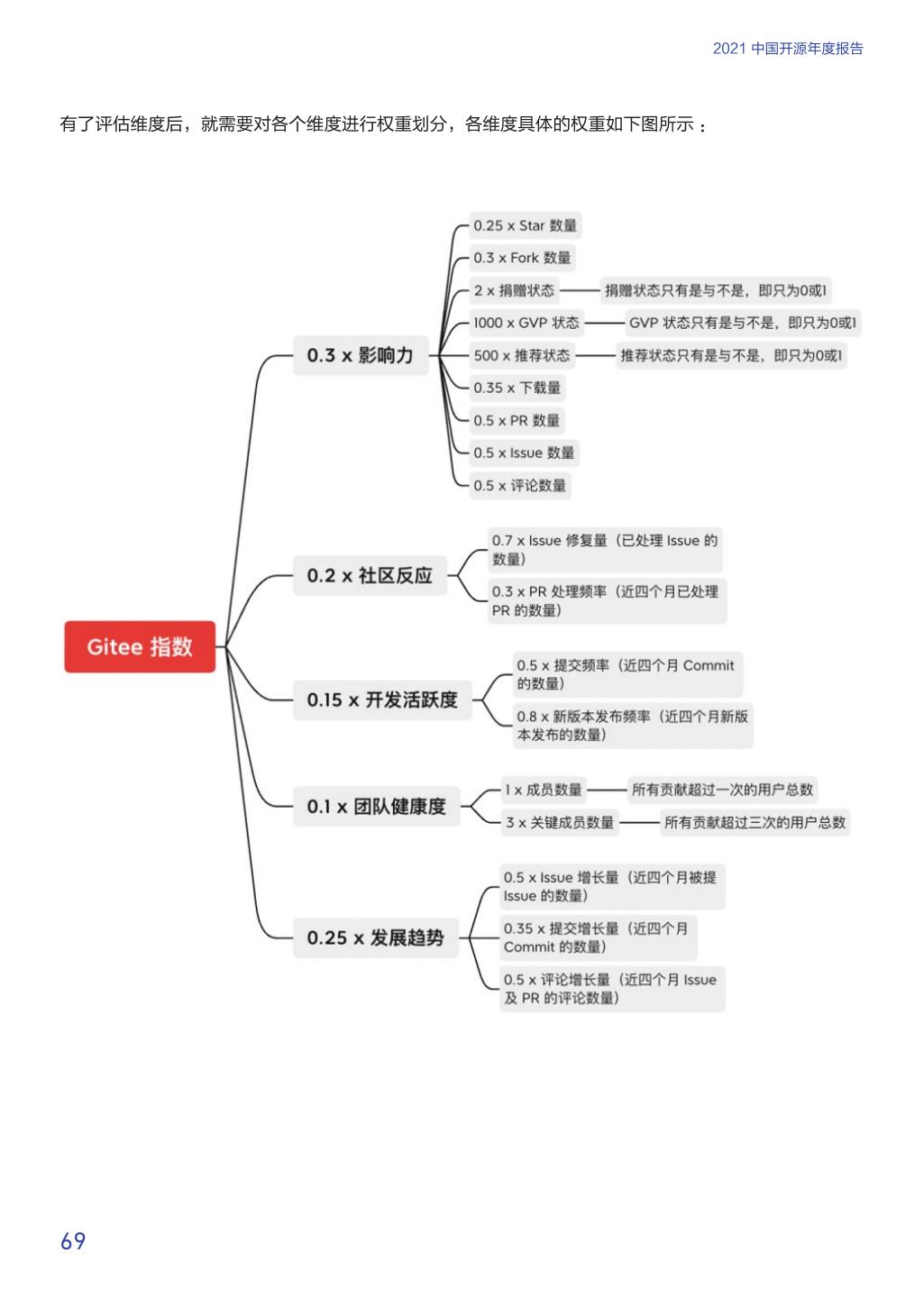 5 . 2021 中国开源年度报告 4.2 检索开源项目的原因… ……………………………………………………………………………… 29 4.3 参与开源社区的工作… ……………………………………………………………………………… 30 4.4 接触开源的时间… …………………………………………………………………………………… 31 4.5 在开源中的时间投入… ……………………………………………………………………………… 32 4.6 开源社区的交流方式… ……………………………………………………………………………… 33 4.7 开源社区中重要的角色… …………………………………………………………………………… 34 4.8 一个项目的哪些特征对于您留下成为项目贡献者的重要度评级… ……………………………… 35 4.9 开源项目是否集成 RPA(机器人流程自动化) … ………………………………………………… 36 4.10 开源活动… ………………………………………………………………………………………… 37 4.11 聊天运维工具… …………………………………………………………………………………… 38 4.12 度量开源社区的必要性…………………………………………………………………………… 39 4.13 参与者所了解的基金会… ………………………………………………………………………… 42 4.14 受访者对开放原子开源基金会的期待… ………………………………………………………… 43 4.15 企业对开源的贡献… ……………………………………………………………………………… 44 5 总结 & 致谢…………………………………………………………………………………… 45 2021 中国开源年度报告数据篇……………………………………………… 47 GitHub 数据… …………………………………………………………………………………… 48 活跃度公式………………………………………………………………………………………… 48 1 世界活跃度排名 Top10……………………………………………………………………… 48 2 中国活跃度排名 Top30……………………………………………………………………… 50 3 中国企业开源数据分析(按活跃度排序)…………………………………………………… 54 4 Apache 基金会中国项目活跃度分析 Top20……………………………………………… 56 5 CNCF 中国项目活跃度分析 Top20… …………………………………………………… 60 6 Linux Foundation 中国项目活跃度排名 Top20… ……………………………………… 62 Gitee 数据………………………………………………………………………………………… 65 1 概述… ………………………………………………………………………………………… 65 2 主要内容与发现… …………………………………………………………………………… 65 2.1 总体趋势… …………………………………………………………………………………………… 65 2.2 总体语言趋势… ……………………………………………………………………………………… 65 2.3 增速最快语言… ……………………………………………………………………………………… 66 5