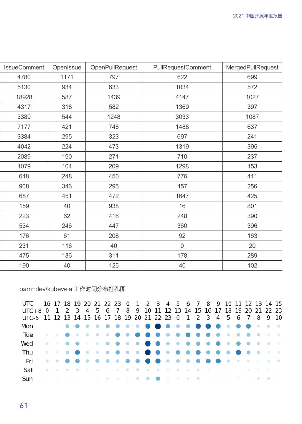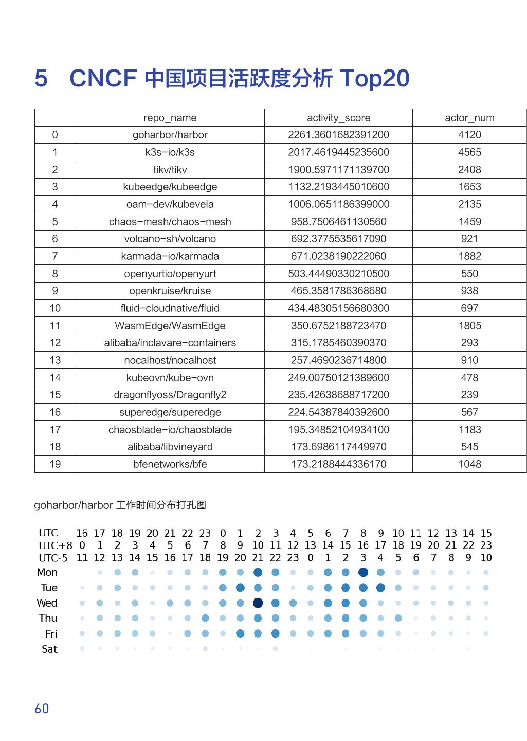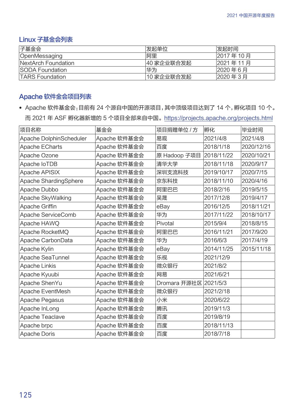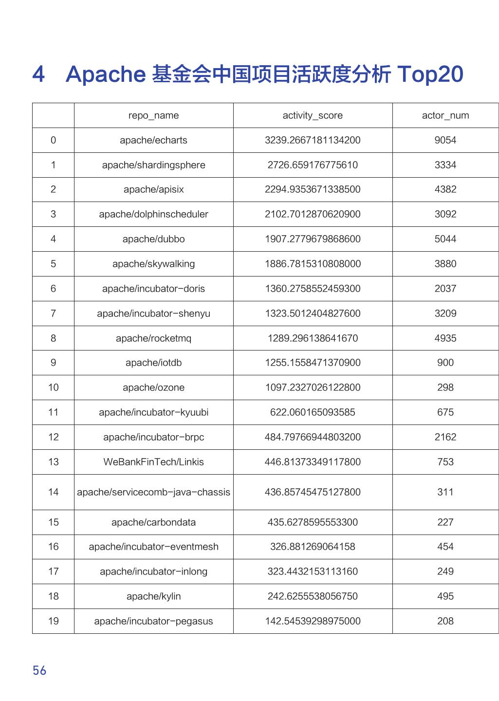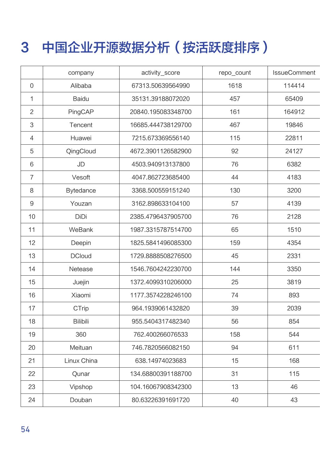 5 . 2021 中国开源年度报告 4.2 检索开源项目的原因… ……………………………………………………………………………… 29 4.3 参与开源社区的工作… ……………………………………………………………………………… 30 4.4 接触开源的时间… …………………………………………………………………………………… 31 4.5 在开源中的时间投入… ……………………………………………………………………………… 32 4.6 开源社区的交流方式… ……………………………………………………………………………… 33 4.7 开源社区中重要的角色… …………………………………………………………………………… 34 4.8 一个项目的哪些特征对于您留下成为项目贡献者的重要度评级… ……………………………… 35 4.9 开源项目是否集成 RPA(机器人流程自动化) … ………………………………………………… 36 4.10 开源活动… ………………………………………………………………………………………… 37 4.11 聊天运维工具… …………………………………………………………………………………… 38 4.12 度量开源社区的必要性…………………………………………………………………………… 39 4.13 参与者所了解的基金会… ………………………………………………………………………… 42 4.14 受访者对开放原子开源基金会的期待… ………………………………………………………… 43 4.15 企业对开源的贡献… ……………………………………………………………………………… 44 5 总结 & 致谢…………………………………………………………………………………… 45 2021 中国开源年度报告数据篇……………………………………………… 47 GitHub 数据… …………………………………………………………………………………… 48 活跃度公式………………………………………………………………………………………… 48 1 世界活跃度排名 Top10……………………………………………………………………… 48 2 中国活跃度排名 Top30……………………………………………………………………… 50 3 中国企业开源数据分析(按活跃度排序)…………………………………………………… 54 4 Apache 基金会中国项目活跃度分析 Top20……………………………………………… 56 5 CNCF 中国项目活跃度分析 Top20… …………………………………………………… 60 6 Linux Foundation 中国项目活跃度排名 Top20… ……………………………………… 62 Gitee 数据………………………………………………………………………………………… 65 1 概述… ………………………………………………………………………………………… 65 2 主要内容与发现… …………………………………………………………………………… 65 2.1 总体趋势… …………………………………………………………………………………………… 65 2.2 总体语言趋势… ……………………………………………………………………………………… 65 2.3 增速最快语言… ……………………………………………………………………………………… 66 5