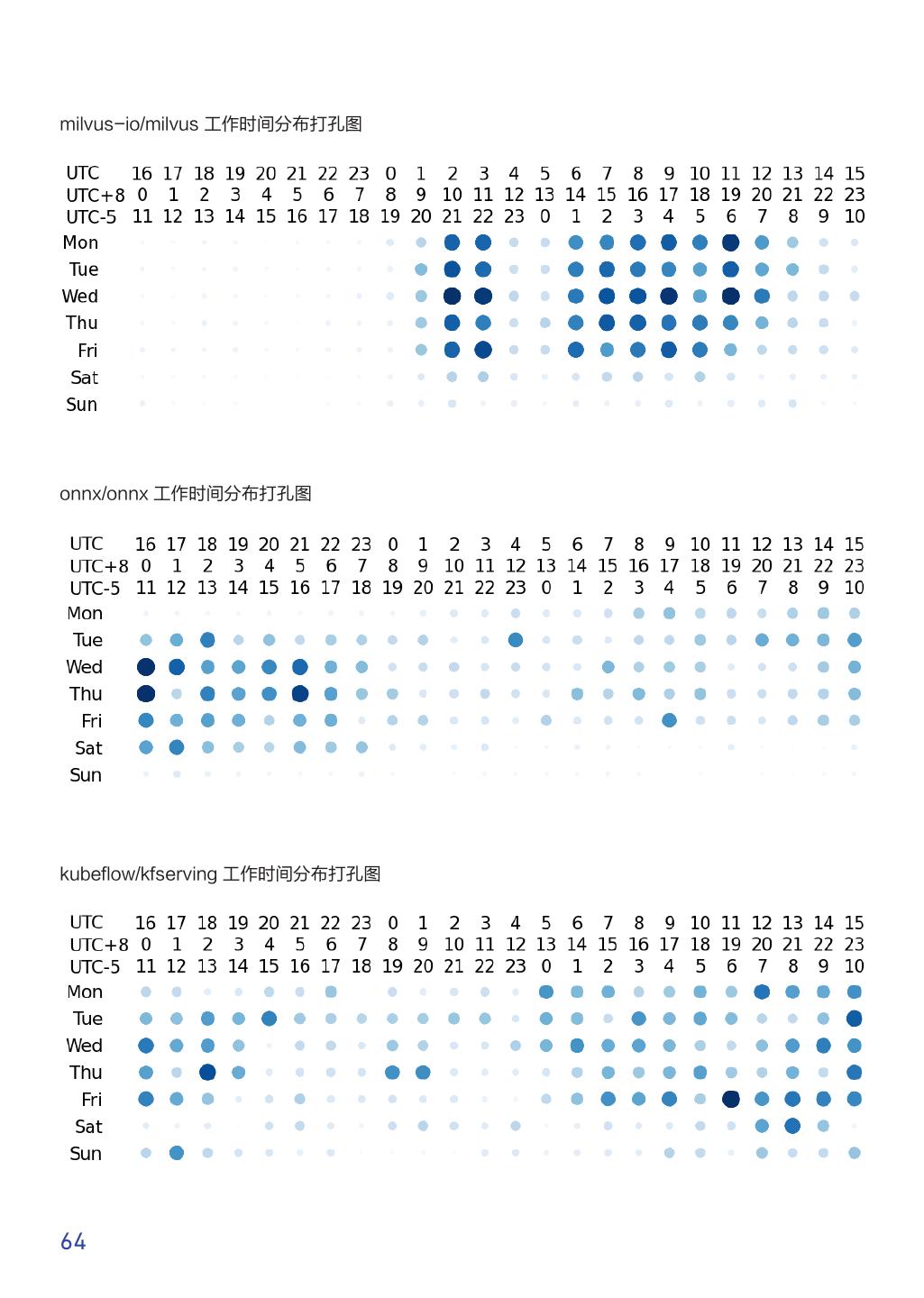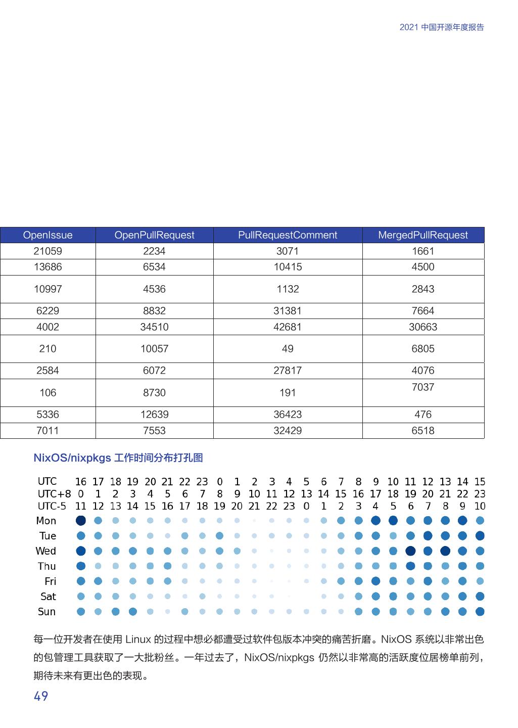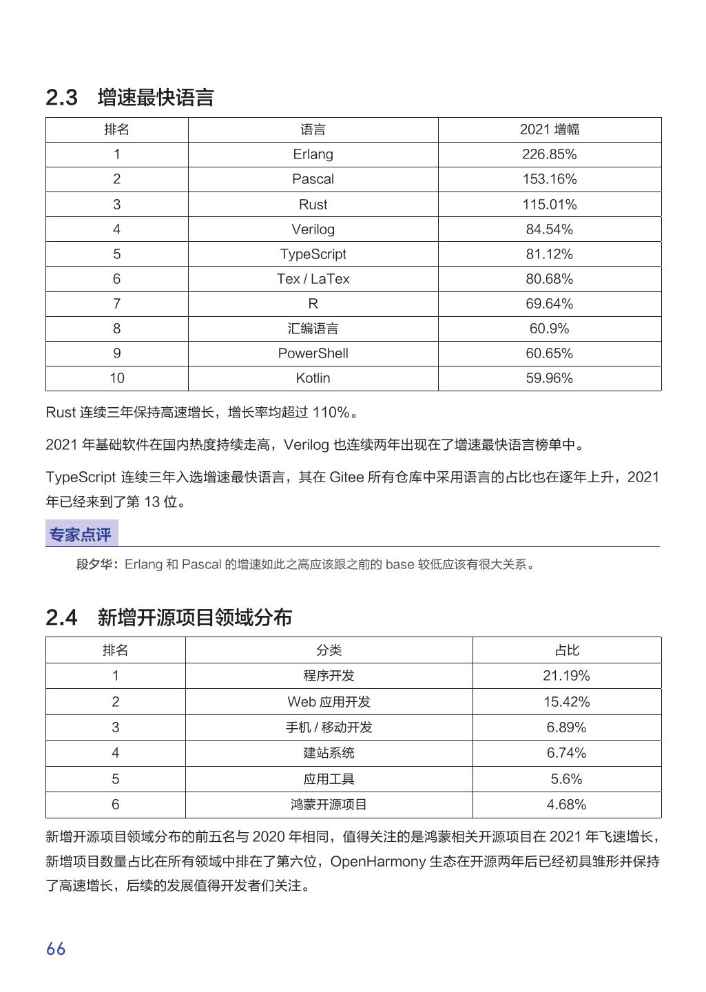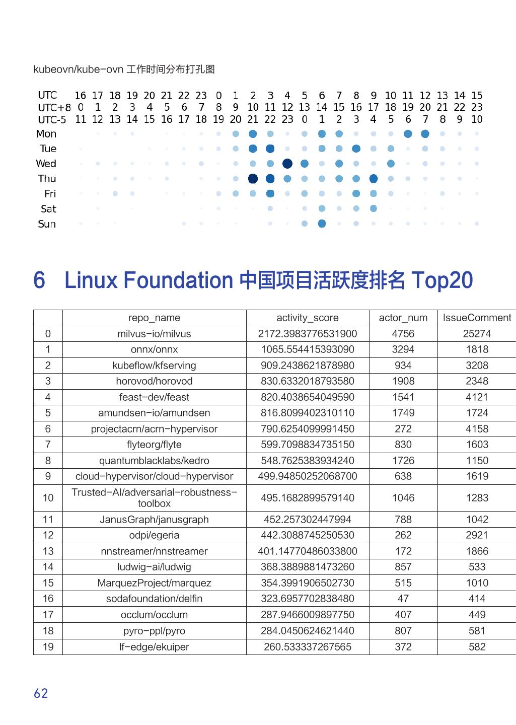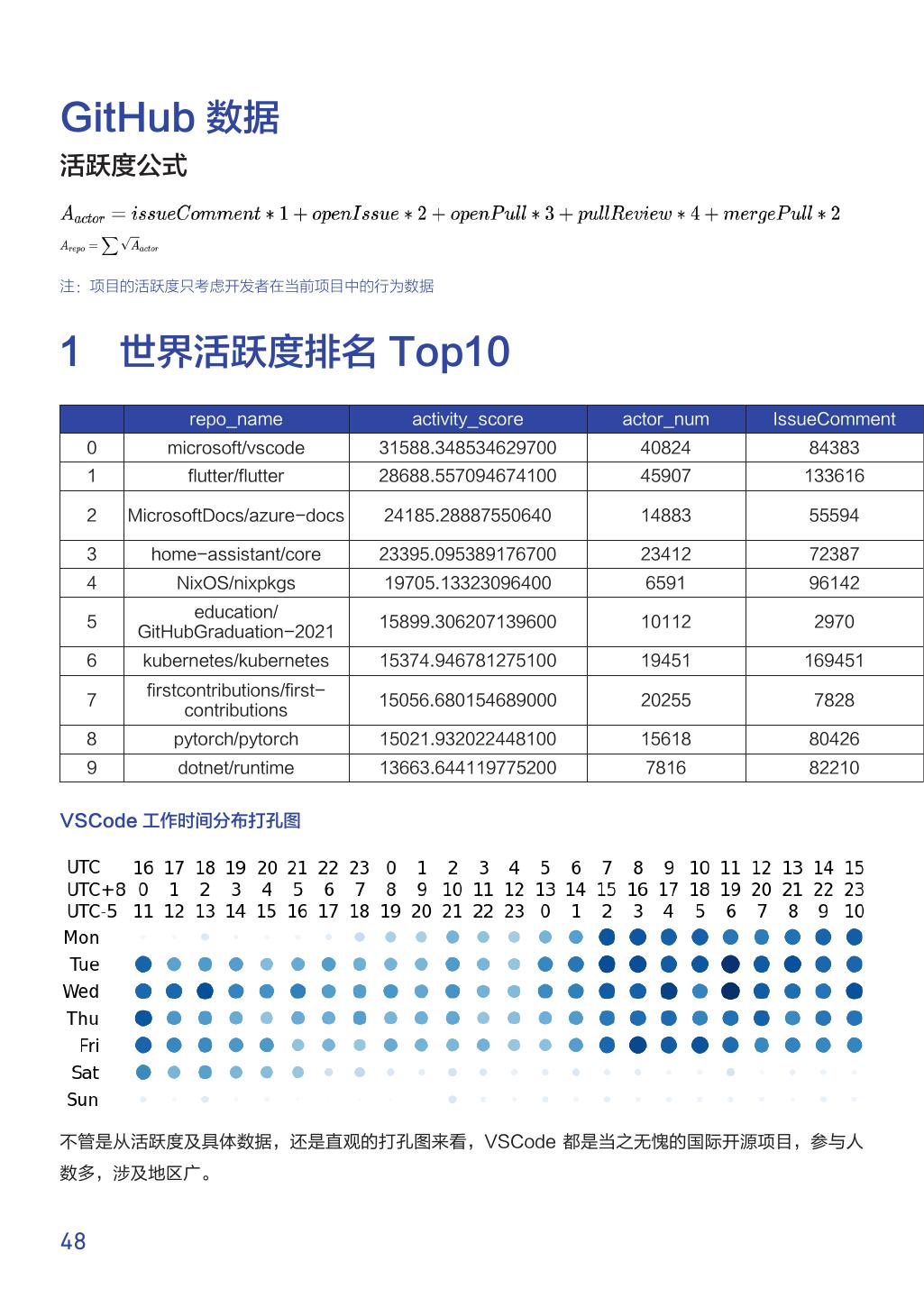 5 . 2021 中国开源年度报告 4.2 检索开源项目的原因… ……………………………………………………………………………… 29 4.3 参与开源社区的工作… ……………………………………………………………………………… 30 4.4 接触开源的时间… …………………………………………………………………………………… 31 4.5 在开源中的时间投入… ……………………………………………………………………………… 32 4.6 开源社区的交流方式… ……………………………………………………………………………… 33 4.7 开源社区中重要的角色… …………………………………………………………………………… 34 4.8 一个项目的哪些特征对于您留下成为项目贡献者的重要度评级… ……………………………… 35 4.9 开源项目是否集成 RPA(机器人流程自动化) … ………………………………………………… 36 4.10 开源活动… ………………………………………………………………………………………… 37 4.11 聊天运维工具… …………………………………………………………………………………… 38 4.12 度量开源社区的必要性…………………………………………………………………………… 39 4.13 参与者所了解的基金会… ………………………………………………………………………… 42 4.14 受访者对开放原子开源基金会的期待… ………………………………………………………… 43 4.15 企业对开源的贡献… ……………………………………………………………………………… 44 5 总结 & 致谢…………………………………………………………………………………… 45 2021 中国开源年度报告数据篇……………………………………………… 47 GitHub 数据… …………………………………………………………………………………… 48 活跃度公式………………………………………………………………………………………… 48 1 世界活跃度排名 Top10……………………………………………………………………… 48 2 中国活跃度排名 Top30……………………………………………………………………… 50 3 中国企业开源数据分析(按活跃度排序)…………………………………………………… 54 4 Apache 基金会中国项目活跃度分析 Top20……………………………………………… 56 5 CNCF 中国项目活跃度分析 Top20… …………………………………………………… 60 6 Linux Foundation 中国项目活跃度排名 Top20… ……………………………………… 62 Gitee 数据………………………………………………………………………………………… 65 1 概述… ………………………………………………………………………………………… 65 2 主要内容与发现… …………………………………………………………………………… 65 2.1 总体趋势… …………………………………………………………………………………………… 65 2.2 总体语言趋势… ……………………………………………………………………………………… 65 2.3 增速最快语言… ……………………………………………………………………………………… 66 5