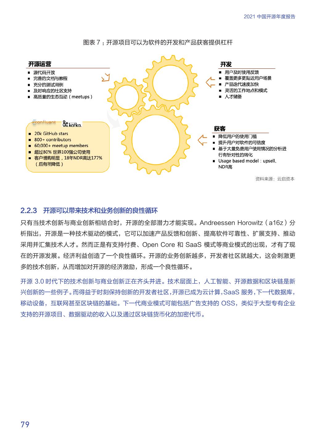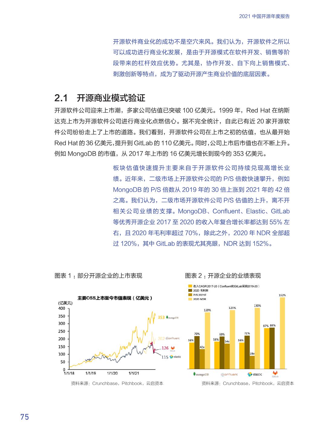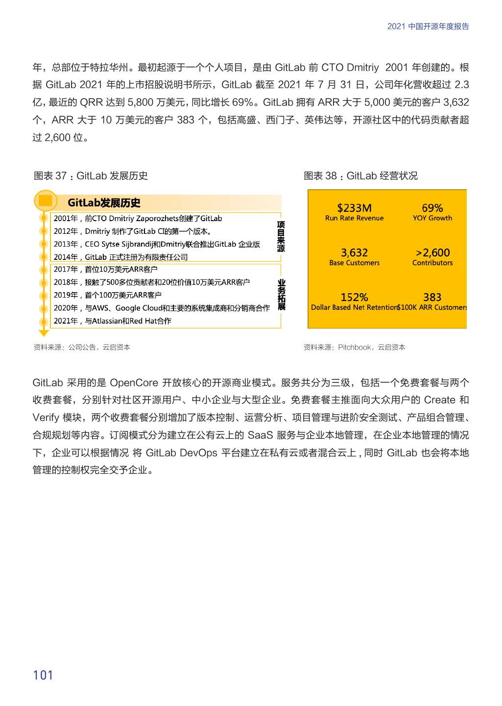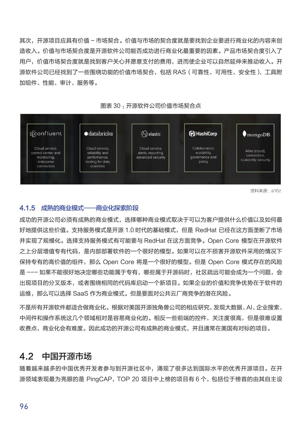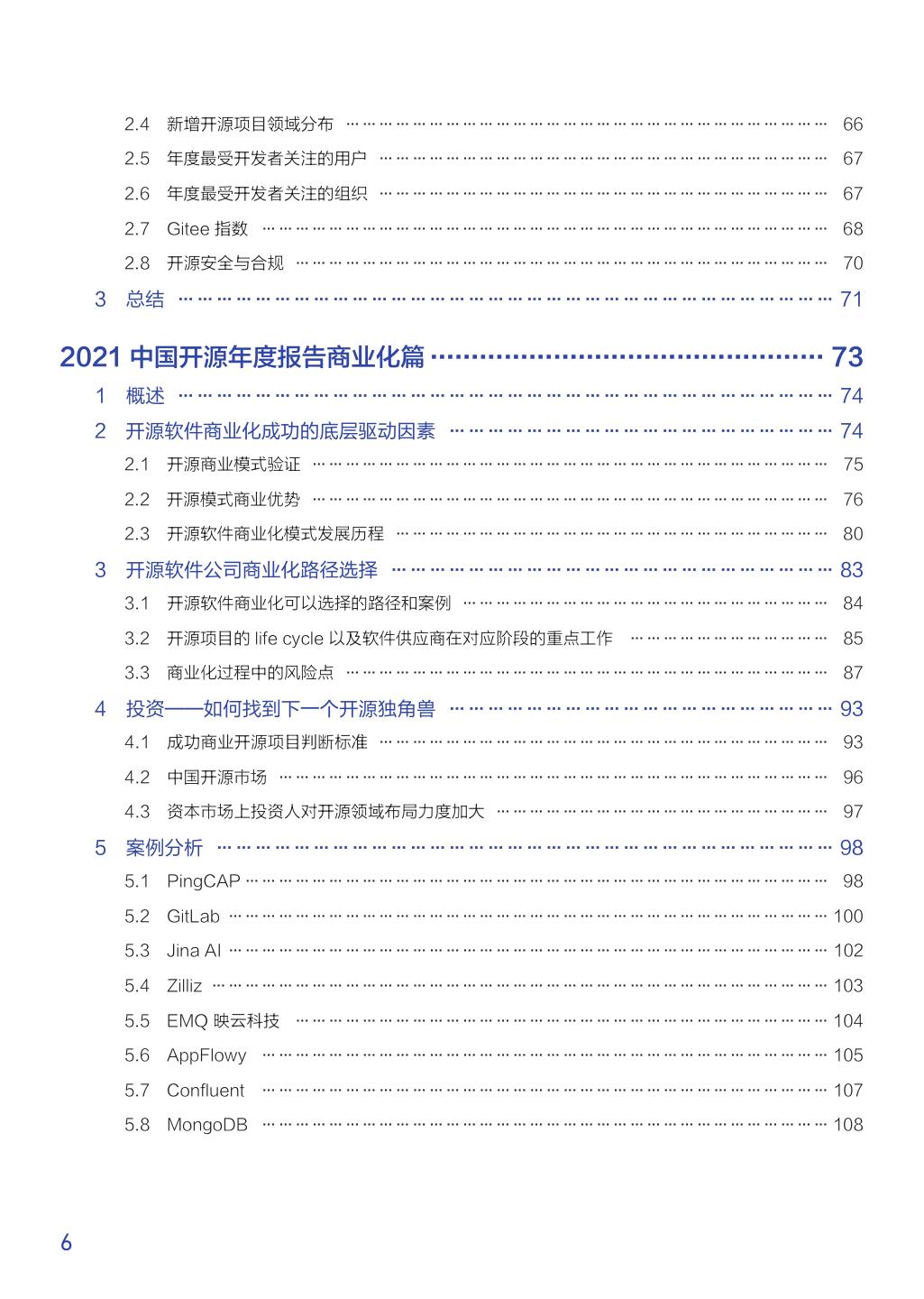 6 . 2.4 新增开源项目领域分布… …………………………………………………………………………… 66 2.5 年度最受开发者关注的用户… ……………………………………………………………………… 67 2.6 年度最受开发者关注的组织… ……………………………………………………………………… 67 2.7 Gitee 指数… ………………………………………………………………………………………… 68 2.8 开源安全与合规… …………………………………………………………………………………… 70 3 总结… ………………………………………………………………………………………… 71 2021 中国开源年度报告商业化篇…………………………………………… 73 1 概述… ………………………………………………………………………………………… 74 2 开源软件商业化成功的底层驱动因素… …………………………………………………… 74 2.1 开源商业模式验证… ………………………………………………………………………………… 75 2.2 开源模式商业优势… ………………………………………………………………………………… 76 2.3 开源软件商业化模式发展历程… …………………………………………………………………… 80 3 开源软件公司商业化路径选择… …………………………………………………………… 83 3.1 开源软件商业化可以选择的路径和案例… ………………………………………………………… 84 3.2 开源项目的 life cycle 以及软件供应商在对应阶段的重点工作… ……………………………… 85 3.3 商业化过程中的风险点… …………………………………………………………………………… 87 4 投资——如何找到下一个开源独角兽… …………………………………………………… 93 4.1 成功商业开源项目判断标准… ……………………………………………………………………… 93 4.2 中国开源市场… ……………………………………………………………………………………… 96 4.3 资本市场上投资人对开源领域布局力度加大… …………………………………………………… 97 5 案例分析… …………………………………………………………………………………… 98 5.1 PingCAP……………………………………………………………………………………………… 98 5.2 GitLab… ……………………………………………………………………………………………… 100 5.3 Jina AI………………………………………………………………………………………………… 102 5.4 Zilliz… ………………………………………………………………………………………………… 103 5.5 EMQ 映云科技… …………………………………………………………………………………… 104 5.6 AppFlowy… ………………………………………………………………………………………… 105 5.7 Confluent… ………………………………………………………………………………………… 107 5.8 MongoDB… ………………………………………………………………………………………… 108 6
