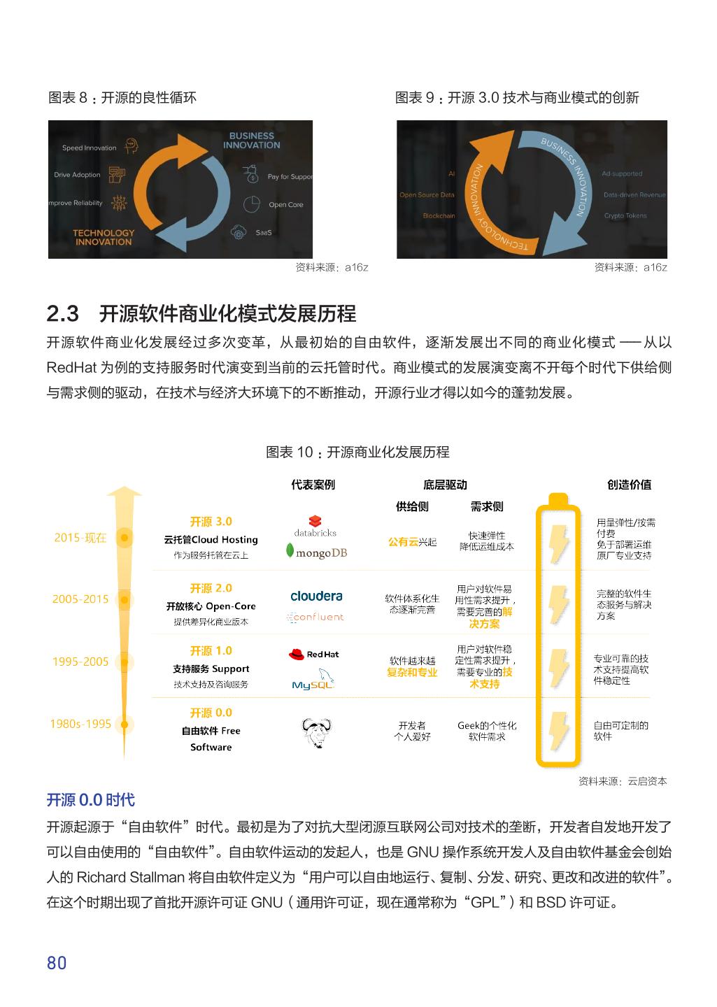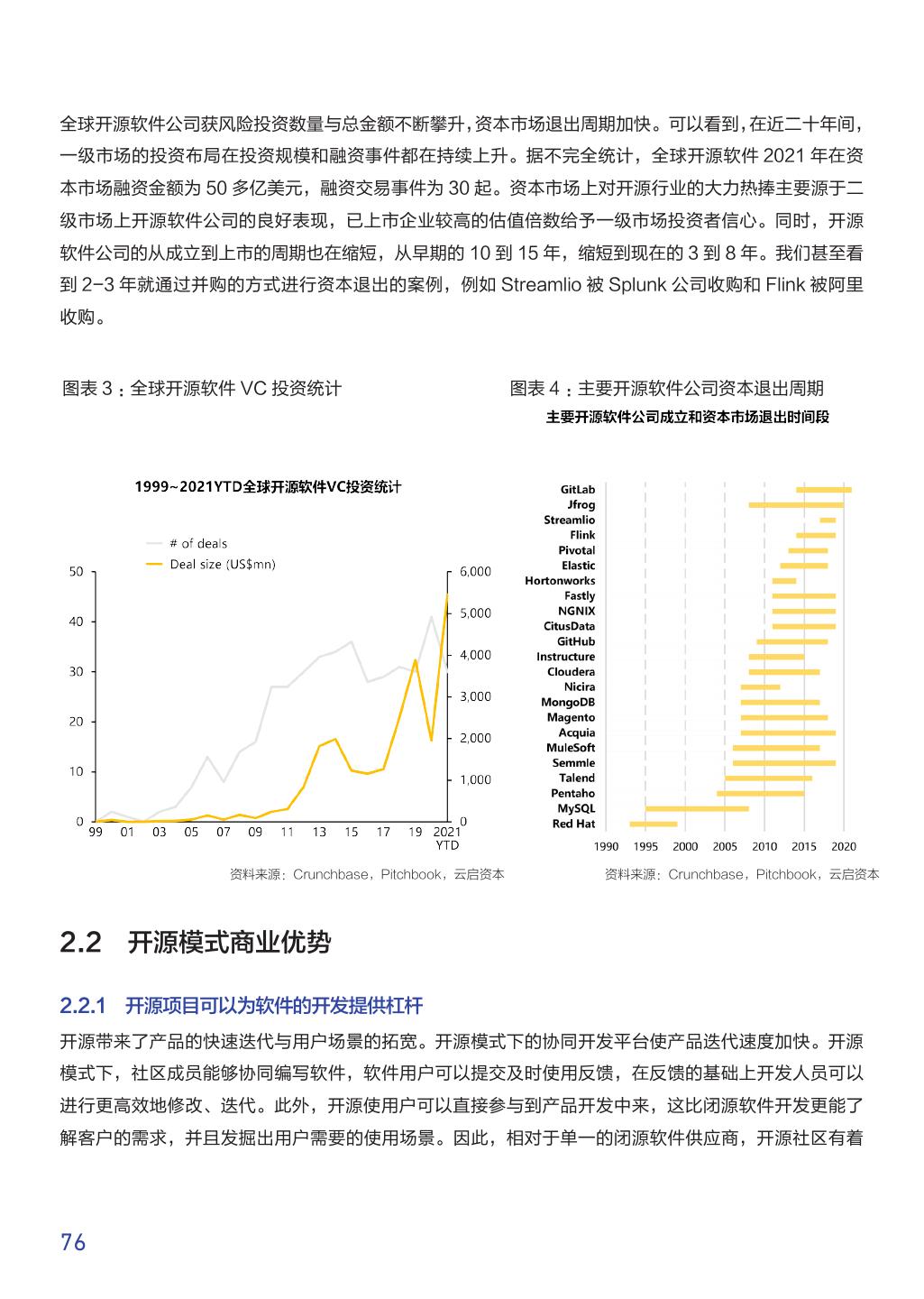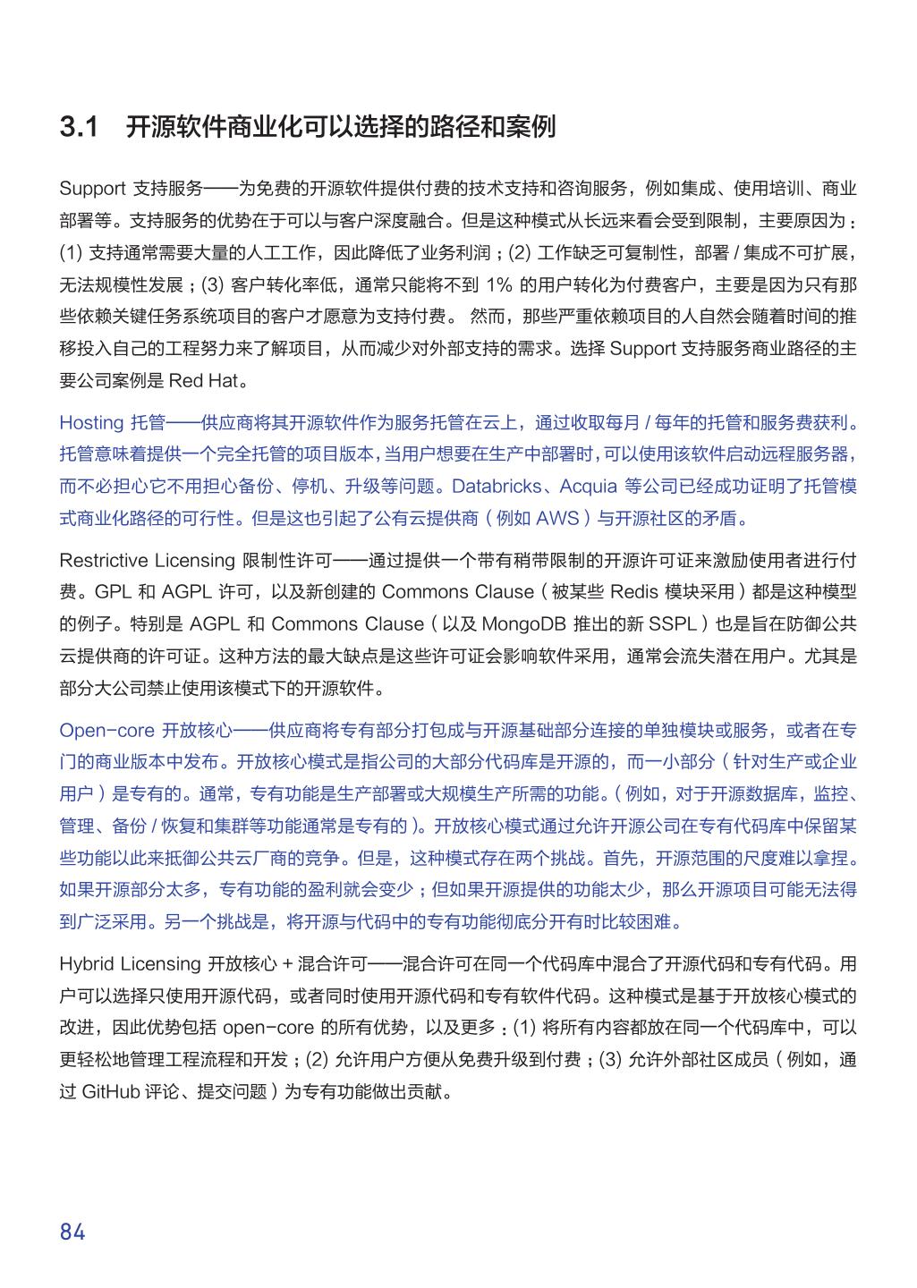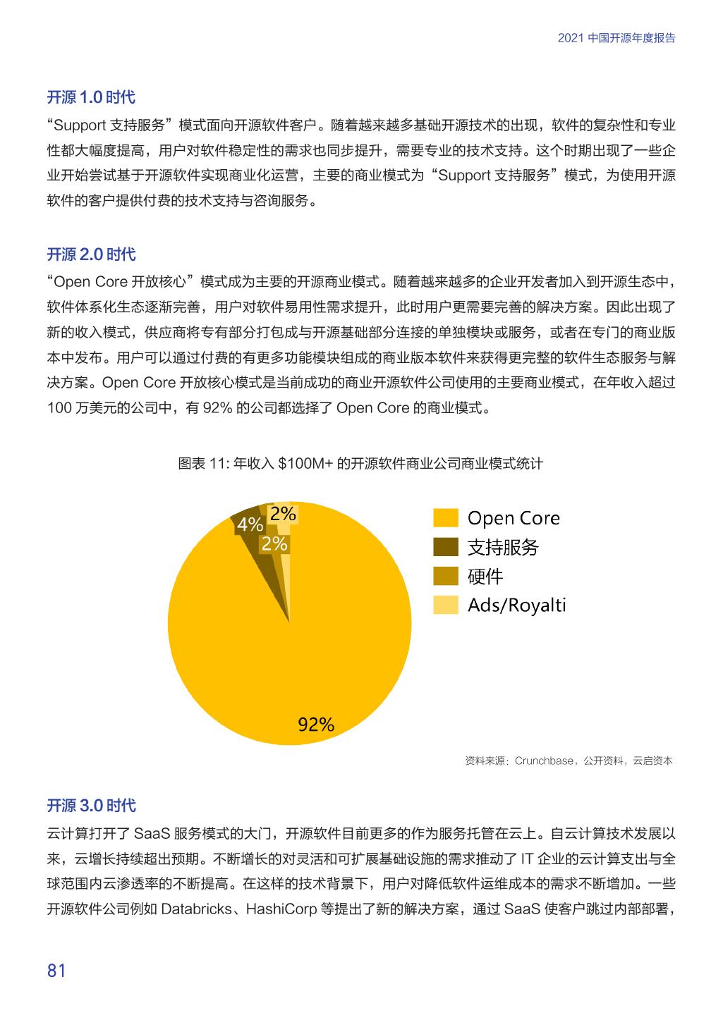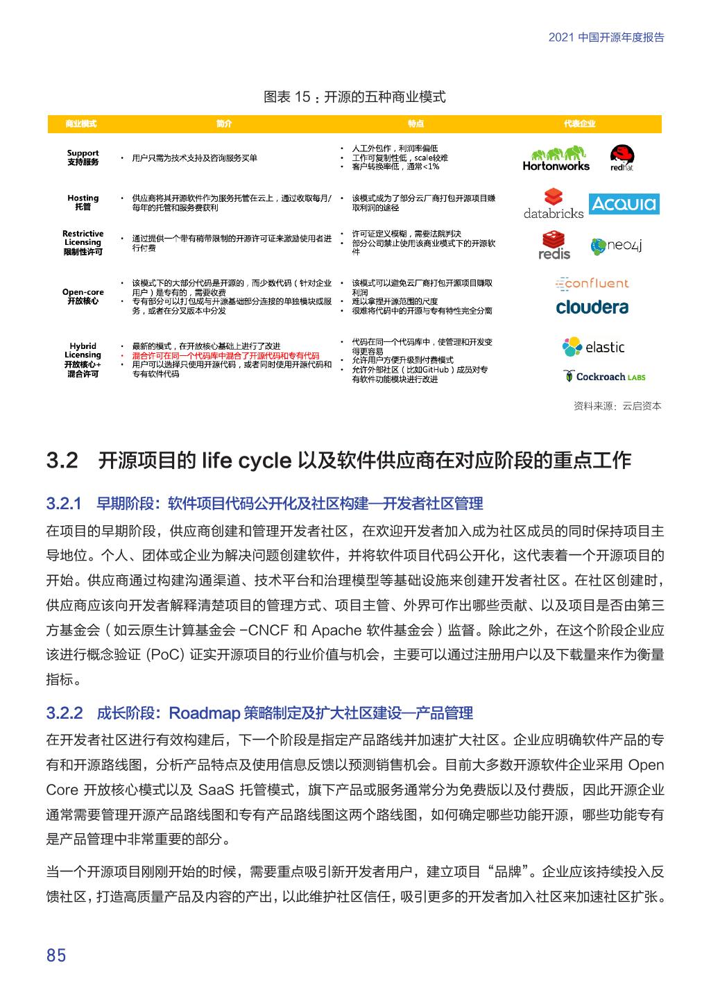 6 . 2.4 新增开源项目领域分布… …………………………………………………………………………… 66 2.5 年度最受开发者关注的用户… ……………………………………………………………………… 67 2.6 年度最受开发者关注的组织… ……………………………………………………………………… 67 2.7 Gitee 指数… ………………………………………………………………………………………… 68 2.8 开源安全与合规… …………………………………………………………………………………… 70 3 总结… ………………………………………………………………………………………… 71 2021 中国开源年度报告商业化篇…………………………………………… 73 1 概述… ………………………………………………………………………………………… 74 2 开源软件商业化成功的底层驱动因素… …………………………………………………… 74 2.1 开源商业模式验证… ………………………………………………………………………………… 75 2.2 开源模式商业优势… ………………………………………………………………………………… 76 2.3 开源软件商业化模式发展历程… …………………………………………………………………… 80 3 开源软件公司商业化路径选择… …………………………………………………………… 83 3.1 开源软件商业化可以选择的路径和案例… ………………………………………………………… 84 3.2 开源项目的 life cycle 以及软件供应商在对应阶段的重点工作… ……………………………… 85 3.3 商业化过程中的风险点… …………………………………………………………………………… 87 4 投资——如何找到下一个开源独角兽… …………………………………………………… 93 4.1 成功商业开源项目判断标准… ……………………………………………………………………… 93 4.2 中国开源市场… ……………………………………………………………………………………… 96 4.3 资本市场上投资人对开源领域布局力度加大… …………………………………………………… 97 5 案例分析… …………………………………………………………………………………… 98 5.1 PingCAP……………………………………………………………………………………………… 98 5.2 GitLab… ……………………………………………………………………………………………… 100 5.3 Jina AI………………………………………………………………………………………………… 102 5.4 Zilliz… ………………………………………………………………………………………………… 103 5.5 EMQ 映云科技… …………………………………………………………………………………… 104 5.6 AppFlowy… ………………………………………………………………………………………… 105 5.7 Confluent… ………………………………………………………………………………………… 107 5.8 MongoDB… ………………………………………………………………………………………… 108 6