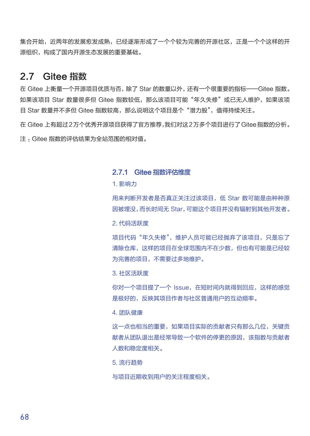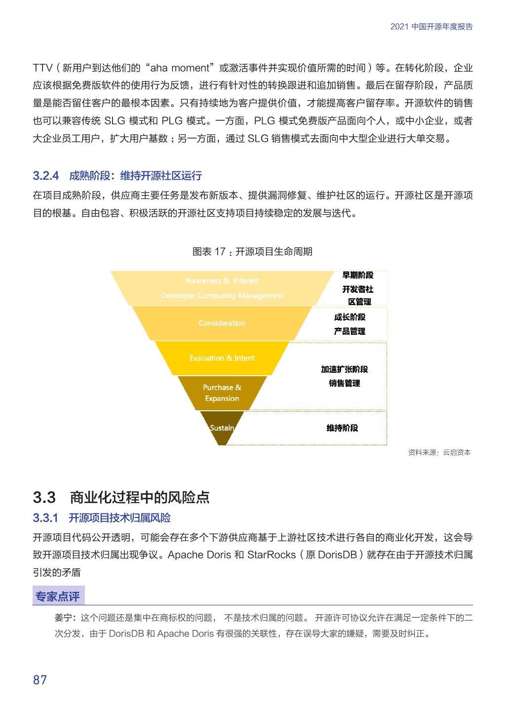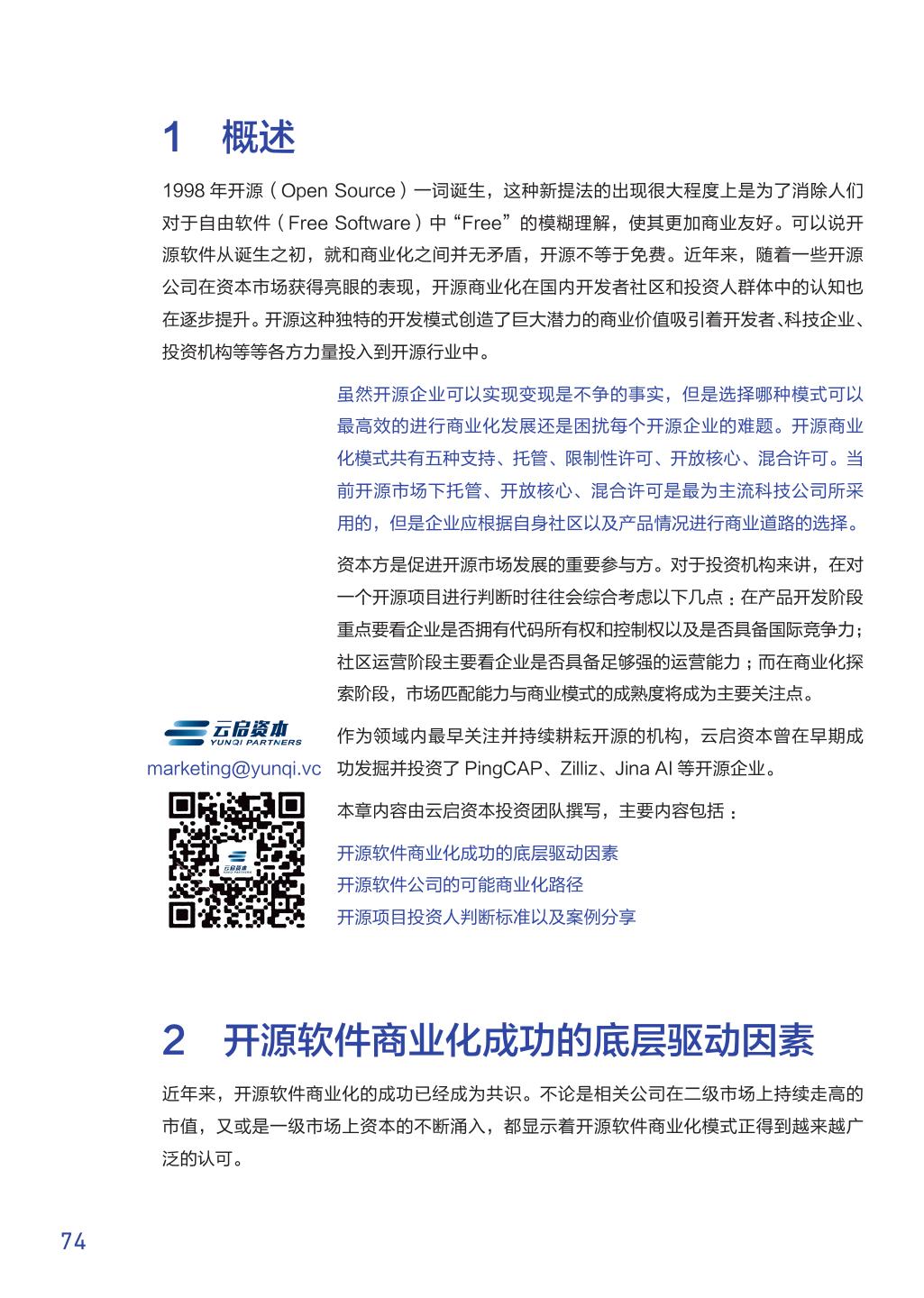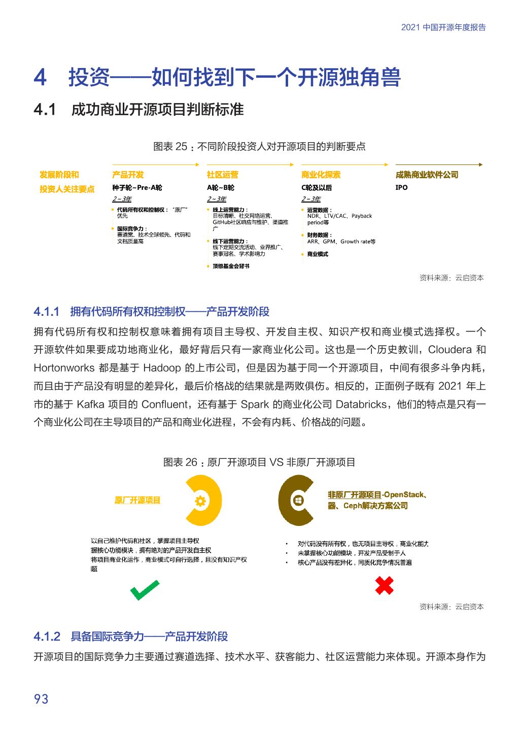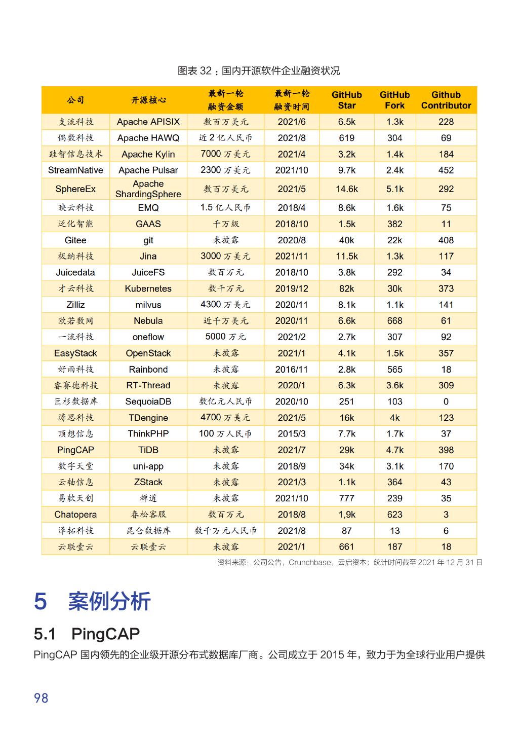 6 . 2.4 新增开源项目领域分布… …………………………………………………………………………… 66 2.5 年度最受开发者关注的用户… ……………………………………………………………………… 67 2.6 年度最受开发者关注的组织… ……………………………………………………………………… 67 2.7 Gitee 指数… ………………………………………………………………………………………… 68 2.8 开源安全与合规… …………………………………………………………………………………… 70 3 总结… ………………………………………………………………………………………… 71 2021 中国开源年度报告商业化篇…………………………………………… 73 1 概述… ………………………………………………………………………………………… 74 2 开源软件商业化成功的底层驱动因素… …………………………………………………… 74 2.1 开源商业模式验证… ………………………………………………………………………………… 75 2.2 开源模式商业优势… ………………………………………………………………………………… 76 2.3 开源软件商业化模式发展历程… …………………………………………………………………… 80 3 开源软件公司商业化路径选择… …………………………………………………………… 83 3.1 开源软件商业化可以选择的路径和案例… ………………………………………………………… 84 3.2 开源项目的 life cycle 以及软件供应商在对应阶段的重点工作… ……………………………… 85 3.3 商业化过程中的风险点… …………………………………………………………………………… 87 4 投资——如何找到下一个开源独角兽… …………………………………………………… 93 4.1 成功商业开源项目判断标准… ……………………………………………………………………… 93 4.2 中国开源市场… ……………………………………………………………………………………… 96 4.3 资本市场上投资人对开源领域布局力度加大… …………………………………………………… 97 5 案例分析… …………………………………………………………………………………… 98 5.1 PingCAP……………………………………………………………………………………………… 98 5.2 GitLab… ……………………………………………………………………………………………… 100 5.3 Jina AI………………………………………………………………………………………………… 102 5.4 Zilliz… ………………………………………………………………………………………………… 103 5.5 EMQ 映云科技… …………………………………………………………………………………… 104 5.6 AppFlowy… ………………………………………………………………………………………… 105 5.7 Confluent… ………………………………………………………………………………………… 107 5.8 MongoDB… ………………………………………………………………………………………… 108 6