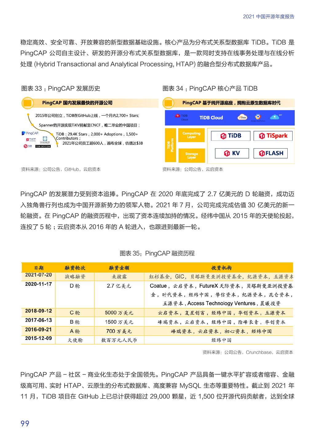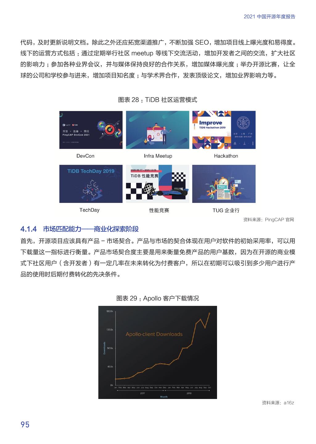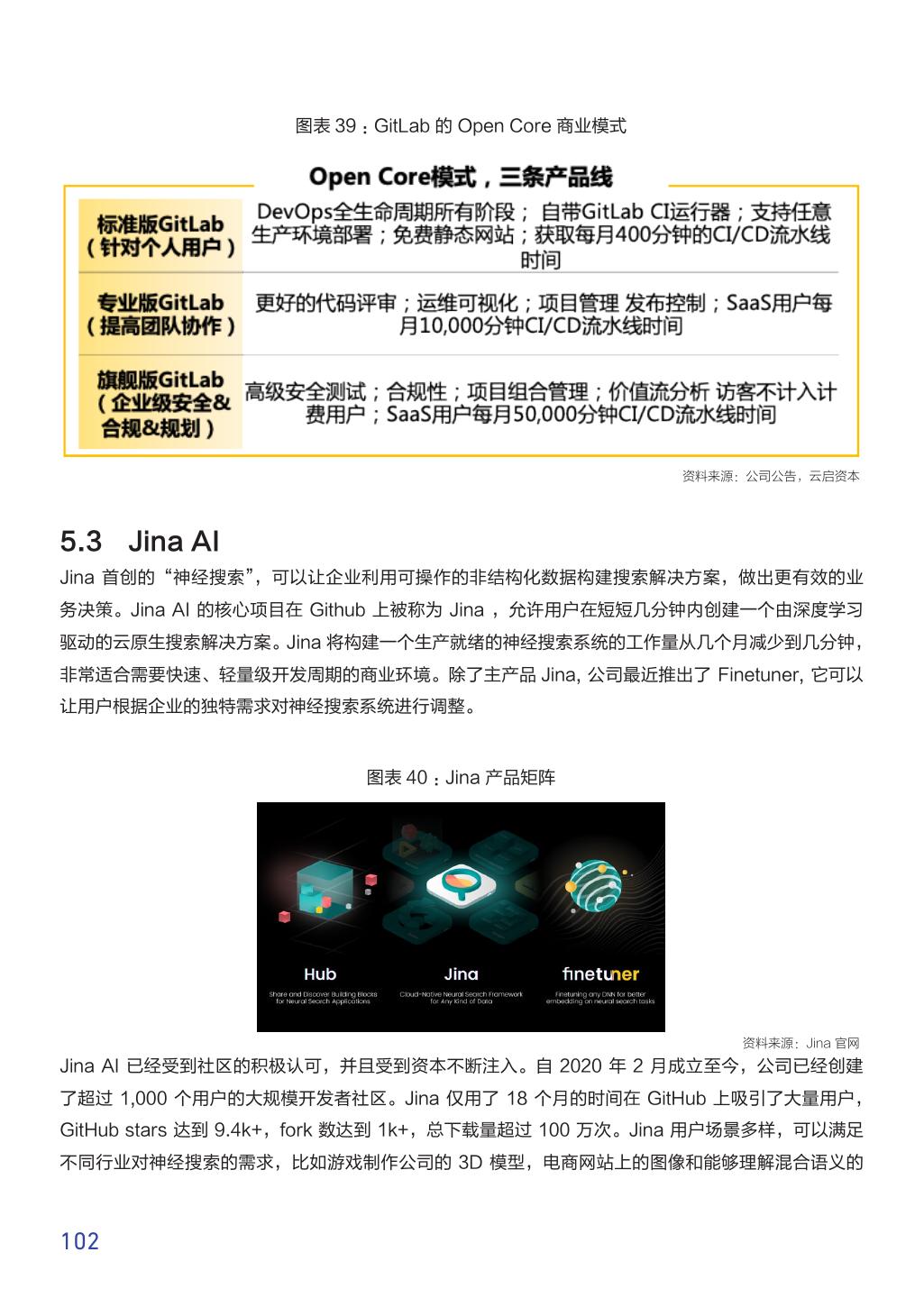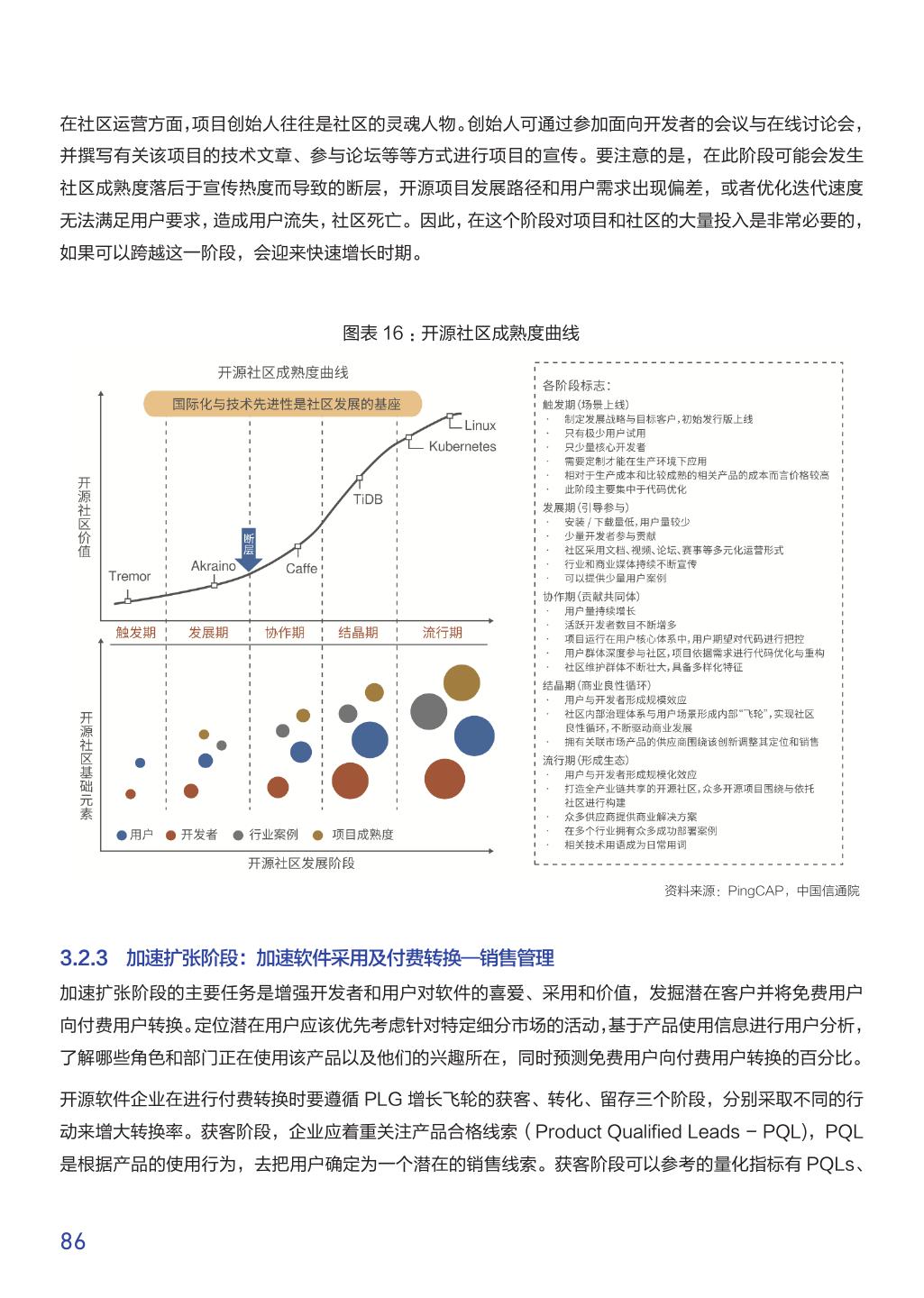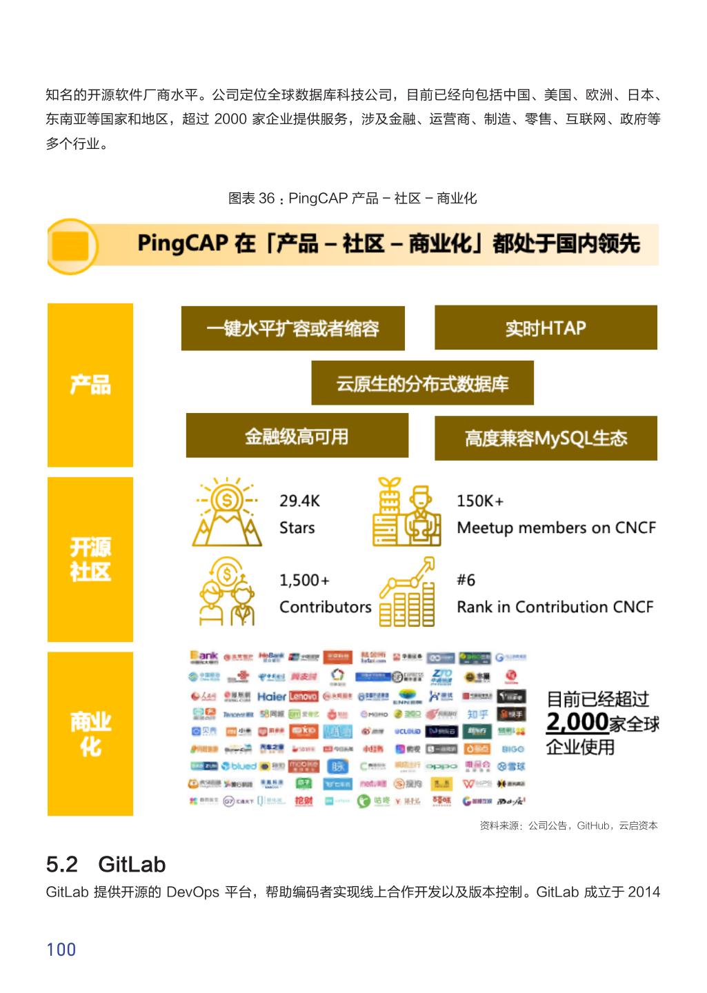 6 . 2.4 新增开源项目领域分布… …………………………………………………………………………… 66 2.5 年度最受开发者关注的用户… ……………………………………………………………………… 67 2.6 年度最受开发者关注的组织… ……………………………………………………………………… 67 2.7 Gitee 指数… ………………………………………………………………………………………… 68 2.8 开源安全与合规… …………………………………………………………………………………… 70 3 总结… ………………………………………………………………………………………… 71 2021 中国开源年度报告商业化篇…………………………………………… 73 1 概述… ………………………………………………………………………………………… 74 2 开源软件商业化成功的底层驱动因素… …………………………………………………… 74 2.1 开源商业模式验证… ………………………………………………………………………………… 75 2.2 开源模式商业优势… ………………………………………………………………………………… 76 2.3 开源软件商业化模式发展历程… …………………………………………………………………… 80 3 开源软件公司商业化路径选择… …………………………………………………………… 83 3.1 开源软件商业化可以选择的路径和案例… ………………………………………………………… 84 3.2 开源项目的 life cycle 以及软件供应商在对应阶段的重点工作… ……………………………… 85 3.3 商业化过程中的风险点… …………………………………………………………………………… 87 4 投资——如何找到下一个开源独角兽… …………………………………………………… 93 4.1 成功商业开源项目判断标准… ……………………………………………………………………… 93 4.2 中国开源市场… ……………………………………………………………………………………… 96 4.3 资本市场上投资人对开源领域布局力度加大… …………………………………………………… 97 5 案例分析… …………………………………………………………………………………… 98 5.1 PingCAP……………………………………………………………………………………………… 98 5.2 GitLab… ……………………………………………………………………………………………… 100 5.3 Jina AI………………………………………………………………………………………………… 102 5.4 Zilliz… ………………………………………………………………………………………………… 103 5.5 EMQ 映云科技… …………………………………………………………………………………… 104 5.6 AppFlowy… ………………………………………………………………………………………… 105 5.7 Confluent… ………………………………………………………………………………………… 107 5.8 MongoDB… ………………………………………………………………………………………… 108 6