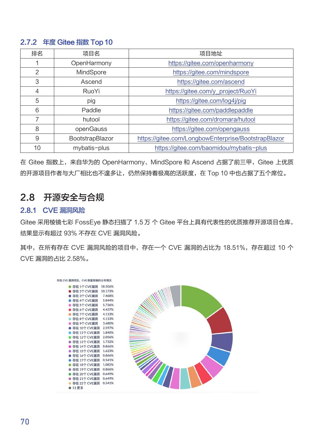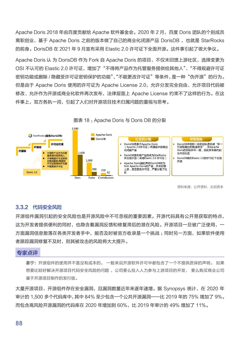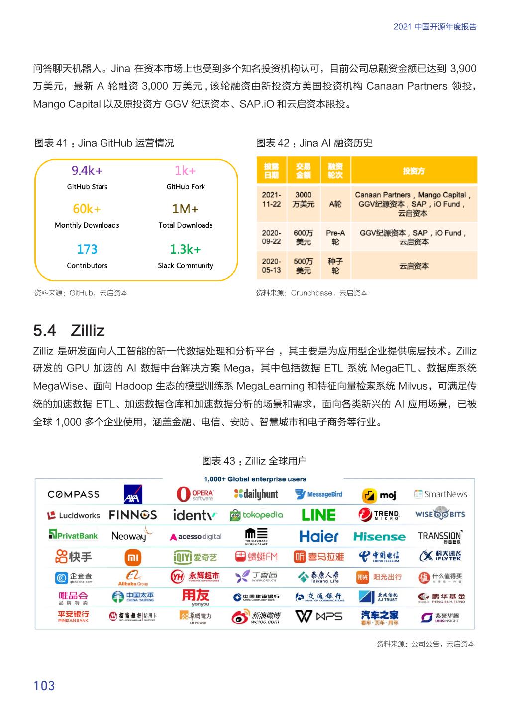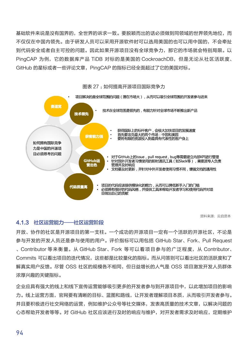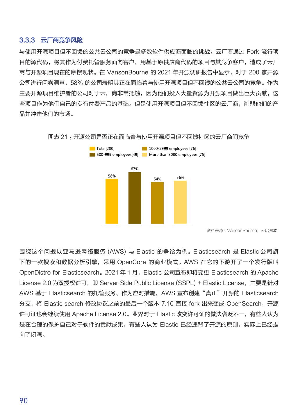 6 . 2.4 新增开源项目领域分布… …………………………………………………………………………… 66 2.5 年度最受开发者关注的用户… ……………………………………………………………………… 67 2.6 年度最受开发者关注的组织… ……………………………………………………………………… 67 2.7 Gitee 指数… ………………………………………………………………………………………… 68 2.8 开源安全与合规… …………………………………………………………………………………… 70 3 总结… ………………………………………………………………………………………… 71 2021 中国开源年度报告商业化篇…………………………………………… 73 1 概述… ………………………………………………………………………………………… 74 2 开源软件商业化成功的底层驱动因素… …………………………………………………… 74 2.1 开源商业模式验证… ………………………………………………………………………………… 75 2.2 开源模式商业优势… ………………………………………………………………………………… 76 2.3 开源软件商业化模式发展历程… …………………………………………………………………… 80 3 开源软件公司商业化路径选择… …………………………………………………………… 83 3.1 开源软件商业化可以选择的路径和案例… ………………………………………………………… 84 3.2 开源项目的 life cycle 以及软件供应商在对应阶段的重点工作… ……………………………… 85 3.3 商业化过程中的风险点… …………………………………………………………………………… 87 4 投资——如何找到下一个开源独角兽… …………………………………………………… 93 4.1 成功商业开源项目判断标准… ……………………………………………………………………… 93 4.2 中国开源市场… ……………………………………………………………………………………… 96 4.3 资本市场上投资人对开源领域布局力度加大… …………………………………………………… 97 5 案例分析… …………………………………………………………………………………… 98 5.1 PingCAP……………………………………………………………………………………………… 98 5.2 GitLab… ……………………………………………………………………………………………… 100 5.3 Jina AI………………………………………………………………………………………………… 102 5.4 Zilliz… ………………………………………………………………………………………………… 103 5.5 EMQ 映云科技… …………………………………………………………………………………… 104 5.6 AppFlowy… ………………………………………………………………………………………… 105 5.7 Confluent… ………………………………………………………………………………………… 107 5.8 MongoDB… ………………………………………………………………………………………… 108 6