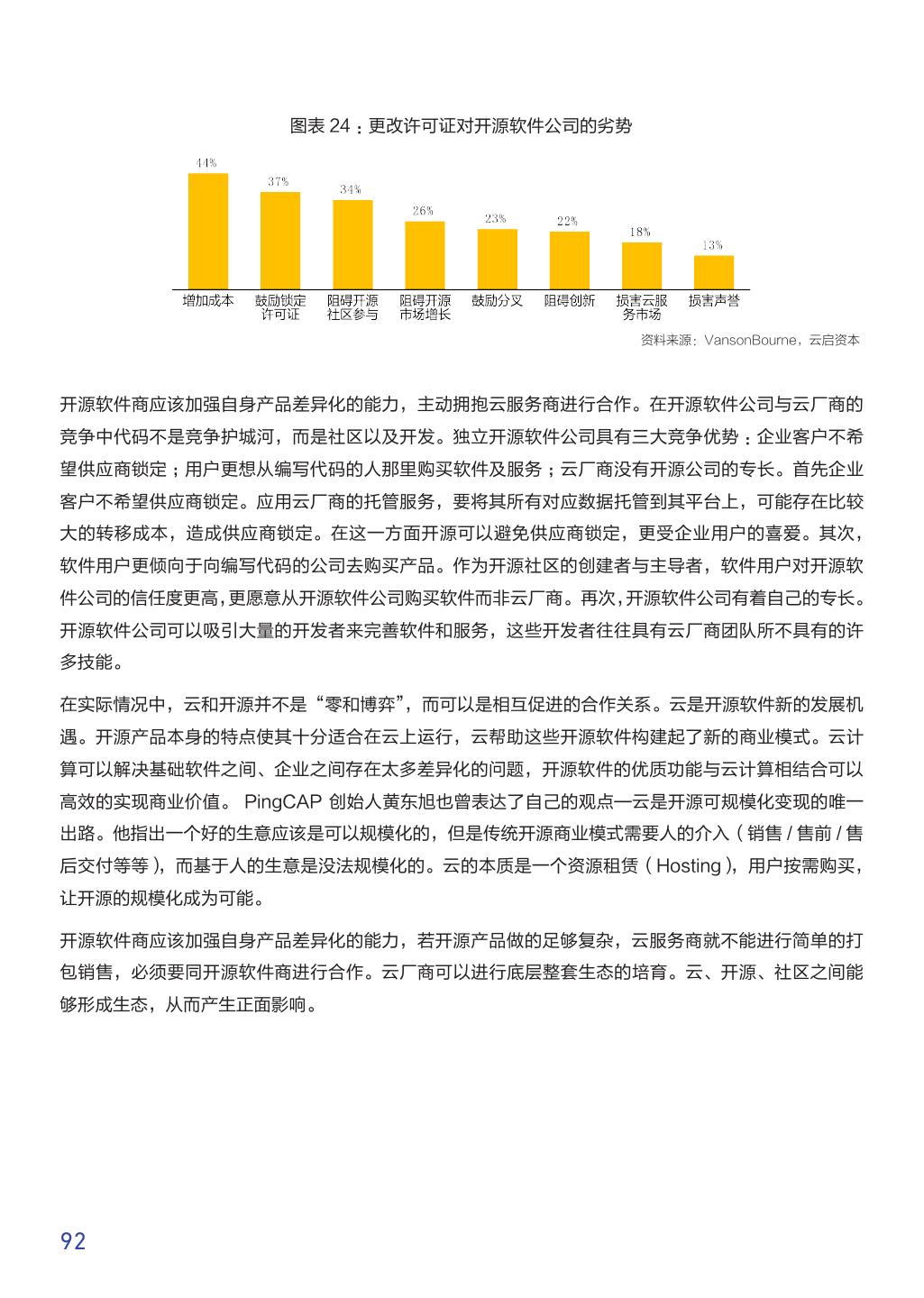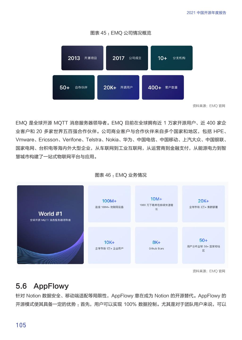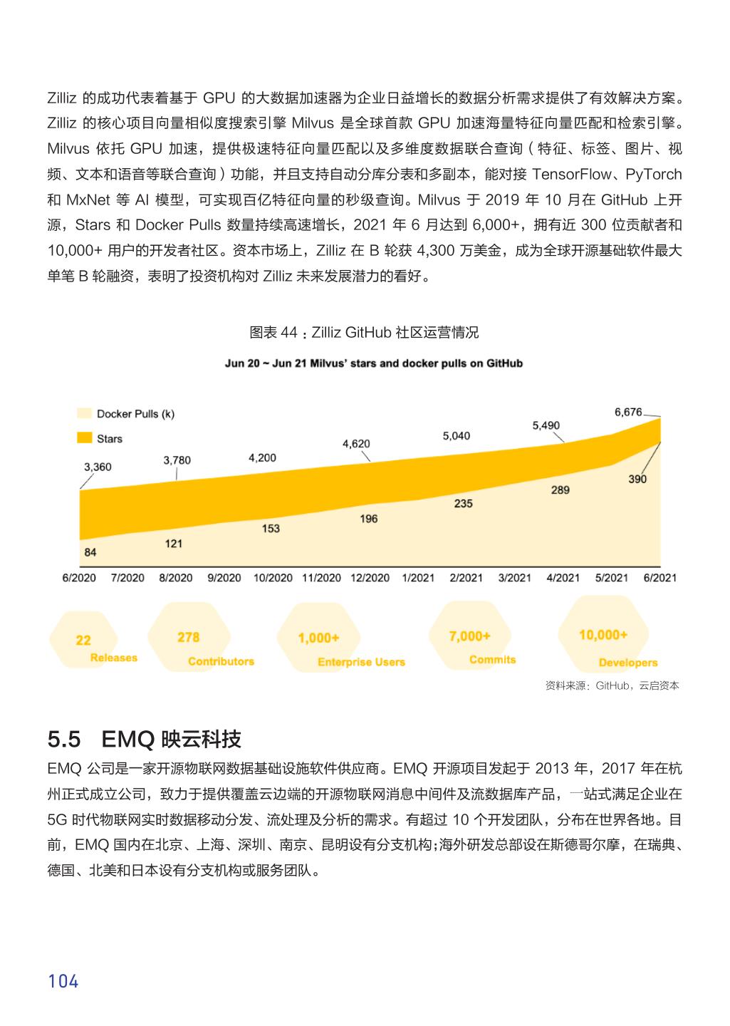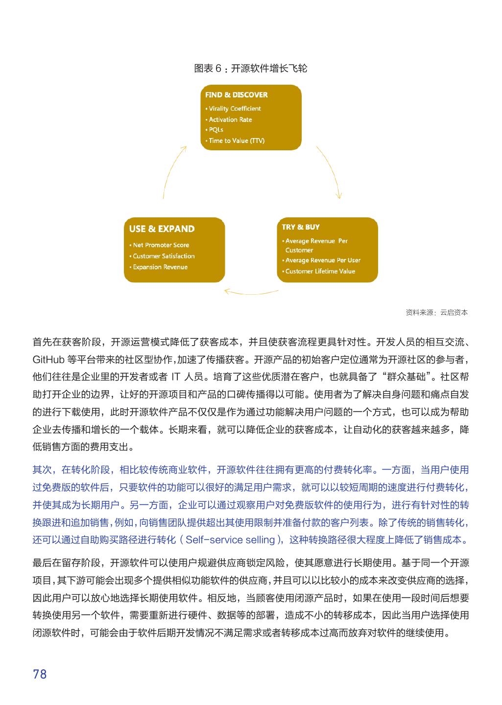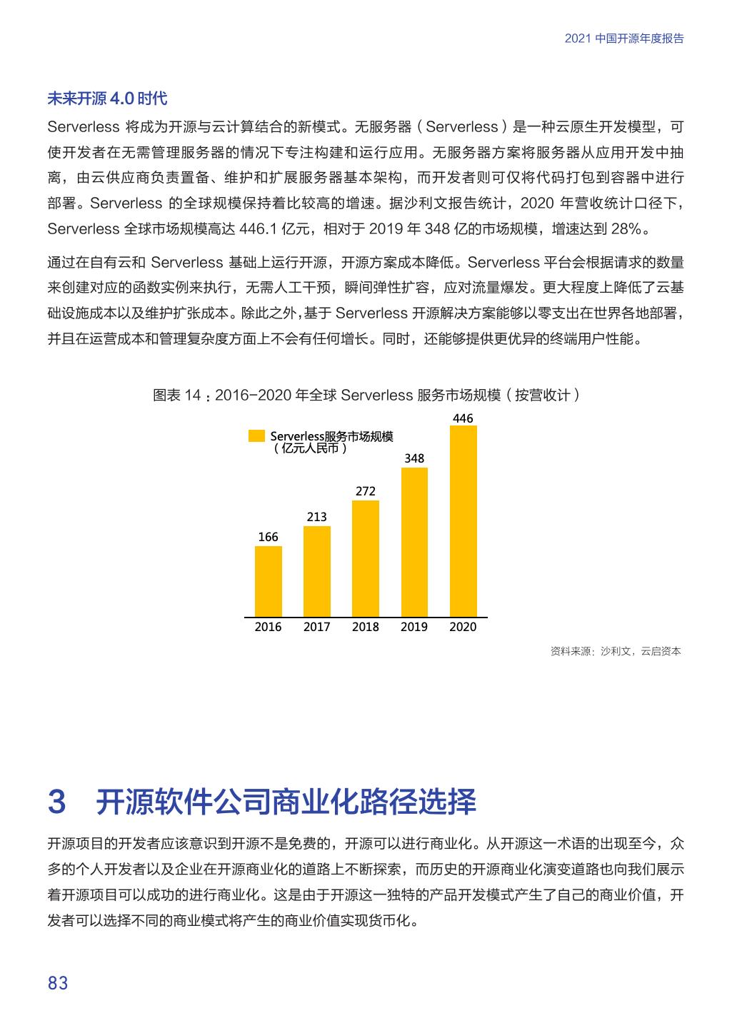 6 . 2.4 新增开源项目领域分布… …………………………………………………………………………… 66 2.5 年度最受开发者关注的用户… ……………………………………………………………………… 67 2.6 年度最受开发者关注的组织… ……………………………………………………………………… 67 2.7 Gitee 指数… ………………………………………………………………………………………… 68 2.8 开源安全与合规… …………………………………………………………………………………… 70 3 总结… ………………………………………………………………………………………… 71 2021 中国开源年度报告商业化篇…………………………………………… 73 1 概述… ………………………………………………………………………………………… 74 2 开源软件商业化成功的底层驱动因素… …………………………………………………… 74 2.1 开源商业模式验证… ………………………………………………………………………………… 75 2.2 开源模式商业优势… ………………………………………………………………………………… 76 2.3 开源软件商业化模式发展历程… …………………………………………………………………… 80 3 开源软件公司商业化路径选择… …………………………………………………………… 83 3.1 开源软件商业化可以选择的路径和案例… ………………………………………………………… 84 3.2 开源项目的 life cycle 以及软件供应商在对应阶段的重点工作… ……………………………… 85 3.3 商业化过程中的风险点… …………………………………………………………………………… 87 4 投资——如何找到下一个开源独角兽… …………………………………………………… 93 4.1 成功商业开源项目判断标准… ……………………………………………………………………… 93 4.2 中国开源市场… ……………………………………………………………………………………… 96 4.3 资本市场上投资人对开源领域布局力度加大… …………………………………………………… 97 5 案例分析… …………………………………………………………………………………… 98 5.1 PingCAP……………………………………………………………………………………………… 98 5.2 GitLab… ……………………………………………………………………………………………… 100 5.3 Jina AI………………………………………………………………………………………………… 102 5.4 Zilliz… ………………………………………………………………………………………………… 103 5.5 EMQ 映云科技… …………………………………………………………………………………… 104 5.6 AppFlowy… ………………………………………………………………………………………… 105 5.7 Confluent… ………………………………………………………………………………………… 107 5.8 MongoDB… ………………………………………………………………………………………… 108 6