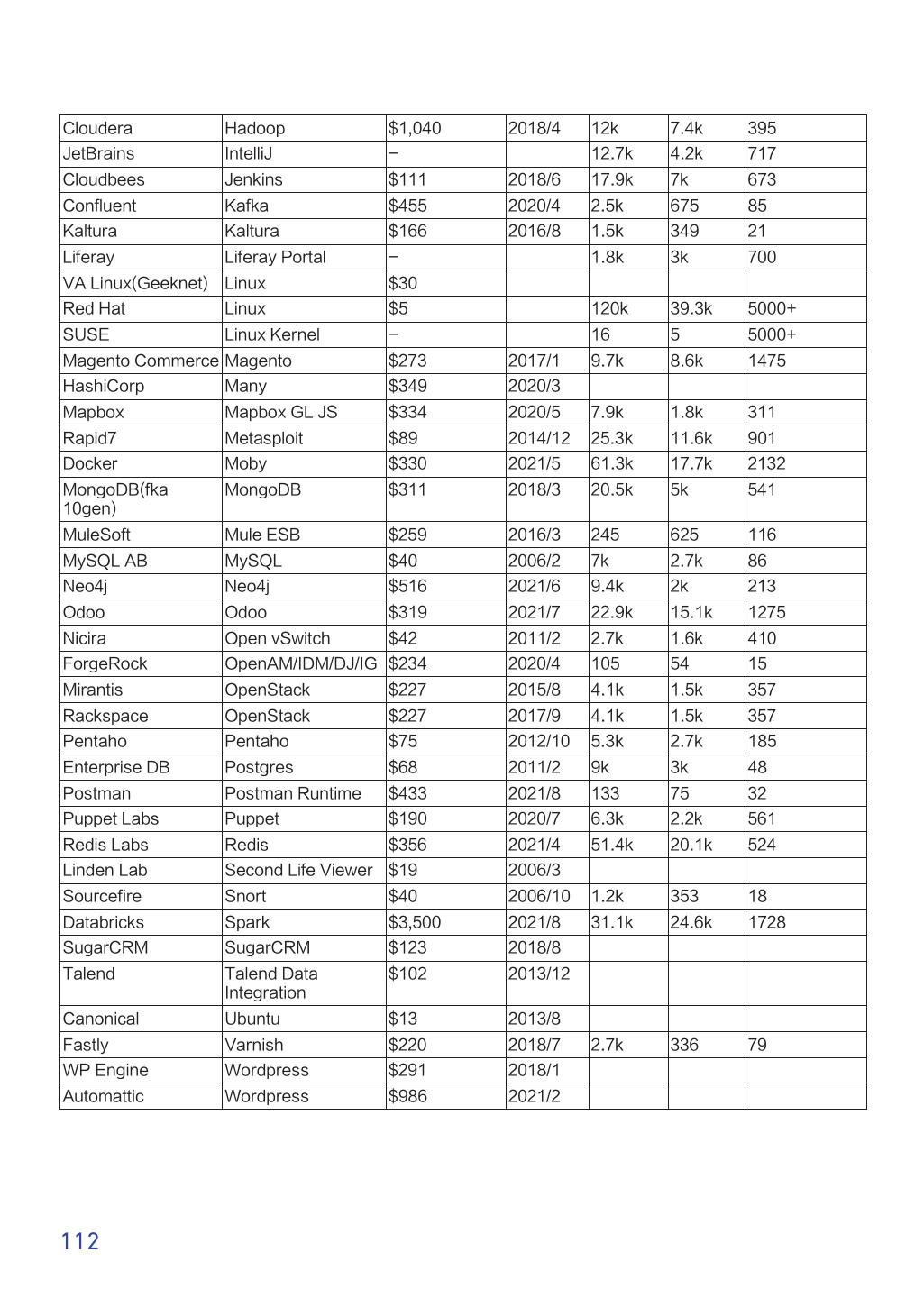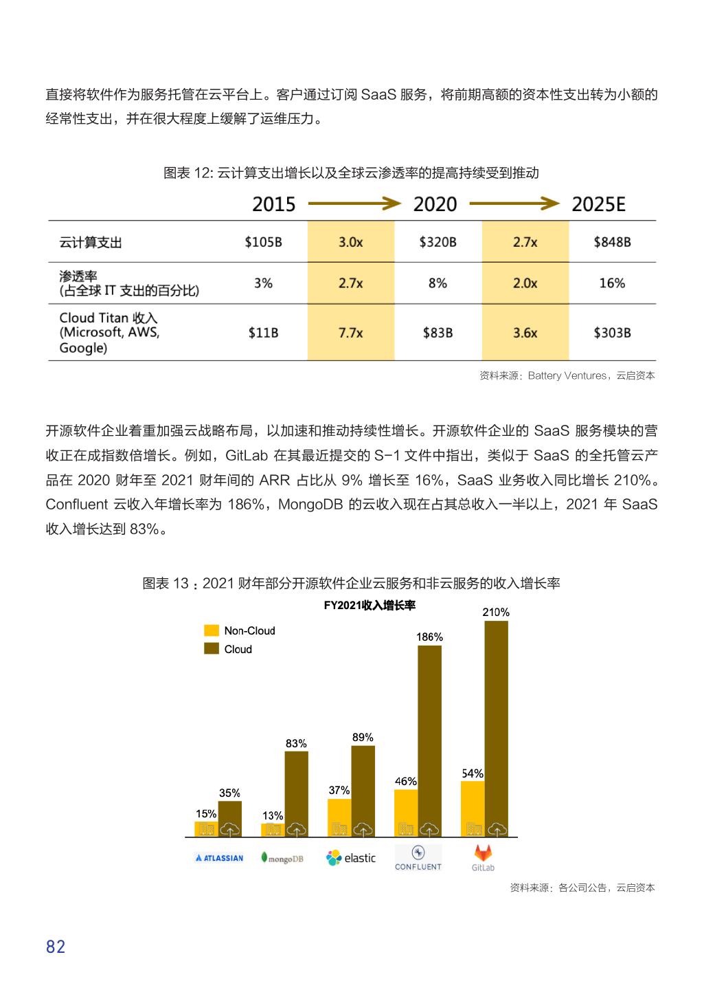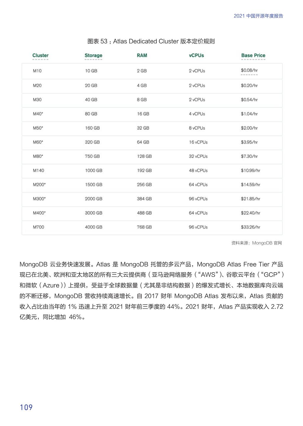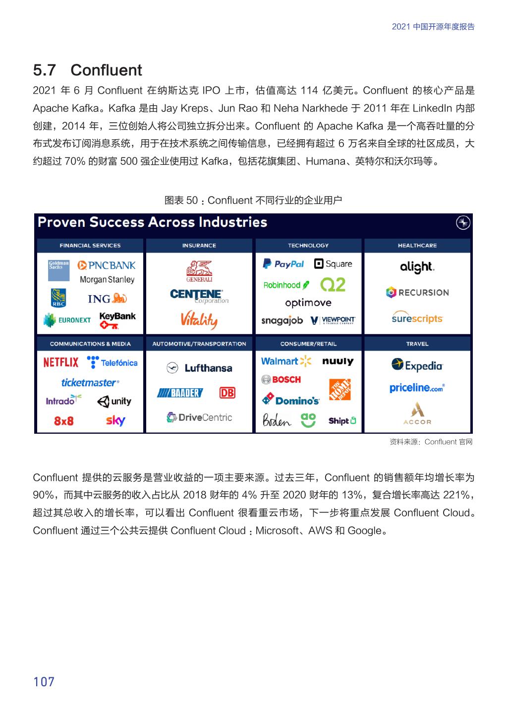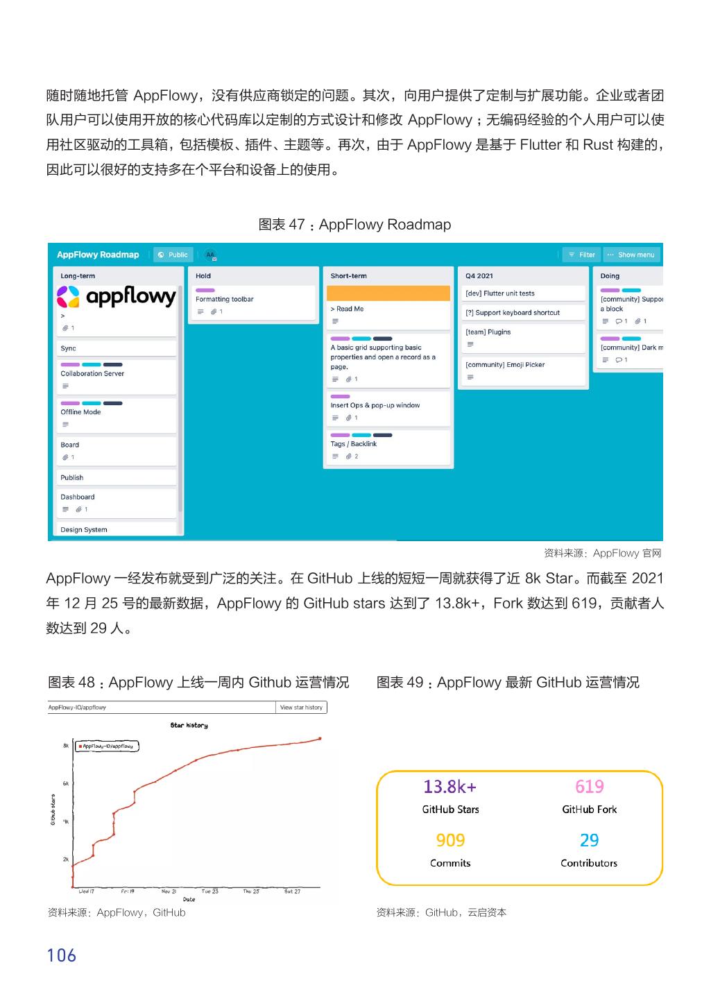 6 . 2.4 新增开源项目领域分布… …………………………………………………………………………… 66 2.5 年度最受开发者关注的用户… ……………………………………………………………………… 67 2.6 年度最受开发者关注的组织… ……………………………………………………………………… 67 2.7 Gitee 指数… ………………………………………………………………………………………… 68 2.8 开源安全与合规… …………………………………………………………………………………… 70 3 总结… ………………………………………………………………………………………… 71 2021 中国开源年度报告商业化篇…………………………………………… 73 1 概述… ………………………………………………………………………………………… 74 2 开源软件商业化成功的底层驱动因素… …………………………………………………… 74 2.1 开源商业模式验证… ………………………………………………………………………………… 75 2.2 开源模式商业优势… ………………………………………………………………………………… 76 2.3 开源软件商业化模式发展历程… …………………………………………………………………… 80 3 开源软件公司商业化路径选择… …………………………………………………………… 83 3.1 开源软件商业化可以选择的路径和案例… ………………………………………………………… 84 3.2 开源项目的 life cycle 以及软件供应商在对应阶段的重点工作… ……………………………… 85 3.3 商业化过程中的风险点… …………………………………………………………………………… 87 4 投资——如何找到下一个开源独角兽… …………………………………………………… 93 4.1 成功商业开源项目判断标准… ……………………………………………………………………… 93 4.2 中国开源市场… ……………………………………………………………………………………… 96 4.3 资本市场上投资人对开源领域布局力度加大… …………………………………………………… 97 5 案例分析… …………………………………………………………………………………… 98 5.1 PingCAP……………………………………………………………………………………………… 98 5.2 GitLab… ……………………………………………………………………………………………… 100 5.3 Jina AI………………………………………………………………………………………………… 102 5.4 Zilliz… ………………………………………………………………………………………………… 103 5.5 EMQ 映云科技… …………………………………………………………………………………… 104 5.6 AppFlowy… ………………………………………………………………………………………… 105 5.7 Confluent… ………………………………………………………………………………………… 107 5.8 MongoDB… ………………………………………………………………………………………… 108 6