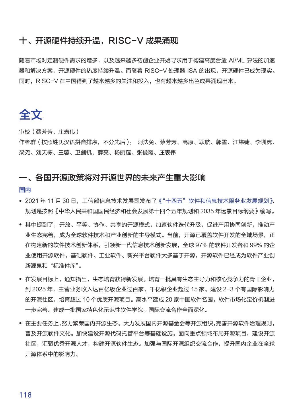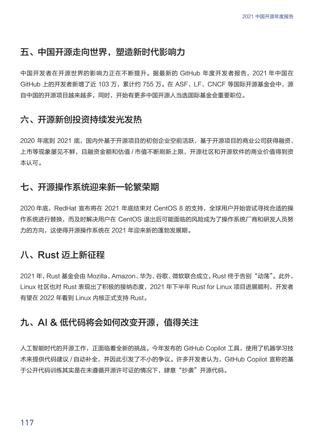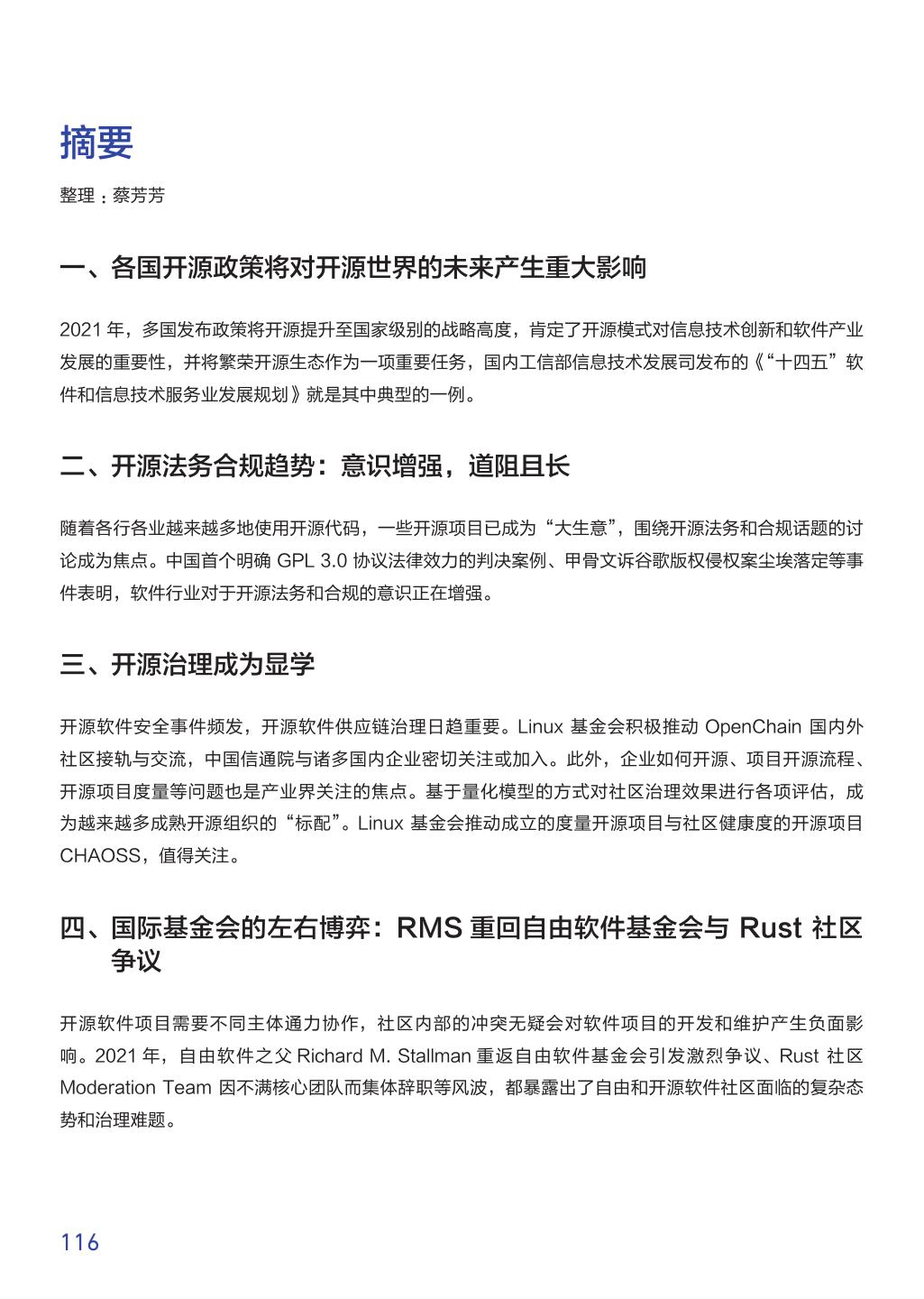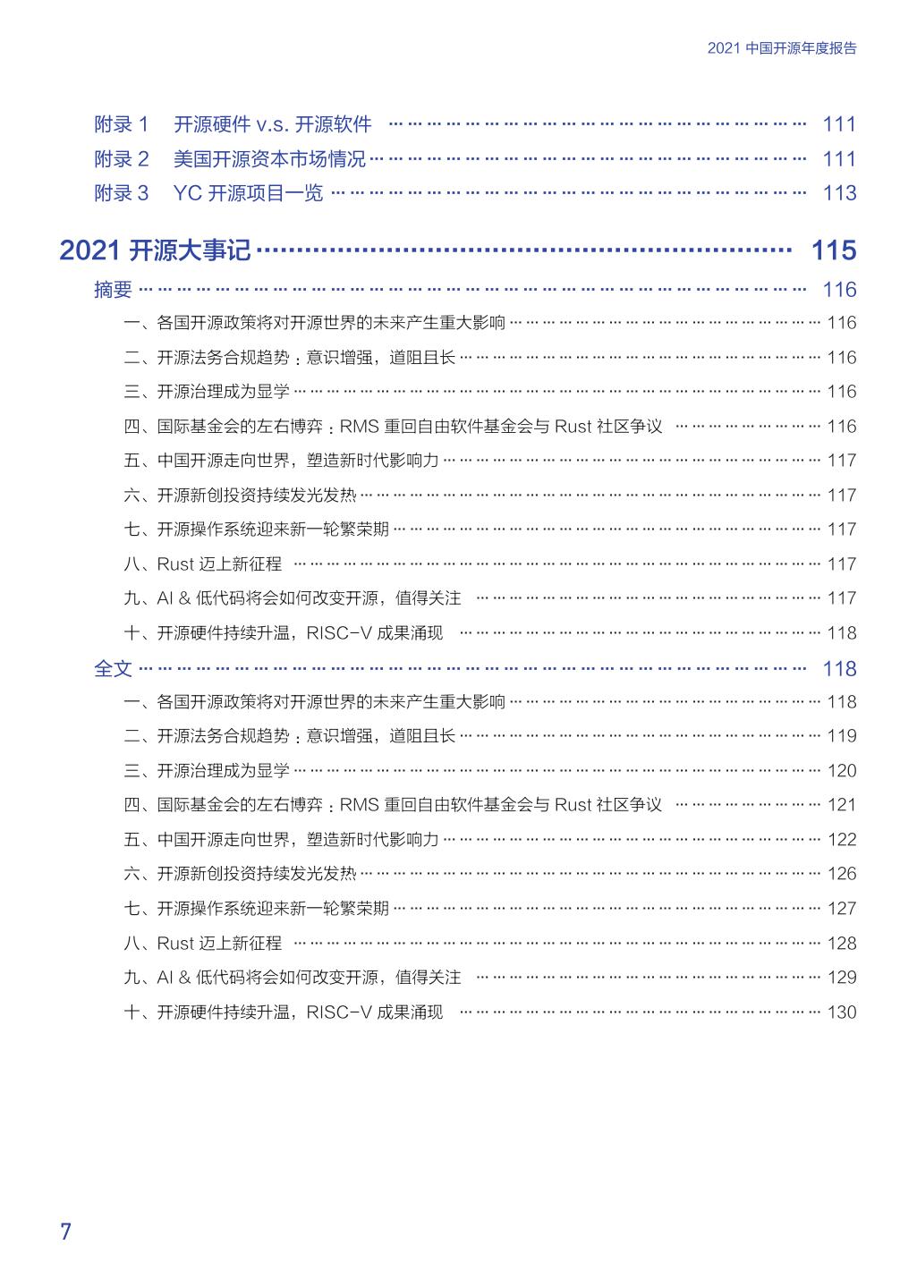 7 . 2021 中国开源年度报告 附录 1 开源硬件 v.s. 开源软件… ………………………………………………………… 111 附录 2 美国开源资本市场情况……………………………………………………………… 111 附录 3 YC 开源项目一览…………………………………………………………………… 113 2021 开源大事记…………………………………………………………… 115 摘要……………………………………………………………………………………………… 116 一、各国开源政策将对开源世界的未来产生重大影响…………………………………………………… 116 二、开源法务合规趋势 :意识增强,道阻且长…………………………………………………………… 116 三、开源治理成为显学……………………………………………………………………………………… 116 四、国际基金会的左右博弈 :RMS 重回自由软件基金会与 Rust 社区争议… ……………………… 116 五、中国开源走向世界,塑造新时代影响力……………………………………………………………… 117 六、开源新创投资持续发光发热…………………………………………………………………………… 117 七、开源操作系统迎来新一轮繁荣期……………………………………………………………………… 117 八、Rust 迈上新征程… …………………………………………………………………………………… 117 九、AI & 低代码将会如何改变开源,值得关注… ……………………………………………………… 117 十、开源硬件持续升温,RISC-V 成果涌现… ………………………………………………………… 118 全文……………………………………………………………………………………………… 118 一、各国开源政策将对开源世界的未来产生重大影响…………………………………………………… 118 二、开源法务合规趋势 :意识增强,道阻且长…………………………………………………………… 119 三、开源治理成为显学……………………………………………………………………………………… 120 四、国际基金会的左右博弈 :RMS 重回自由软件基金会与 Rust 社区争议… ……………………… 121 五、中国开源走向世界,塑造新时代影响力……………………………………………………………… 122 六、开源新创投资持续发光发热…………………………………………………………………………… 126 七、开源操作系统迎来新一轮繁荣期……………………………………………………………………… 127 八、Rust 迈上新征程… …………………………………………………………………………………… 128 九、AI & 低代码将会如何改变开源,值得关注… ……………………………………………………… 129 十、开源硬件持续升温,RISC-V 成果涌现… ………………………………………………………… 130 7