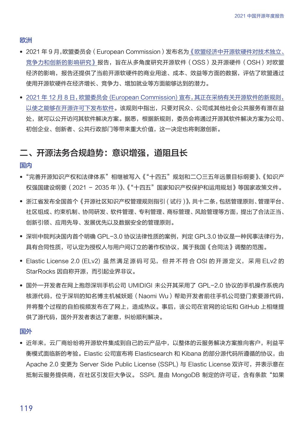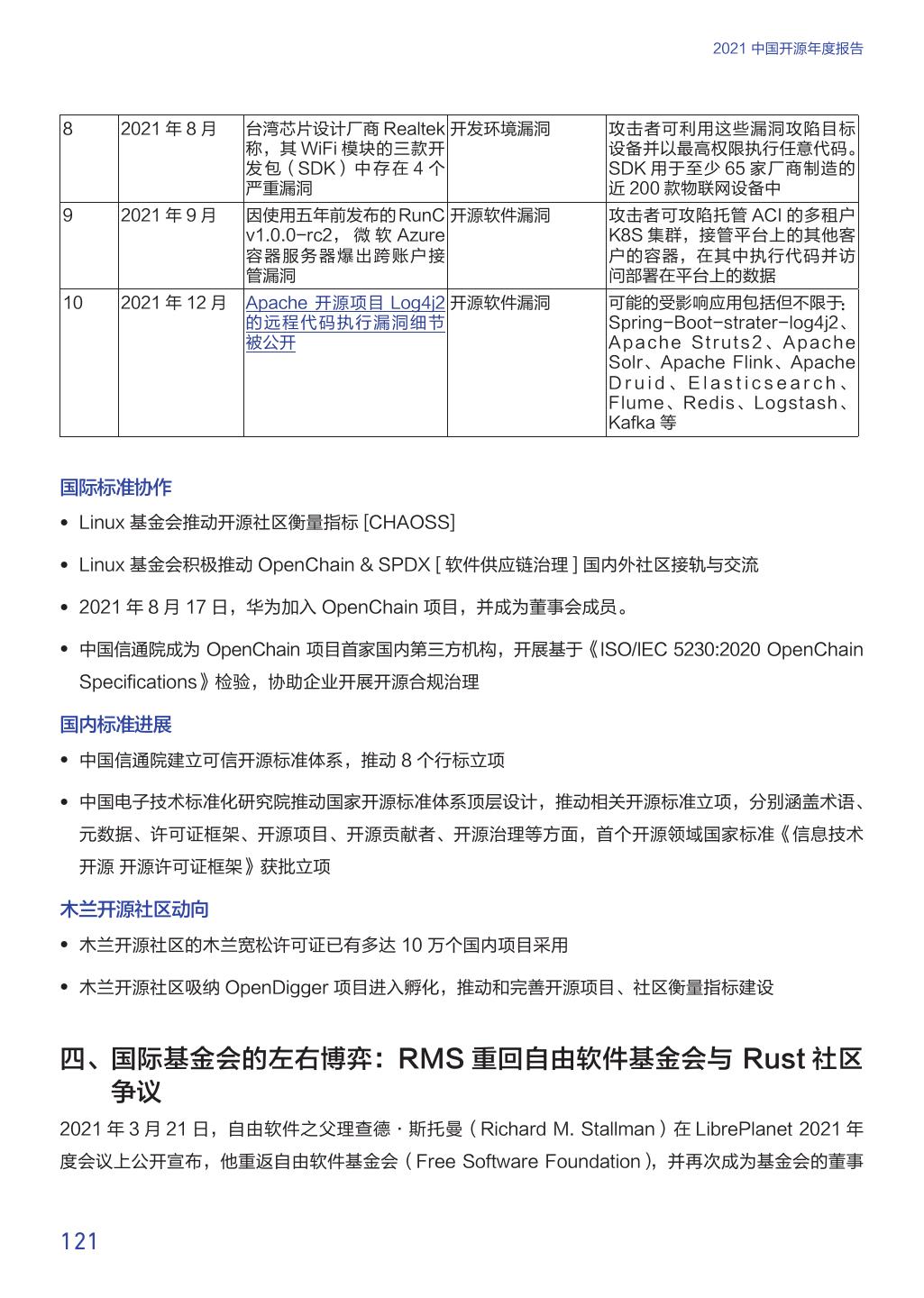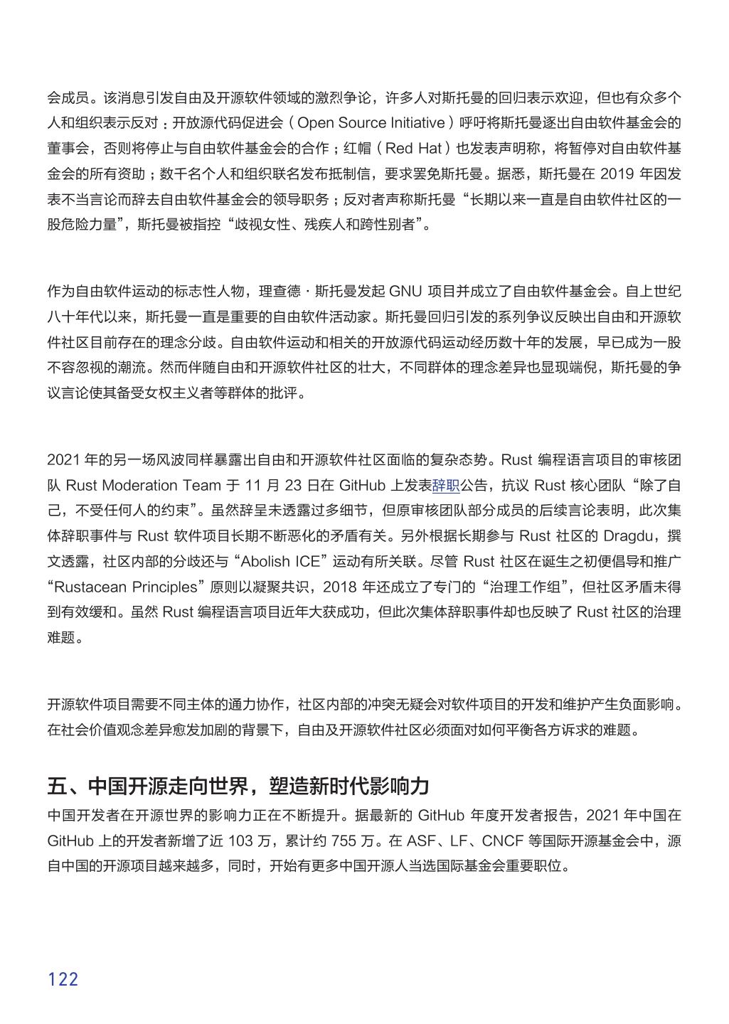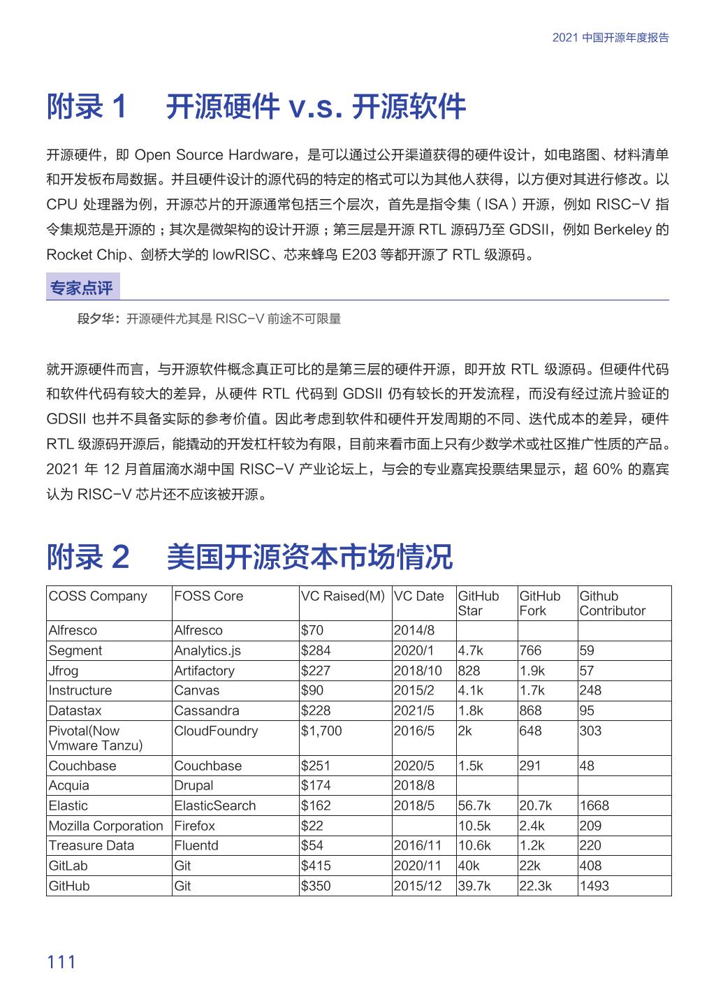 7 . 2021 中国开源年度报告 附录 1 开源硬件 v.s. 开源软件… ………………………………………………………… 111 附录 2 美国开源资本市场情况……………………………………………………………… 111 附录 3 YC 开源项目一览…………………………………………………………………… 113 2021 开源大事记…………………………………………………………… 115 摘要……………………………………………………………………………………………… 116 一、各国开源政策将对开源世界的未来产生重大影响…………………………………………………… 116 二、开源法务合规趋势 :意识增强,道阻且长…………………………………………………………… 116 三、开源治理成为显学……………………………………………………………………………………… 116 四、国际基金会的左右博弈 :RMS 重回自由软件基金会与 Rust 社区争议… ……………………… 116 五、中国开源走向世界,塑造新时代影响力……………………………………………………………… 117 六、开源新创投资持续发光发热…………………………………………………………………………… 117 七、开源操作系统迎来新一轮繁荣期……………………………………………………………………… 117 八、Rust 迈上新征程… …………………………………………………………………………………… 117 九、AI & 低代码将会如何改变开源,值得关注… ……………………………………………………… 117 十、开源硬件持续升温,RISC-V 成果涌现… ………………………………………………………… 118 全文……………………………………………………………………………………………… 118 一、各国开源政策将对开源世界的未来产生重大影响…………………………………………………… 118 二、开源法务合规趋势 :意识增强,道阻且长…………………………………………………………… 119 三、开源治理成为显学……………………………………………………………………………………… 120 四、国际基金会的左右博弈 :RMS 重回自由软件基金会与 Rust 社区争议… ……………………… 121 五、中国开源走向世界,塑造新时代影响力……………………………………………………………… 122 六、开源新创投资持续发光发热…………………………………………………………………………… 126 七、开源操作系统迎来新一轮繁荣期……………………………………………………………………… 127 八、Rust 迈上新征程… …………………………………………………………………………………… 128 九、AI & 低代码将会如何改变开源,值得关注… ……………………………………………………… 129 十、开源硬件持续升温,RISC-V 成果涌现… ………………………………………………………… 130 7