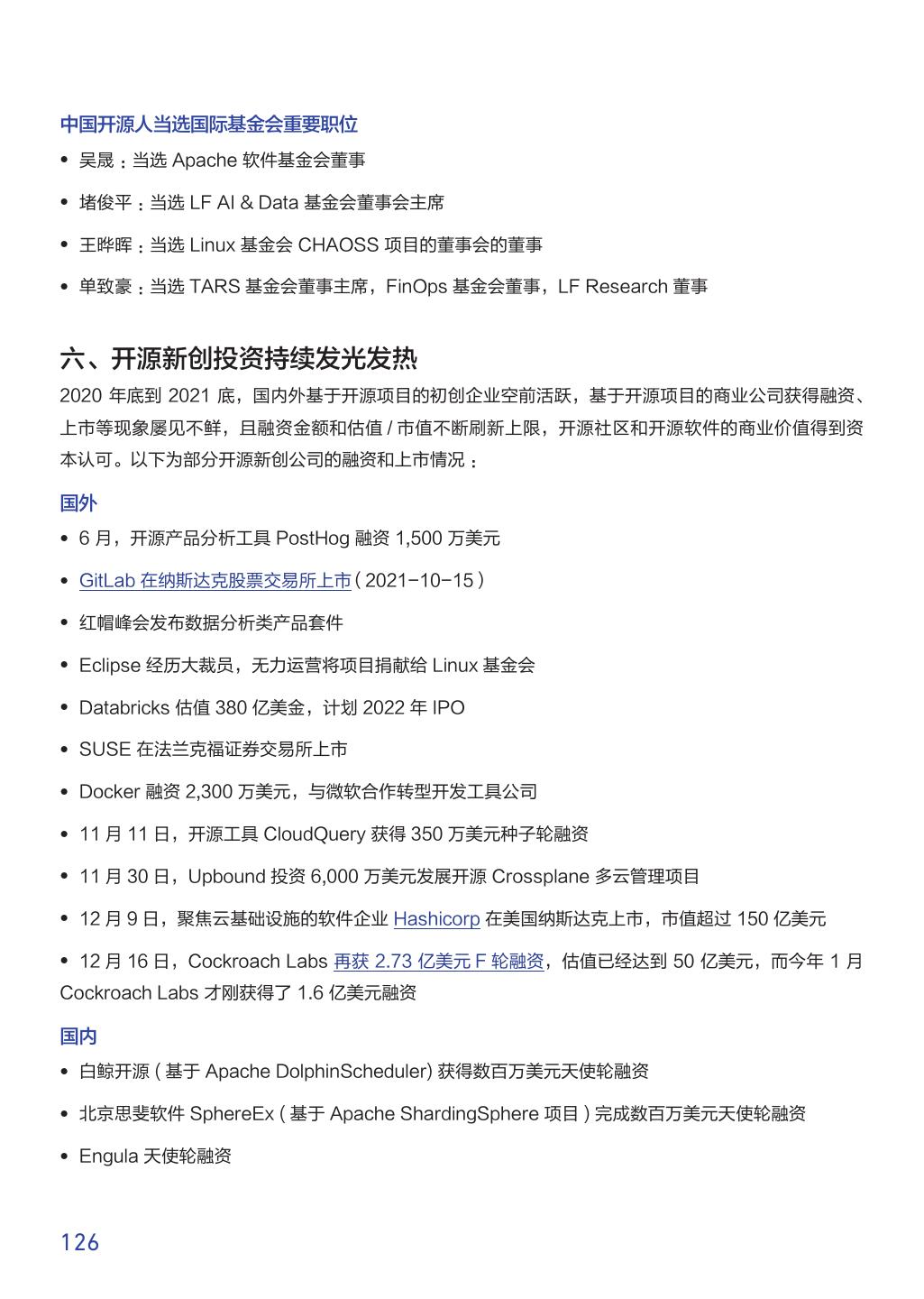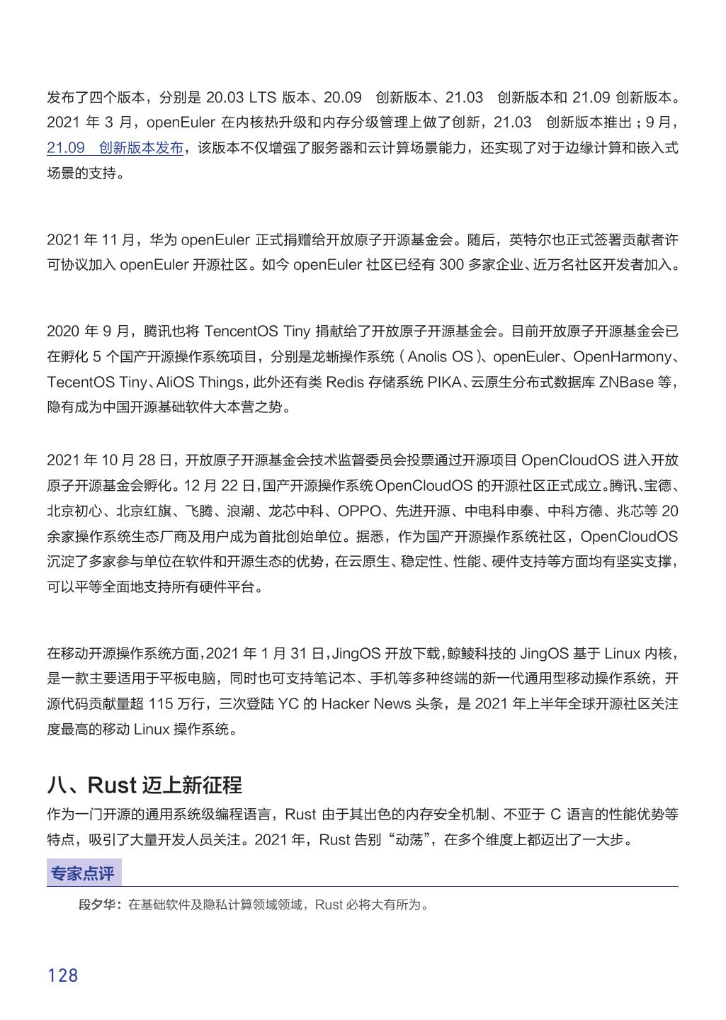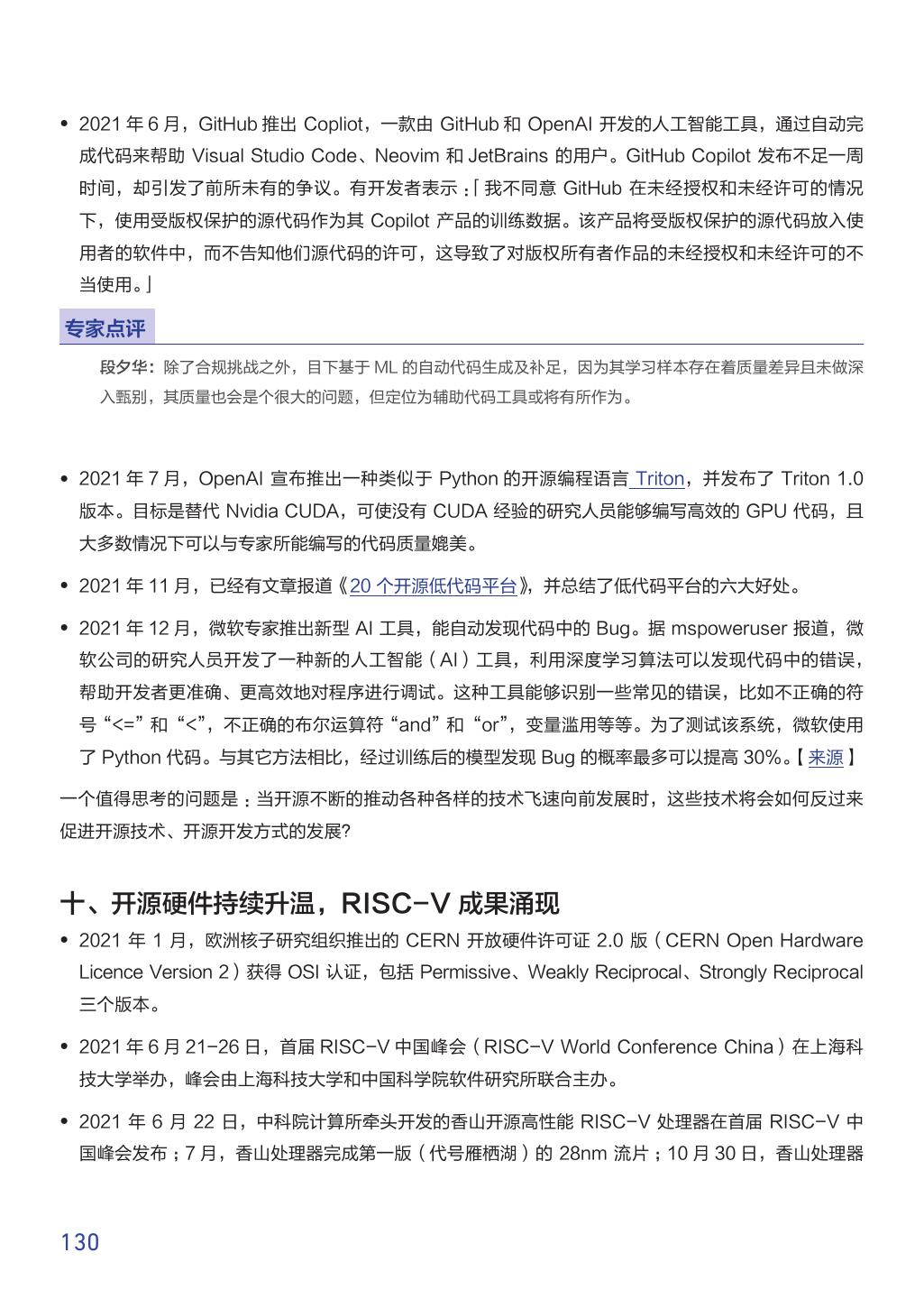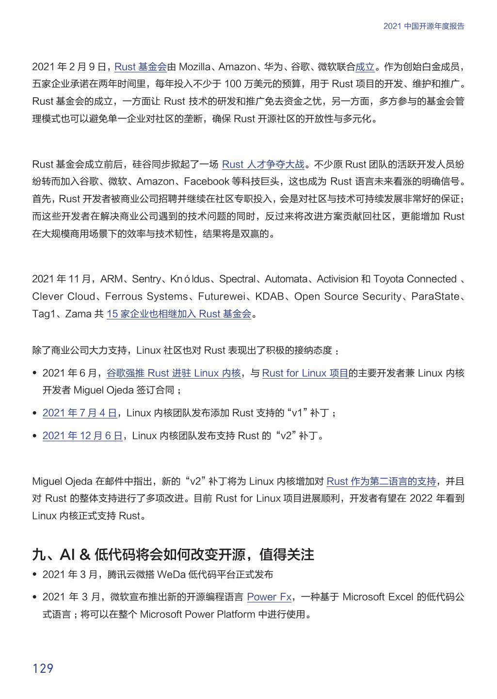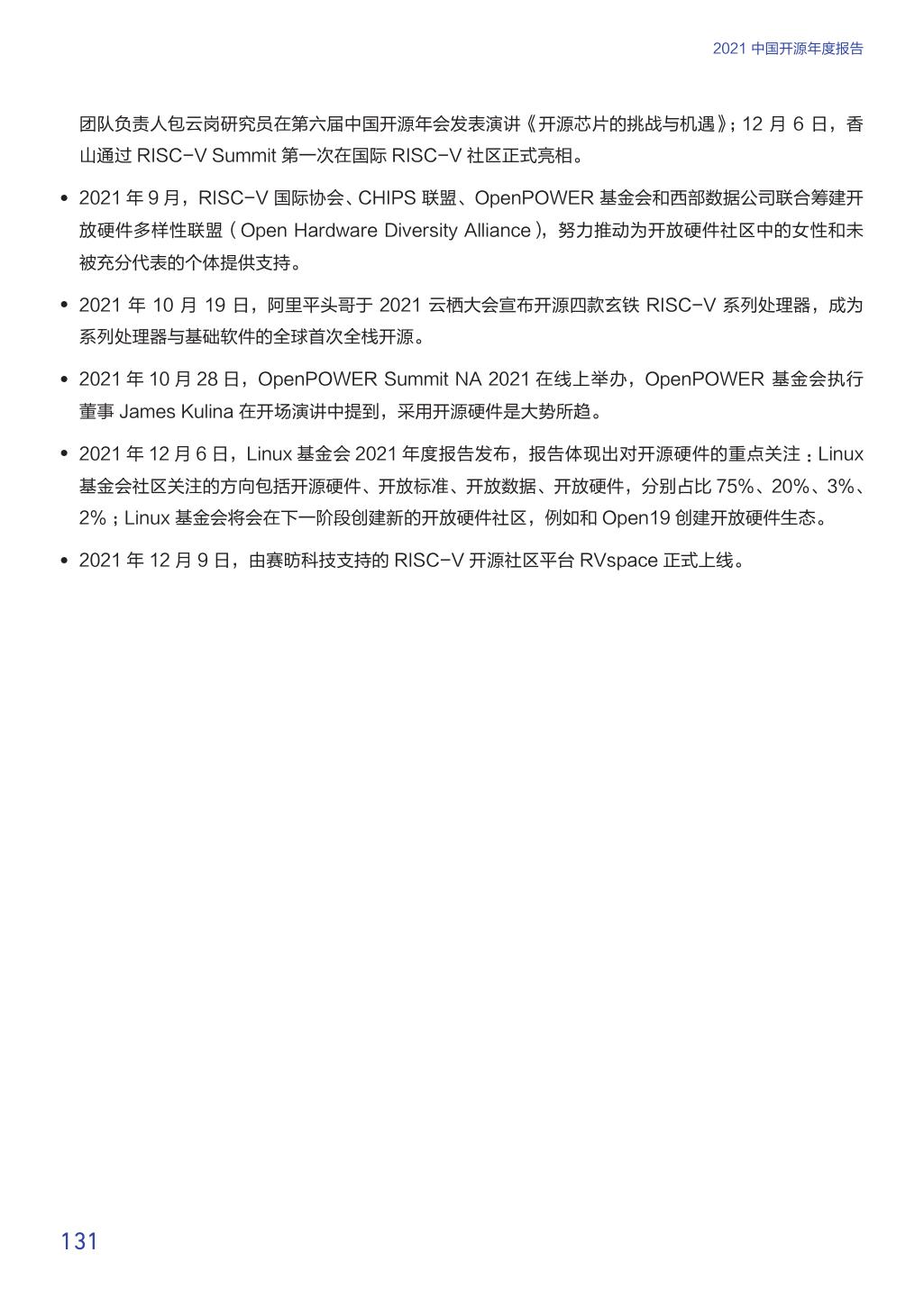 7 . 2021 中国开源年度报告 附录 1 开源硬件 v.s. 开源软件… ………………………………………………………… 111 附录 2 美国开源资本市场情况……………………………………………………………… 111 附录 3 YC 开源项目一览…………………………………………………………………… 113 2021 开源大事记…………………………………………………………… 115 摘要……………………………………………………………………………………………… 116 一、各国开源政策将对开源世界的未来产生重大影响…………………………………………………… 116 二、开源法务合规趋势 :意识增强,道阻且长…………………………………………………………… 116 三、开源治理成为显学……………………………………………………………………………………… 116 四、国际基金会的左右博弈 :RMS 重回自由软件基金会与 Rust 社区争议… ……………………… 116 五、中国开源走向世界,塑造新时代影响力……………………………………………………………… 117 六、开源新创投资持续发光发热…………………………………………………………………………… 117 七、开源操作系统迎来新一轮繁荣期……………………………………………………………………… 117 八、Rust 迈上新征程… …………………………………………………………………………………… 117 九、AI & 低代码将会如何改变开源,值得关注… ……………………………………………………… 117 十、开源硬件持续升温,RISC-V 成果涌现… ………………………………………………………… 118 全文……………………………………………………………………………………………… 118 一、各国开源政策将对开源世界的未来产生重大影响…………………………………………………… 118 二、开源法务合规趋势 :意识增强,道阻且长…………………………………………………………… 119 三、开源治理成为显学……………………………………………………………………………………… 120 四、国际基金会的左右博弈 :RMS 重回自由软件基金会与 Rust 社区争议… ……………………… 121 五、中国开源走向世界,塑造新时代影响力……………………………………………………………… 122 六、开源新创投资持续发光发热…………………………………………………………………………… 126 七、开源操作系统迎来新一轮繁荣期……………………………………………………………………… 127 八、Rust 迈上新征程… …………………………………………………………………………………… 128 九、AI & 低代码将会如何改变开源,值得关注… ……………………………………………………… 129 十、开源硬件持续升温,RISC-V 成果涌现… ………………………………………………………… 130 7