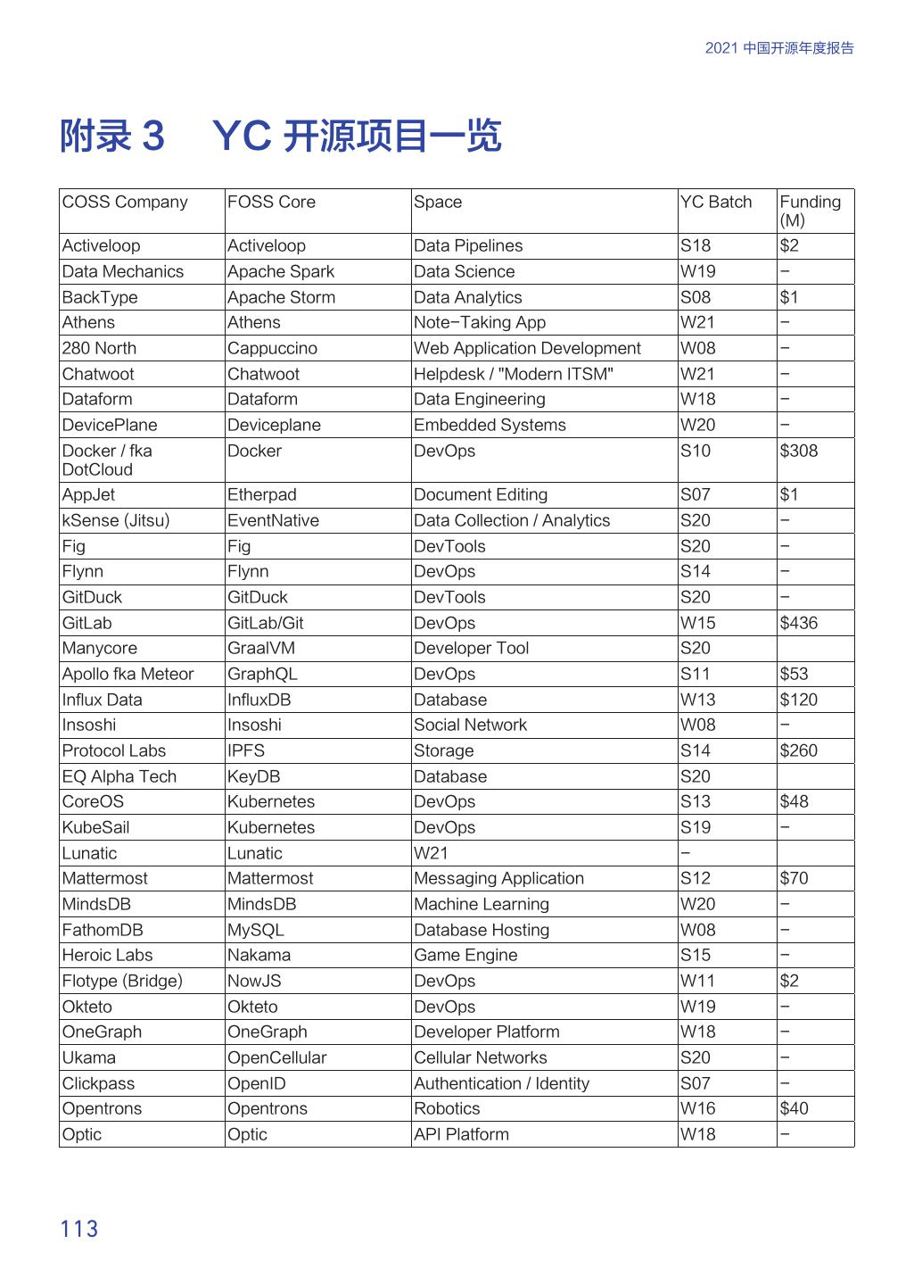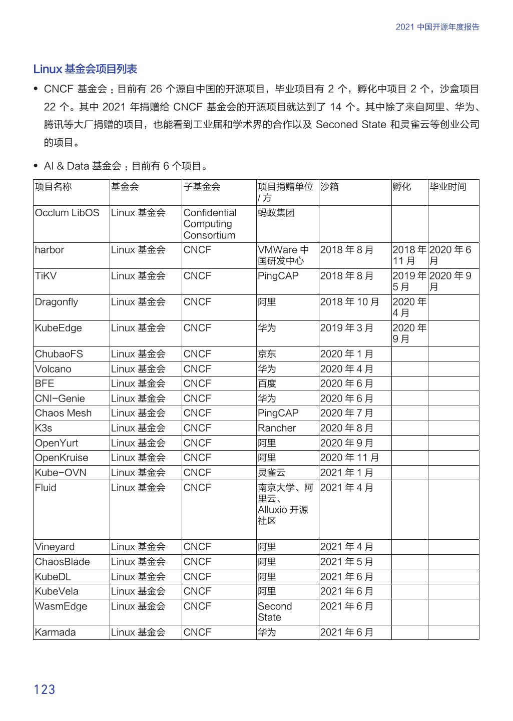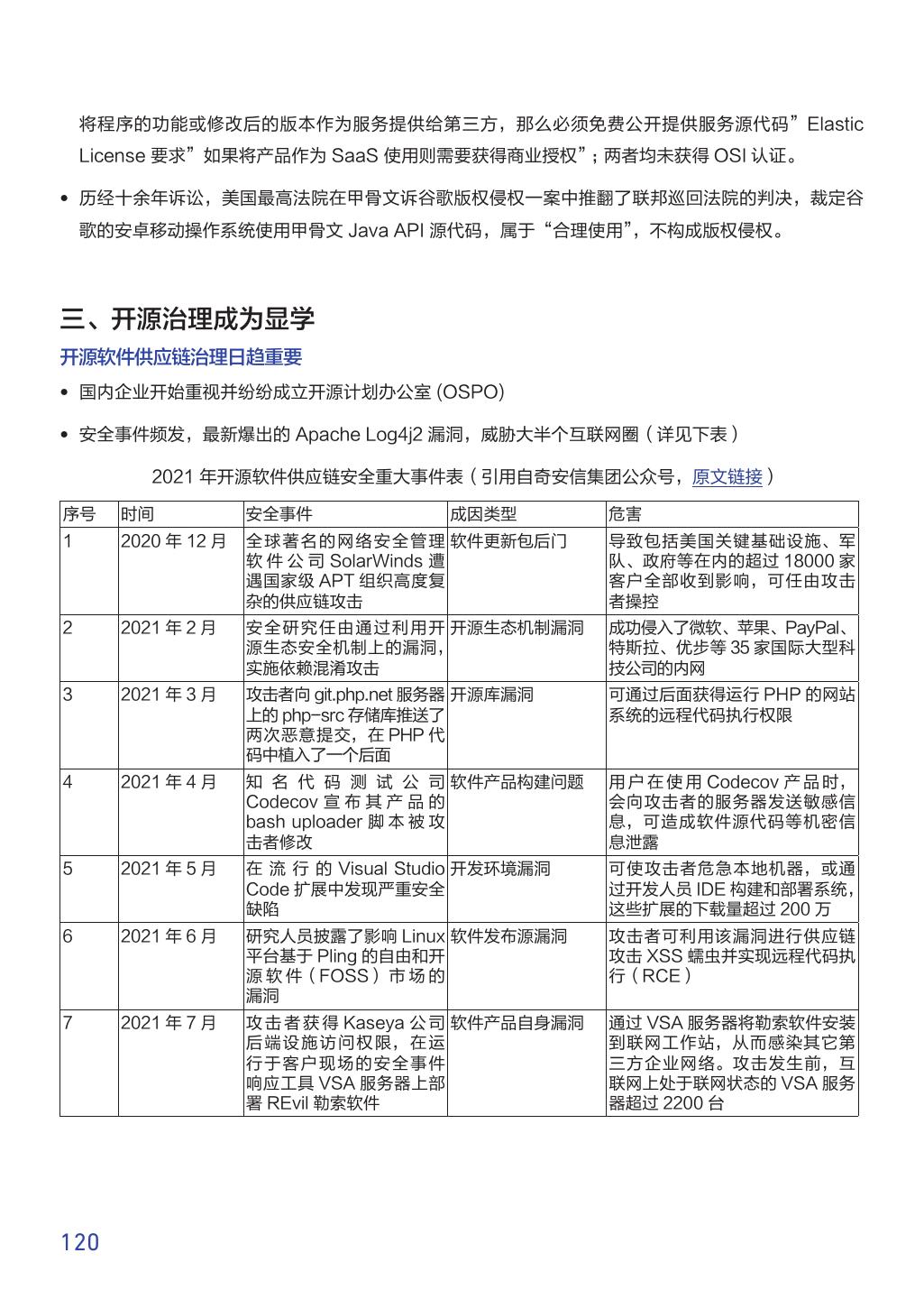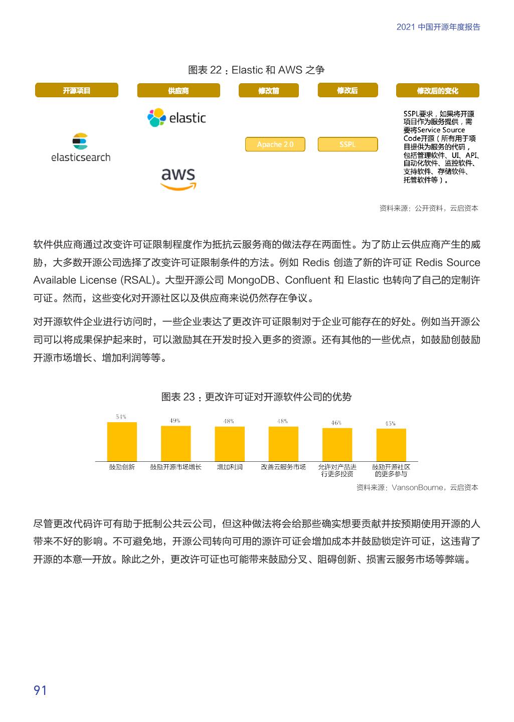 7 . 2021 中国开源年度报告 附录 1 开源硬件 v.s. 开源软件… ………………………………………………………… 111 附录 2 美国开源资本市场情况……………………………………………………………… 111 附录 3 YC 开源项目一览…………………………………………………………………… 113 2021 开源大事记…………………………………………………………… 115 摘要……………………………………………………………………………………………… 116 一、各国开源政策将对开源世界的未来产生重大影响…………………………………………………… 116 二、开源法务合规趋势 :意识增强,道阻且长…………………………………………………………… 116 三、开源治理成为显学……………………………………………………………………………………… 116 四、国际基金会的左右博弈 :RMS 重回自由软件基金会与 Rust 社区争议… ……………………… 116 五、中国开源走向世界,塑造新时代影响力……………………………………………………………… 117 六、开源新创投资持续发光发热…………………………………………………………………………… 117 七、开源操作系统迎来新一轮繁荣期……………………………………………………………………… 117 八、Rust 迈上新征程… …………………………………………………………………………………… 117 九、AI & 低代码将会如何改变开源,值得关注… ……………………………………………………… 117 十、开源硬件持续升温,RISC-V 成果涌现… ………………………………………………………… 118 全文……………………………………………………………………………………………… 118 一、各国开源政策将对开源世界的未来产生重大影响…………………………………………………… 118 二、开源法务合规趋势 :意识增强,道阻且长…………………………………………………………… 119 三、开源治理成为显学……………………………………………………………………………………… 120 四、国际基金会的左右博弈 :RMS 重回自由软件基金会与 Rust 社区争议… ……………………… 121 五、中国开源走向世界,塑造新时代影响力……………………………………………………………… 122 六、开源新创投资持续发光发热…………………………………………………………………………… 126 七、开源操作系统迎来新一轮繁荣期……………………………………………………………………… 127 八、Rust 迈上新征程… …………………………………………………………………………………… 128 九、AI & 低代码将会如何改变开源,值得关注… ……………………………………………………… 129 十、开源硬件持续升温,RISC-V 成果涌现… ………………………………………………………… 130 7