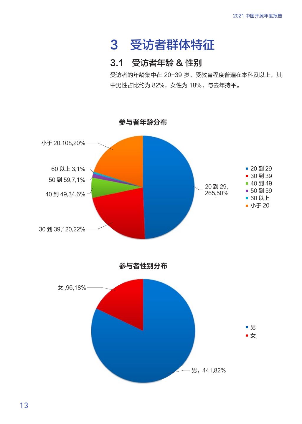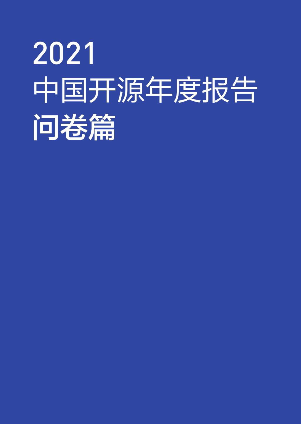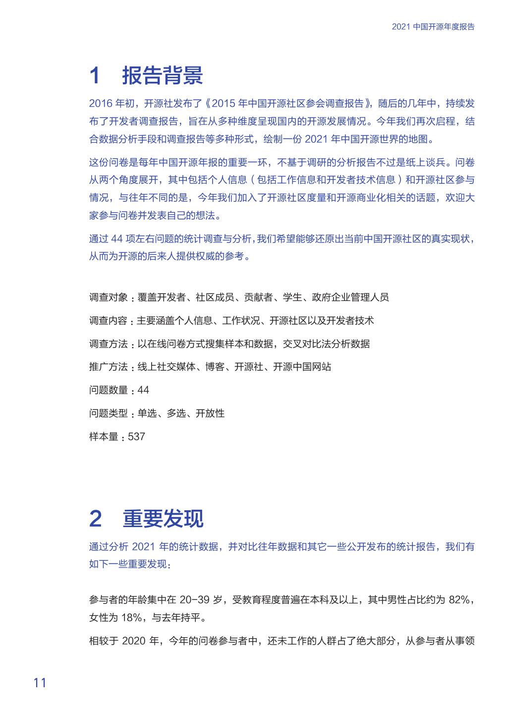11 . 2021 中国开源年度报告 1 报告背景 2016 年初,开源社发布了《2015 年中国开源社区参会调查报告》,随后的几年中,持续发 布了开发者调查报告,旨在从多种维度呈现国内的开源发展情况。今年我们再次启程,结 合数据分析手段和调查报告等多种形式,绘制一份 2021 年中国开源世界的地图。 这份问卷是每年中国开源年报的重要一环,不基于调研的分析报告不过是纸上谈兵。问卷 从两个角度展开,其中包括个人信息(包括工作信息和开发者技术信息)和开源社区参与 情况,与往年不同的是,今年我们加入了开源社区度量和开源商业化相关的话题,欢迎大 家参与问卷并发表自己的想法。 通过 44 项左右问题的统计调查与分析,我们希望能够还原出当前中国开源社区的真实现状, 从而为开源的后来人提供权威的参考。 调查对象 :覆盖开发者、社区成员、贡献者、学生、政府企业管理人员 调查内容 :主要涵盖个人信息、工作状况、开源社区以及开发者技术 调查方法 :以在线问卷方式搜集样本和数据,交叉对比法分析数据 推广方法 :线上社交媒体、博客、开源社、开源中国网站 问题数量 :44 问题类型 :单选、多选、开放性 样本量 :537 2 重要发现 通过分析 2021 年的统计数据,并对比往年数据和其它一些公开发布的统计报告,我们有 如下一些重要发现: 参与者的年龄集中在 20-39 岁,受教育程度普遍在本科及以上,其中男性占比约为 82%, 女性为 18%,与去年持平。 相较于 2020 年,今年的问卷参与者中,还未工作的人群占了绝大部分,从参与者从事领 11