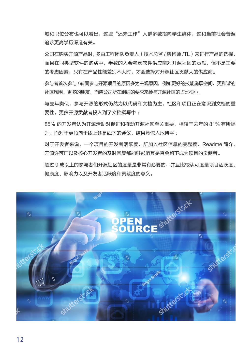 12 . 域和职位分布也可以看出,这些“还未工作”人群多数指向学生群体,这和当前社会普遍 追求更高学历深造有关。 公司在购买开源产品时,多由工程团队负责人(技术总监 / 架构师 /TL)来进行产品的选择, 而且在同类型软件的购买中,半数的人会考虑软件供应商对开源社区的贡献,但不是主要 的考虑因素,只有在产品性能差别不大时,才会选择对开源社区贡献大的供应商。 参与者首次参与 / 转而参与开源项目的原因多为主观原因,例如更好的技能施展空间、更和谐的 社区氛围、更多的朋友,而应公司所在组织的要求来参与开源社区的占比很小。 与去年类似,参与开源的形式仍然为以代码和文档为主,社区和项目正在意识到文档的重 要性,更多开源贡献者投入到了文档撰写中 ; 85% 的开发者认为开源活动对促进和推动开源社区至关重要,相较于去年的 81% 有所提 升。而对于更倾向于线上还是线下的会议,结果竟惊人地持平 ; 对于开发者来说,一个项目的开发者活跃度、所加入社区信息的完整度、Readme 简介、 开源许可证以及核心开发者的及时回复都能够影响其是否会留下成为项目的贡献者。 超过 9 成以上的参与者们开源社区的度量是非常有必要的,并且比较认可度量项目活跃度、 健康度、影响力以及开发者活跃度和贡献度的意义。 12