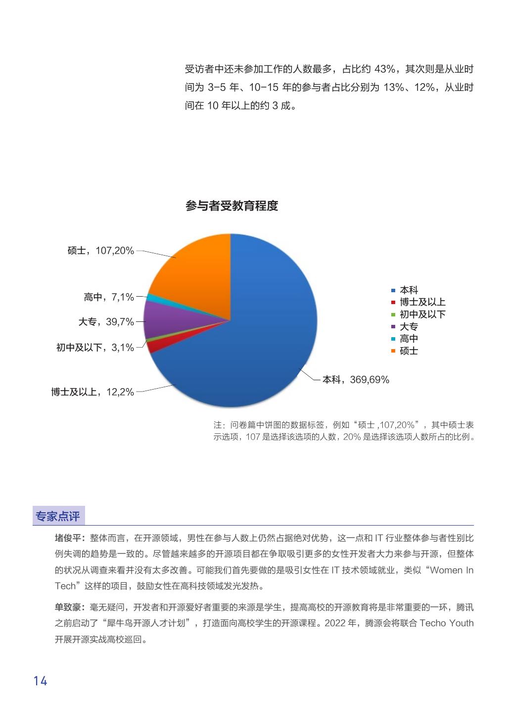 14 . 受访者中还未参加工作的人数最多,占比约 43%,其次则是从业时 间为 3-5 年、10-15 年的参与者占比分别为 13%、12%,从业时 间在 10 年以上的约 3 成。 参与者受教育程度 硕士,107,20% 本科 高中,7,1% 博士及以上 初中及以下 大专,39,7% 大专 高中 初中及以下,3,1% 硕士 本科,369,69% 博士及以上,12,2% 注:问卷篇中饼图的数据标签,例如“硕士 ,107,20%”,其中硕士表 示选项,107 是选择该选项的人数,20% 是选择该选项人数所占的比例。 专家点评 堵俊平:整体而言,在开源领域,男性在参与人数上仍然占据绝对优势,这一点和 IT 行业整体参与者性别比 例失调的趋势是一致的。尽管越来越多的开源项目都在争取吸引更多的女性开发者大力来参与开源,但整体 的状况从调查来看并没有太多改善。可能我们首先要做的是吸引女性在 IT 技术领域就业,类似“Women In Tech”这样的项目,鼓励女性在高科技领域发光发热。 单致豪:毫无疑问,开发者和开源爱好者重要的来源是学生,提高高校的开源教育将是非常重要的一环,腾讯 之前启动了“犀牛鸟开源人才计划”,打造面向高校学生的开源课程。2022 年,腾源会将联合 Techo Youth 开展开源实战高校巡回。 14