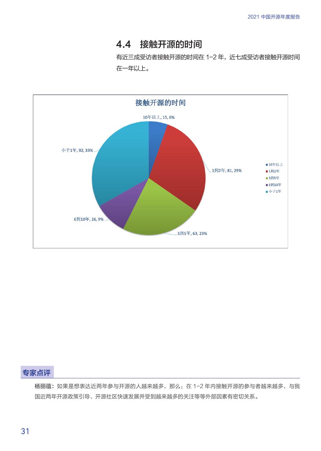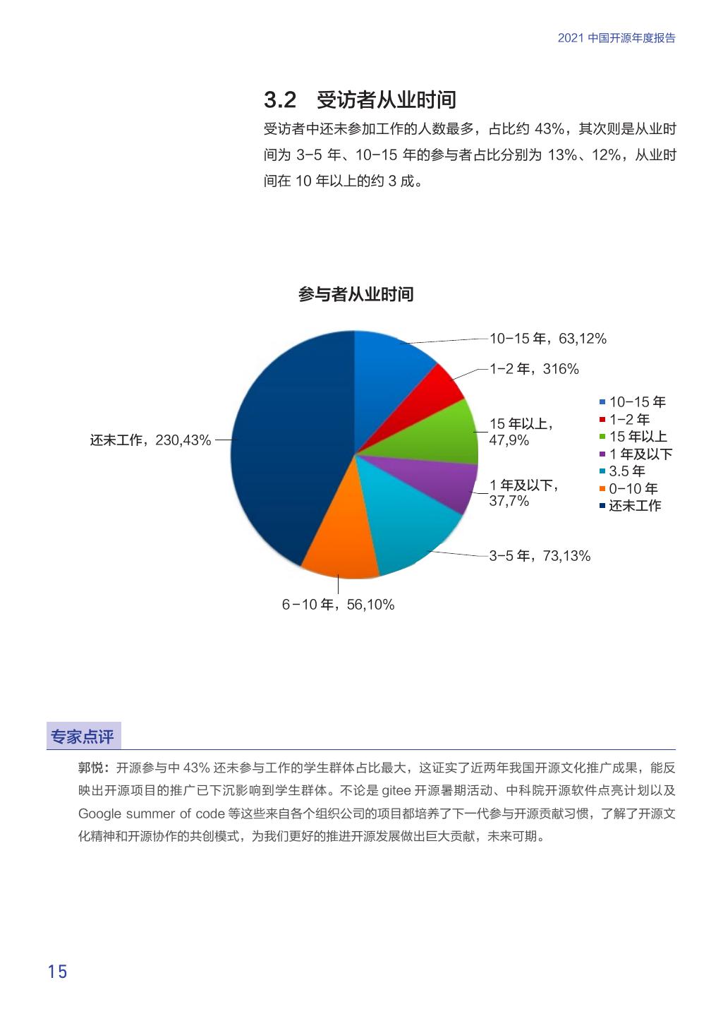 15 . 2021 中国开源年度报告 3.2 受访者从业时间 受访者中还未参加工作的人数最多,占比约 43%,其次则是从业时 间为 3-5 年、10-15 年的参与者占比分别为 13%、12%,从业时 间在 10 年以上的约 3 成。 参与者从业时间 10-15 年,63,12% 1-2 年,316% 10-15 年 15 年以上, 1-2 年 还未工作,230,43% 47,9% 15 年以上 1 年及以下 3.5 年 1 年及以下, 0-10 年 37,7% 还未工作 3-5 年,73,13% 6-10 年,56,10% 专家点评 郭悦:开源参与中 43% 还未参与工作的学生群体占比最大,这证实了近两年我国开源文化推广成果,能反 映出开源项目的推广已下沉影响到学生群体。不论是 gitee 开源暑期活动、中科院开源软件点亮计划以及 Google summer of code 等这些来自各个组织公司的项目都培养了下一代参与开源贡献习惯,了解了开源文 化精神和开源协作的共创模式,为我们更好的推进开源发展做出巨大贡献,未来可期。 15