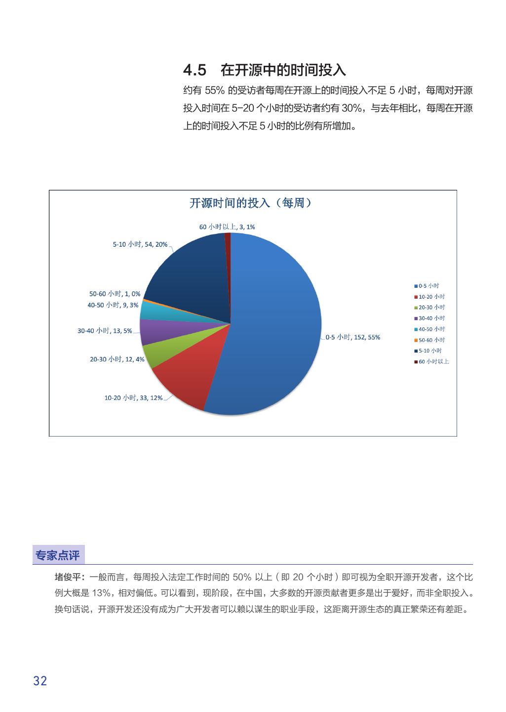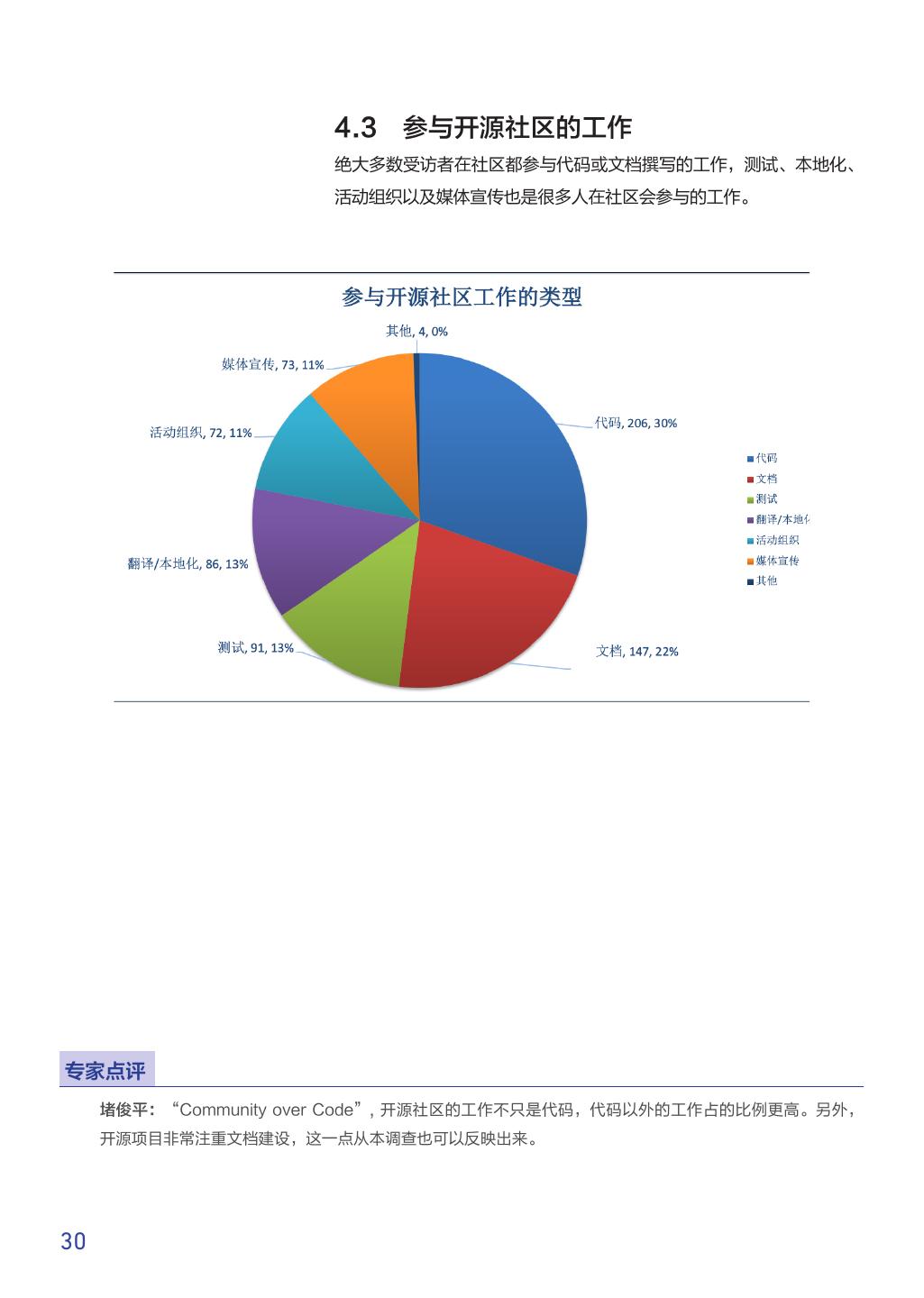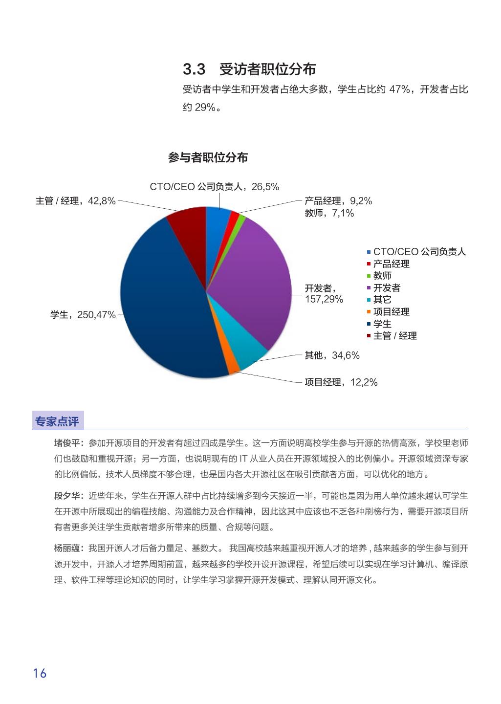 16 . 3.3 受访者职位分布 受访者中学生和开发者占绝大多数,学生占比约 47%,开发者占比 约 29%。 参与者职位分布 CTO/CEO 公司负责人,26,5% 主管 / 经理,42,8% 产品经理,9,2% 教师,7,1% CTO/CEO 公司负责人 产品经理 教师 开发者, 开发者 157,29% 其它 学生,250,47% 项目经理 学生 主管 / 经理 其他,34,6% 项目经理,12,2% 专家点评 堵俊平:参加开源项目的开发者有超过四成是学生。这一方面说明高校学生参与开源的热情高涨,学校里老师 们也鼓励和重视开源;另一方面,也说明现有的 IT 从业人员在开源领域投入的比例偏小。开源领域资深专家 的比例偏低,技术人员梯度不够合理,也是国内各大开源社区在吸引贡献者方面,可以优化的地方。 段夕华:近些年来,学生在开源人群中占比持续增多到今天接近一半,可能也是因为用人单位越来越认可学生 在开源中所展现出的编程技能、沟通能力及合作精神,因此这其中应该也不乏各种刷榜行为,需要开源项目所 有者更多关注学生贡献者增多所带来的质量、合规等问题。 杨丽蕴:我国开源人才后备力量足、基数大。 我国高校越来越重视开源人才的培养 , 越来越多的学生参与到开 源开发中,开源人才培养周期前置,越来越多的学校开设开源课程,希望后续可以实现在学习计算机、编译原 理、软件工程等理论知识的同时,让学生学习掌握开源开发模式、理解认同开源文化。 16