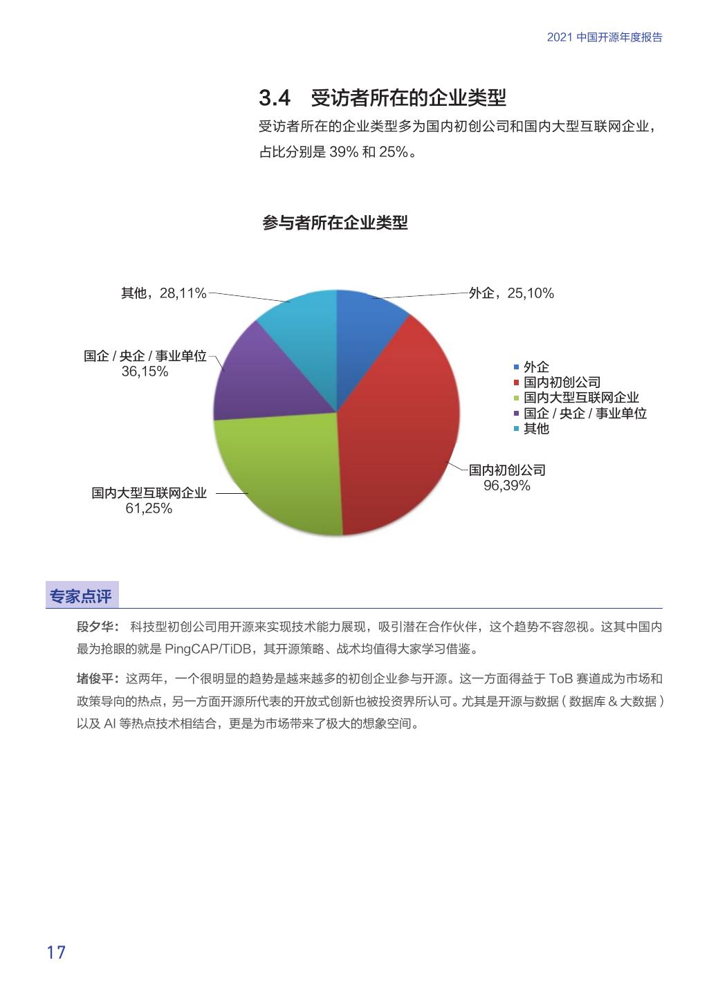 17 . 2021 中国开源年度报告 3.4 受访者所在的企业类型 受访者所在的企业类型多为国内初创公司和国内大型互联网企业, 占比分别是 39% 和 25%。 参与者所在企业类型 其他,28,11% 外企,25,10% 国企 / 央企 / 事业单位 36,15% 外企 国内初创公司 国内大型互联网企业 国企 / 央企 / 事业单位 其他 国内初创公司 96,39% 国内大型互联网企业 61,25% 专家点评 段夕华: 科技型初创公司用开源来实现技术能力展现,吸引潜在合作伙伴,这个趋势不容忽视。这其中国内 最为抢眼的就是 PingCAP/TiDB,其开源策略、战术均值得大家学习借鉴。 堵俊平:这两年,一个很明显的趋势是越来越多的初创企业参与开源。这一方面得益于 ToB 赛道成为市场和 政策导向的热点,另一方面开源所代表的开放式创新也被投资界所认可。尤其是开源与数据(数据库 & 大数据) 以及 AI 等热点技术相结合,更是为市场带来了极大的想象空间。 17