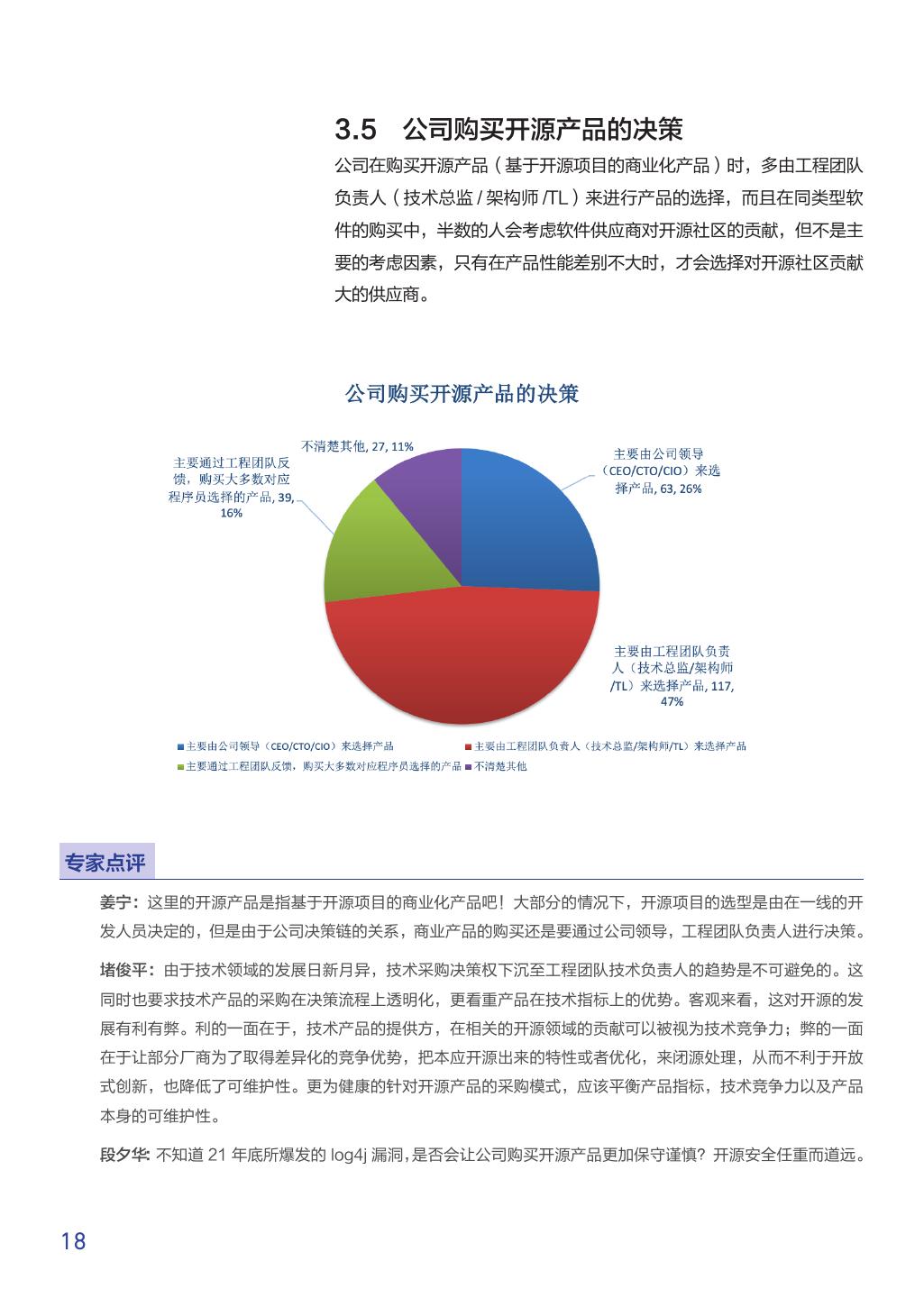 18 . 3.5 公司购买开源产品的决策 公司在购买开源产品(基于开源项目的商业化产品)时,多由工程团队 负责人(技术总监 / 架构师 /TL)来进行产品的选择,而且在同类型软 件的购买中,半数的人会考虑软件供应商对开源社区的贡献,但不是主 要的考虑因素,只有在产品性能差别不大时,才会选择对开源社区贡献 大的供应商。 专家点评 姜宁:这里的开源产品是指基于开源项目的商业化产品吧!大部分的情况下,开源项目的选型是由在一线的开 发人员决定的,但是由于公司决策链的关系,商业产品的购买还是要通过公司领导,工程团队负责人进行决策。 堵俊平:由于技术领域的发展日新月异,技术采购决策权下沉至工程团队技术负责人的趋势是不可避免的。这 同时也要求技术产品的采购在决策流程上透明化,更看重产品在技术指标上的优势。客观来看,这对开源的发 展有利有弊。利的一面在于,技术产品的提供方,在相关的开源领域的贡献可以被视为技术竞争力;弊的一面 在于让部分厂商为了取得差异化的竞争优势,把本应开源出来的特性或者优化,来闭源处理,从而不利于开放 式创新,也降低了可维护性。更为健康的针对开源产品的采购模式,应该平衡产品指标,技术竞争力以及产品 本身的可维护性。 段夕华:不知道 21 年底所爆发的 log4j 漏洞,是否会让公司购买开源产品更加保守谨慎?开源安全任重而道远。 18